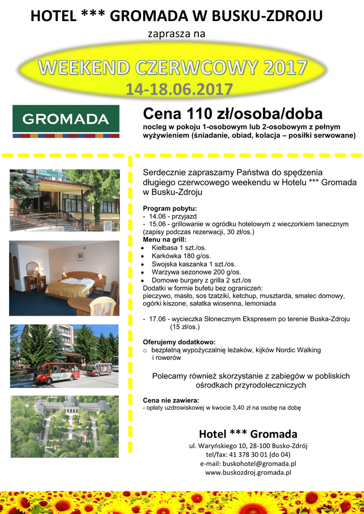 HOTEL *** GROMADA W BUSKU-ZDROJU zaprasza na 14-18.06.2017 Cena 110 zł/osoba/doba nocleg w pokoju 1-osobowym lub 2-osobowym z pełnym wyżywieniem (śniadanie, obiad, kolacja – posiłki serwowane) Serdecznie zapraszamy Państwa do spędzenia długiego czerwcowego weekendu w Hotelu *** Gromada w Busku-Zdroju Program pobytu: - 14.06 - przyjazd - 15.06 - grillowanie w ogródku hotelowym z wieczorkiem tanecznym (zapisy podczas rezerwacji, 30 zł/os.) Menu na grill: Kiełbasa 1 szt./os. Karkówka 180 g/os. Swojska kaszanka 1 szt./os. Warzywa sezonowe 200 g/os. Domowe burgery z grilla 2 szt./os Dodatki w formie bufetu bez ograniczeń: pieczywo, masło, sos tzatziki, ketchup, musztarda, smalec domowy, ogórki kiszone, sałatka wiosenna, lemoniada - 17.06 - wycieczka Słonecznym Ekspresem po terenie Buska-Zdroju (15 zł/os.) Oferujemy dodatkowo: o bezpłatną wypożyczalnię leżaków, kijków Nordic Walking i rowerów Polecamy również skorzystanie z zabiegów w pobliskich ośrodkach przyrodoleczniczych Cena nie zawiera: - opłaty uzdrowiskowej w kwocie 3,40 zł na osobę na dobę Hotel *** Gromada ul. Waryńskiego 10, 28-100 Busko-Zdrój tel/fax: 41 378 30 01 (do 04) e-mail: [email protected] www.buskozdroj.gromada.pl