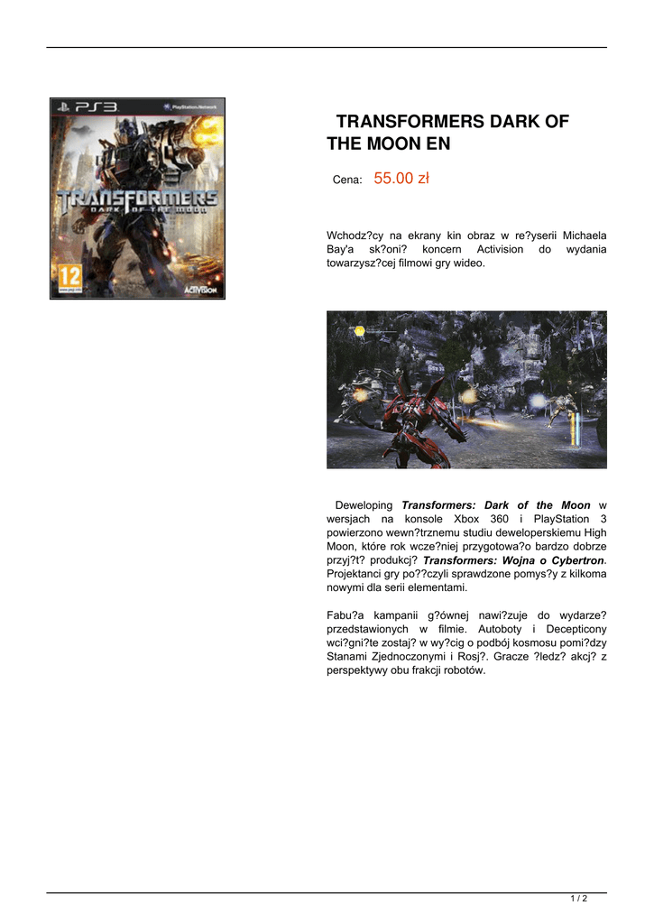 TRANSFORMERS DARK OF THE MOON EN Cena: 55.00 zł Wchodz?cy na ekrany kin obraz w re?yserii Michaela Bay'a sk?oni? koncern Activision do wydania towarzysz?cej filmowi gry wideo. Deweloping Transformers: Dark of the Moon w wersjach na konsole Xbox 360 i PlayStation 3 powierzono wewn?trznemu studiu deweloperskiemu High Moon, które rok wcze?niej przygotowa?o bardzo dobrze przyj?t? produkcj? Transformers: Wojna o Cybertron. Projektanci gry po??czyli sprawdzone pomys?y z kilkoma nowymi dla serii elementami. Fabu?a kampanii g?ównej nawi?zuje do wydarze? przedstawionych w filmie. Autoboty i Decepticony wci?gni?te zostaj? w wy?cig o podbój kosmosu pomi?dzy Stanami Zjednoczonymi i Rosj?. Gracze ?ledz? akcj? z perspektywy obu frakcji robotów. 1/2 W?ród nowo?ci w rozgrywce na pierwszy plan wysuwa si? opcja trzystopniowej transformacji. Roboty mog? zmienia? si? w pojazdy tak?e w opancerzonej wersji (stealth force). ??czy ona zalety mobilno?ci i du?ej si?y ognia. Zobacz wideo: Szczegóły wersja językowa ANGIELSKA 2/2 Powered by TCPDF (www.tcpdf.org)