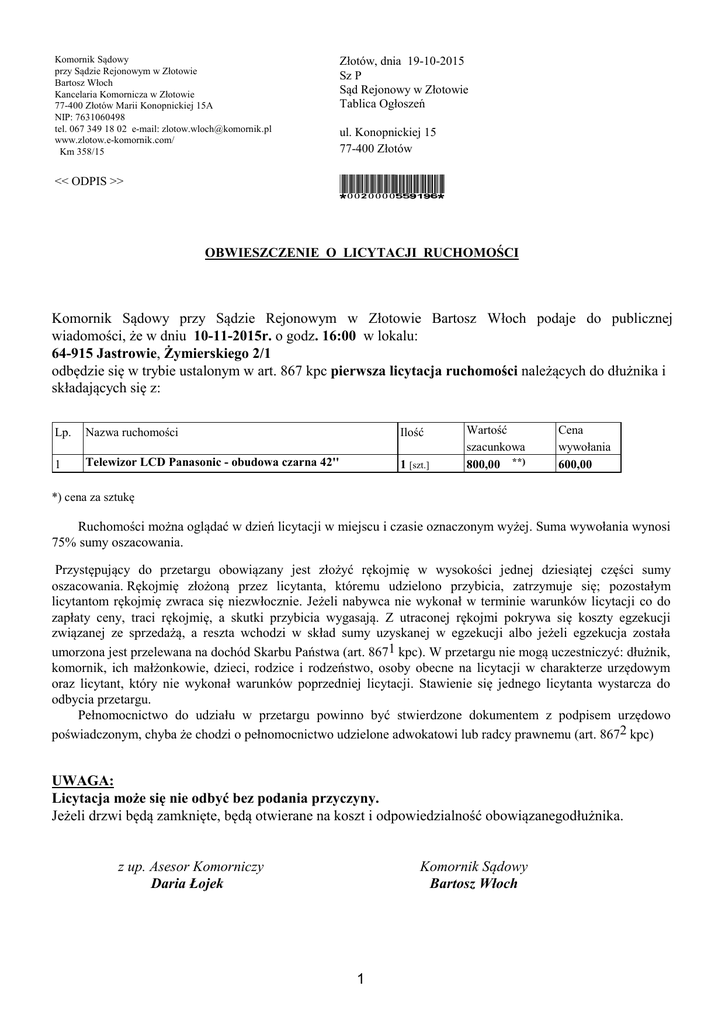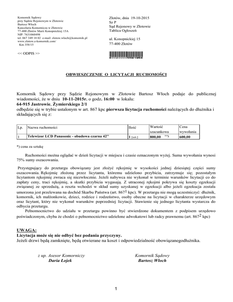 Komornik Sądowy przy Sądzie Rejonowym w Złotowie Bartosz Włoch Kancelaria Komornicza w Złotowie 77-400 Złotów Marii Konopnickiej 15A NIP: 7631060498 tel. 067 349 18 02 e-mail: [email protected] www.zlotow.e-komornik.com/ Km 358/15 Złotów, dnia 19-10-2015 Sz P Sąd Rejonowy w Złotowie Tablica Ogłoszeń << ODPIS >> *0020000559196* ul. Konopnickiej 15 77-400 Złotów OBWIESZCZENIE O LICYTACJI RUCHOMOŚCI Komornik Sądowy przy Sądzie Rejonowym w Złotowie Bartosz Włoch podaje do publicznej wiadomości, że w dniu 10-11-2015r. o godz. 16:00 w lokalu: 64-915 Jastrowie, Żymierskiego 2/1 odbędzie się w trybie ustalonym w art. 867 kpc pierwsza licytacja ruchomości należących do dłużnika i składających się z: Lp. Nazwa ruchomości Ilość 1 Telewizor LCD Panasonic - obudowa czarna 42'' 1 [szt.] Wartość szacunkowa 800,00 **) Cena wywołania 600,00 *) cena za sztukę Ruchomości można oglądać w dzień licytacji w miejscu i czasie oznaczonym wyżej. Suma wywołania wynosi 75% sumy oszacowania. Przystępujący do przetargu obowiązany jest złożyć rękojmię w wysokości jednej dziesiątej części sumy oszacowania. Rękojmię złożoną przez licytanta, któremu udzielono przybicia, zatrzymuje się; pozostałym licytantom rękojmię zwraca się niezwłocznie. Jeżeli nabywca nie wykonał w terminie warunków licytacji co do zapłaty ceny, traci rękojmię, a skutki przybicia wygasają. Z utraconej rękojmi pokrywa się koszty egzekucji związanej ze sprzedażą, a reszta wchodzi w skład sumy uzyskanej w egzekucji albo jeżeli egzekucja została umorzona jest przelewana na dochód Skarbu Państwa (art. 8671 kpc). W przetargu nie mogą uczestniczyć: dłużnik, komornik, ich małżonkowie, dzieci, rodzice i rodzeństwo, osoby obecne na licytacji w charakterze urzędowym oraz licytant, który nie wykonał warunków poprzedniej licytacji. Stawienie się jednego licytanta wystarcza do odbycia przetargu. Pełnomocnictwo do udziału w przetargu powinno być stwierdzone dokumentem z podpisem urzędowo poświadczonym, chyba że chodzi o pełnomocnictwo udzielone adwokatowi lub radcy prawnemu (art. 8672 kpc) UWAGA: Licytacja może się nie odbyć bez podania przyczyny. Jeżeli drzwi będą zamknięte, będą otwierane na koszt i odpowiedzialność obowiązanegodłużnika. z up. Asesor Komorniczy Daria Łojek Komornik Sądowy Bartosz Włoch 1 2