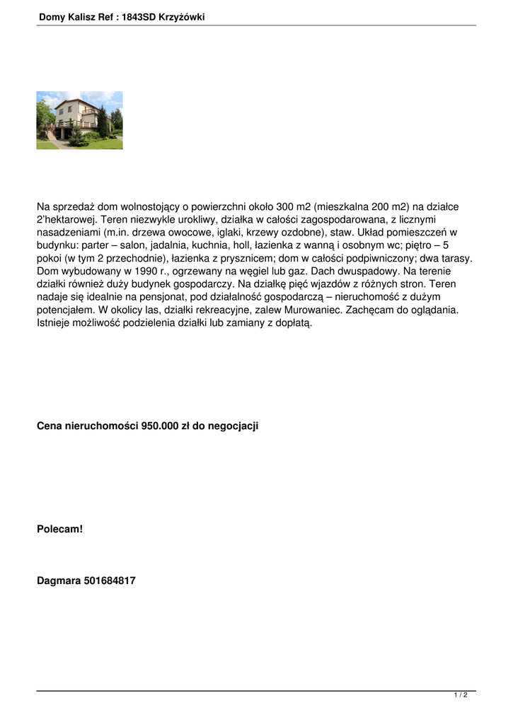 Domy Kalisz Ref : 1843SD Krzyżówki Na sprzedaż dom wolnostojący o powierzchni około 300 m2 (mieszkalna 200 m2) na działce 2’hektarowej. Teren niezwykle urokliwy, działka w całości zagospodarowana, z licznymi nasadzeniami (m.in. drzewa owocowe, iglaki, krzewy ozdobne), staw. Układ pomieszczeń w budynku: parter – salon, jadalnia, kuchnia, holl, łazienka z wanną i osobnym wc; piętro – 5 pokoi (w tym 2 przechodnie), łazienka z prysznicem; dom w całości podpiwniczony; dwa tarasy. Dom wybudowany w 1990 r., ogrzewany na węgiel lub gaz. Dach dwuspadowy. Na terenie działki również duży budynek gospodarczy. Na działkę pięć wjazdów z różnych stron. Teren nadaje się idealnie na pensjonat, pod działalność gospodarczą – nieruchomość z dużym potencjałem. W okolicy las, działki rekreacyjne, zalew Murowaniec. Zachęcam do oglądania. Istnieje możliwość podzielenia działki lub zamiany z dopłatą. Cena nieruchomości 950.000 zł do negocjacji Polecam! Dagmara 501684817 1/2 Domy Kalisz Ref : 1843SD Krzyżówki Licencja zawodowa 17060 - Dagmara Jeżyk. Powyższy opis ma charakter informacyjny i nie stanowi oferty w rozumieniu przepisów Kodeksu Cywilnego. Cena : 950 000 zł Czynsz : Skonsultuj się z nami Opłaty : Skonsultuj się z nami Pow. użytkowa : 300 m² Pow. działki : 20000 m² Liczba pokoi : 6 Liczba pięter : 2 Liczba łazienek : 2 Ogrzewanie : Węglowe Adres : Krzyżówki okolice Kalisza, 62-800 KALISZ http://www.destino.org.pl/index.php?option=com_jea&view=properties&Itemid=4&id=1799 2/2