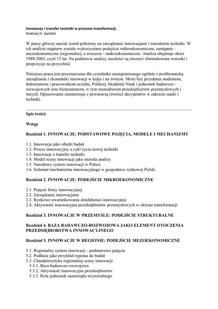 Innowacje i transfer techniki w procesie transformacji. Andrzej H. Jasiński W pracy główny nacisk został położony na zarządzanie innowacjami i transferem techniki. W ich analizie najpierw zostało wykorzystane podejście mikroekonomiczne, następnie mezoekonomiczne (regionalne), a wreszcie - makroekonomiczne. Analiza obejmuje okres 1989-2003, czyli 15 lat. Na podstawie analizy zaszłości są również sformułowane wnioski i propozycje na przyszłość. Niniejsza praca jest przeznaczona dla czytelnika zaznajomionego ogólnie z problematyką zarządzania i ekonomiki innowacji w kraju i na świecie. Może być przydatna studentom, doktorantom i pracownikom uczelni, Polskiej Akademii Nauk i jednostek badawczo rozwojowych oraz biznesmenom, w tym menedżerom przedsiębiorstw przemysłowych i innych. Opracowanie zainteresuje z pewnością również decydentów w zakresie nauki i techniki. Spis treści: Wstęp Rozdział 1. INNOWACJE: PODSTAWOWE POJĘCIA, MODELE I MECHANIZMY 1.1. Innowacja jako obiekt badań 1.2. Proces innowacyjny a cykl życia nowej techniki 1.3. Innowacje a transfer techniki 1.4. Model sceny innowacji jako metoda analizy 1.5. Narodowy system innowacji w Polsce 1.6. Schemat mechanizmu innowacyjnego w gospodarce rynkowej Polski Rozdział 2. INNOWACJE: PODEJŚCIE MIKROEKONOMICZNE 2.1. Pojęcie firmy innowacyjnej 2.2. Zarządzanie innowacjami 2.3. Rynkowe uwarunkowania działalności innowacyjnej 2.4. Aktywność innowacyjna przedsiębiorstw przemysłowych w okresie transformacji Rozdział 3. INNOWACJE W PRZEMYŚLE: PODEJŚCIE STRUKTURALNE Rozdział 4. BAZA BADAWCZO-ROZWOJOWA JAKO ELEMENT OTOCZENIA PRZEDSIĘBIORSTWA INNOWACYJNEGO Rozdział 5. INNOWACJE W REGIONIE: PODEJŚCIE MEZOEKONOMICZNE 5.1. Regionalny system innowacji - podstawowe pojęcia 5.2. Podlasie jako przykład regionu do badań 5.3. Charakterystyka regionalnej sceny innowacji 5.3.1. Baza badawczo-rozwojowa 5.3.2. Aktywność innowacyjna przedsiębiorstw 5.3.3. Rola jednostek samorządu terytorialnego 5.3.4. Instytucje wsparcia działalności innowacyjnej 5.4. Strategia innowacyjna i regionalny system innowacji Rozdział 6. INNOWACJE A KRAJOWY TRANSFER TECHNIKI 6.1. Diagnoza stanu procesów transferu techniki 6.2. Główne bariery transferu techniki 6.2.1. Bariery transferu techniki wśród małych i średnich przedsiębiorstw 6.2.2. Bariery transferu techniki wśród dużych i wielkich przedsiębiorstw 6.2.3. Bariery i postulaty przedsiębiorstw (łącznie) 6.2.4. Bariery transferu techniki według ekspertów krajowych 6.2.5. Dyskusja wyników 6.2.6. Generalne wnioski 6.3. Propozycje sposobów usuwania barier 6.3.1. Propozycje pod adresem przedsiębiorstw 6.3.2. Propozycje pod adresem jednostek sektora B+R 6.3.3. Propozycje pod adresem państwa Rozdział 7. JEDNOSTKI INFRASTRUKTURY TRANSFERU TECHNIKI JAKO AKTORZY NA SCENIE INNOWACJI 7.1. Dotychczasowy rozwój infrastruktury transferu techniki 7.2. Panorama jednostek infrastruktury transferu techniki 7.2.1. Parki naukowo-technologiczne 7.2.2. Instytucje pomostowe 7.2.3. Firmy odpryskowe 7.3. Jednostki infrastuktury transferu techniki w świetle wyników ankiety internetowej Rozdział 8. INNOWACJE: PODEJŚCIE MAKROEKONOMICZNE 8.1. Innowacyjność polskiej gospodarki - całościowy obraz zmian 8.2. Innowacje a rozwój gospodarki 8.3. Innowacje a polityka innowacyjna państwa 8.4. Generalne wnioski, podstawowe zależności 8.5. Zalecenia pod adresem polityki innowacyjnej Zakończenie: POWRÓT NA SCENĘ INNOWACJI STUDIA PRZYPADKÓW 1. MAVIT: Udane wejście na rynek usług 2. Polska Platforma Technologiczna Opto-i Nano-elektroniki: Prekursorska inicjatywa 3. Zaginarka i suwnica: Nowości na rynku przemysłowym 4. Specodlew: Udany odprysk z placówki naukowej 5. BioStar Plus: Cierpienia wynalazców na rynku 6. Wrocławskie Centrum Transferu Technologii: Godne naśladowania 7. NOT jako promotor postępu technicznego w małych i średnich przedsiębiorstwach Aneksy Bibliografia