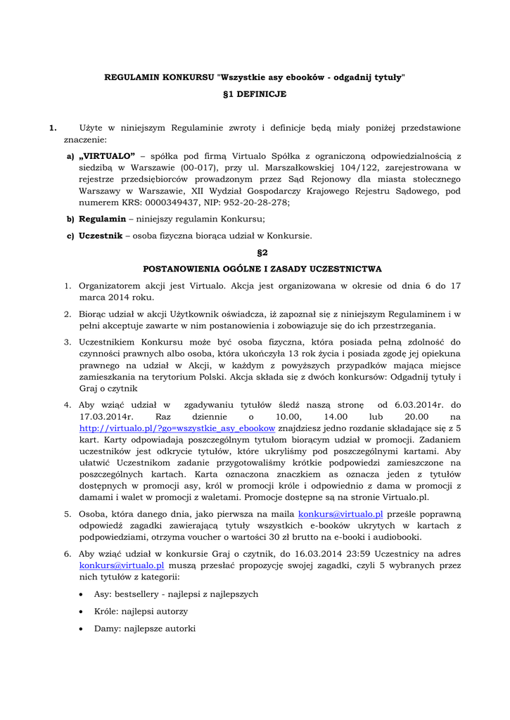 REGULAMIN KONKURSU "Wszystkie asy ebooków - odgadnij tytuły" §1 DEFINICJE 1. Użyte w niniejszym Regulaminie zwroty i definicje będą miały poniżej przedstawione znaczenie: a) „VIRTUALO” – spółka pod firmą Virtualo Spółka z ograniczoną odpowiedzialnością z siedzibą w Warszawie (00-017), przy ul. Marszałkowskiej 104/122, zarejestrowana w rejestrze przedsiębiorców prowadzonym przez Sąd Rejonowy dla miasta stołecznego Warszawy w Warszawie, XII Wydział Gospodarczy Krajowego Rejestru Sądowego, pod numerem KRS: 0000349437, NIP: 952-20-28-278; b) Regulamin – niniejszy regulamin Konkursu; c) Uczestnik – osoba fizyczna biorąca udział w Konkursie. §2 POSTANOWIENIA OGÓLNE I ZASADY UCZESTNICTWA 1. Organizatorem akcji jest Virtualo. Akcja jest organizowana w okresie od dnia 6 do 17 marca 2014 roku. 2. Biorąc udział w akcji Użytkownik oświadcza, iż zapoznał się z niniejszym Regulaminem i w pełni akceptuje zawarte w nim postanowienia i zobowiązuje się do ich przestrzegania. 3. Uczestnikiem Konkursu może być osoba fizyczna, która posiada pełną zdolność do czynności prawnych albo osoba, która ukończyła 13 rok życia i posiada zgodę jej opiekuna prawnego na udział w Akcji, w każdym z powyższych przypadków mająca miejsce zamieszkania na terytorium Polski. Akcja składa się z dwóch konkursów: Odgadnij tytuły i Graj o czytnik 4. Aby wziąć udział w zgadywaniu tytułów śledź naszą stronę od 6.03.2014r. do 17.03.2014r. Raz dziennie o 10.00, 14.00 lub 20.00 na http://virtualo.pl/?go=wszystkie_asy_ebookow znajdziesz jedno rozdanie składające się z 5 kart. Karty odpowiadają poszczególnym tytułom biorącym udział w promocji. Zadaniem uczestników jest odkrycie tytułów, które ukryliśmy pod poszczególnymi kartami. Aby ułatwić Uczestnikom zadanie przygotowaliśmy krótkie podpowiedzi zamieszczone na poszczególnych kartach. Karta oznaczona znaczkiem as oznacza jeden z tytułów dostępnych w promocji asy, król w promocji króle i odpowiednio z dama w promocji z damami i walet w promocji z waletami. Promocje dostępne są na stronie Virtualo.pl. 5. Osoba, która danego dnia, jako pierwsza na maila [email protected] prześle poprawną odpowiedź zagadki zawierającą tytuły wszystkich e-booków ukrytych w kartach z podpowiedziami, otrzyma voucher o wartości 30 zł brutto na e-booki i audiobooki. 6. Aby wziąć udział w konkursie Graj o czytnik, do 16.03.2014 23:59 Uczestnicy na adres [email protected] muszą przesłać propozycję swojej zagadki, czyli 5 wybranych przez nich tytułów z kategorii: Asy: bestsellery - najlepsi z najlepszych Króle: najlepsi autorzy Damy: najlepsze autorki Walety: debiuty i nowości Tworząc swoją propozycję zagadki uczestnicy mogą wybierać tytuły ze wszystkich e-booków dostępnych na stronie: http://virtualo.pl/?pt=wszystkie_karty i zaznaczyć, które tytuły należą do kategorii asów, króli, dam i waletów. Do wybranych przez siebie tytułów Uczestnik powinien ułożyć krótkie podpowiedzi w formie haseł umożliwiających odgadnięcie, o jakie tytuły chodzi. 7. Rozgrywka, która zostanie przez jury uznana za najciekawszą, zostanie zaprezentowana 17.03.2014 w formie zagadki dla Uczestników w ramach odgadywania tytułów. Twórca najciekawszego układu otrzyma w nagrodę czytnik Kindle 5 Classic. 8. Aby móc zrealizować voucher, Uczestnik konkursu musi posiadać aktywne konto w księgarni Virtualo.pl (http://virtualo.pl). 9. Ze zwycięzcą skontaktujemy się w ciągu dwóch dni roboczych od chwili ogłoszenia wyników. 10. Aby otrzymać czytnik, Zwycięzca musi podać dane do wysyłki wraz z numerem telefonu. Virtualo nie odpowiada za brak dostarczenia czytnika wynikający z podania przez Zwycięzcę błędnych danych lub niewłaściwego numeru telefonu, które uniemożliwią dostarczenie czytnika. 11. Wartość nagród przyznawanych w konkursie: vouchery 360 zł brutto (pojedynczy voucher 30 zł brutto), czytnik Kindle 5 WiFi – 339,00 zł brutto. §3 POSTANOWIENIA KOŃCOWE 1. W sprawach nieuregulowanych Regulaminem zastosowanie maja stosowne przepisy prawa powszechne obowiązującego. 2. Niniejszy Konkurs nie stanowi gry losowej lub zakładu wzajemnego w rozumieniu ustawy z dnia 19 listopada 2009 r. o grach hazardowych i nie podlega zatwierdzeniu w trybie określonym w ustawie z 19 listopada 2009 r. o grach hazardowych (Dz. U. Nr 201, poz. 1504 ze zmianami). 3. Regulamin obowiązuje od dnia 6 marca 2014 r.