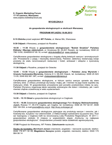 8. Organic Marketing Forum 17-19 czerwca, Warszawa www.organic-marketing-forum.org WYCIECZKA II: do gospodarstw ekologicznych w okolicach Warszawy PROGRAM WYJAZDU 19.06.2013 9:15 Zbiórka przed wejściem MT Polska, ul. Marsa 56c, Warszawa 9:30 Odjazd z Warszawy, przejazd do Rozalina 10:30 – 11:30 Wizyta w gospodarstwie ekologicznym "Bukiet Smaków" Państwa Elżbiety i Macieja Jabłońskich, ul. Grzybowa 36, 05-831 Rozalin, tel. kontaktowy: 0048 22 798 19 60, 0048509 87 85 18, e-mail: [email protected], www.rukola.pl Certyfikowane gospodarstwo ekologiczne z bogatą ofertą świeżych warzyw i aromatycznych ziół. Prowadzone z pasją i niezwykłą starannością. Państwo Jabłońscy dostarczają swoje produkty do wielu renomowanych restauracji i hoteli, ambasad i sklepów z żywnością ekologiczną. 11:30 Odjazd z Rozalina, przejazd do Osiecka 12:45 – 13:30 Wizyta w gospodarstwie ekologicznym – Państwo Jerzy Wyrwicki i Urszula Cackowska-Wyrwicka, Kolonia D 3, 08-445 Osieck, tel. kontaktowy: 0048 25 623 13 05, 0048 602 661 387, e-mail: [email protected] Certyfikowane gospodarstwo ekologiczne, w którym oprócz warzyw uprawia się stare odmiany zbóż. Z orkiszu produkuje się kaszę i mąkę, jak i również na jego bazie wypieka się tradycyjny chleb. W gospodarstwie prowadzone jest ponadto przetwórstwo mleka na sery. Państwo Wyrwiccy organizują także warsztaty edukacyjne dla dzieci i młodzieży, jak i sami również chętnie uczestniczą w wielu wydarzeniach. 13:30 Odjazd z Osiecka, przejazd do Cegłowa 14.30 – 15.15 Obiad w gospodarstwie ekologicznym w Cegłowie 15.15 – 16.00 Zwiedzanie gospodarstwa ekologicznego Pani Grażyny StelmachowskiejJuzoń, Rososz 17, 05-319 Cegłów, gm Cegłów, tel. kontaktowy: 0048 25 757 82 87, 0048 506 184 054, e-mail:[email protected], http://kozy.evikzegar.pl/ Certyfikowane gospodarstwo ekologiczne zajmujące się produkcją warzyw i owoców, jak i hodowlą kóz, kucyków i kur zielononóżek. Z mleka koziego wytwarzane są pyszne sery. Kozi ser twarogowy z Cegłowa trafił na renomowaną Listę Produktów Regionalnych. W 2011 r. gospodarstwo zdobyło III miejsce w wojewódzkim etapie „Konkursu na najlepsze gospodarstwo ekologiczne”. Gospodarstwo prowadzi także działalność agroturystyczną. 17:00 Przyjazd do Warszawy, MT Polska. Zakończenie wycieczki. Osoby do kontaktu: Bernhard Jansen (niemiecki, angielski) – kierownik wycieczki, telefon: 0049 179 671 34 48, Magdalena Saczyna (polski, angielski, niemiecki), telefon: 0049 175 964 98 14