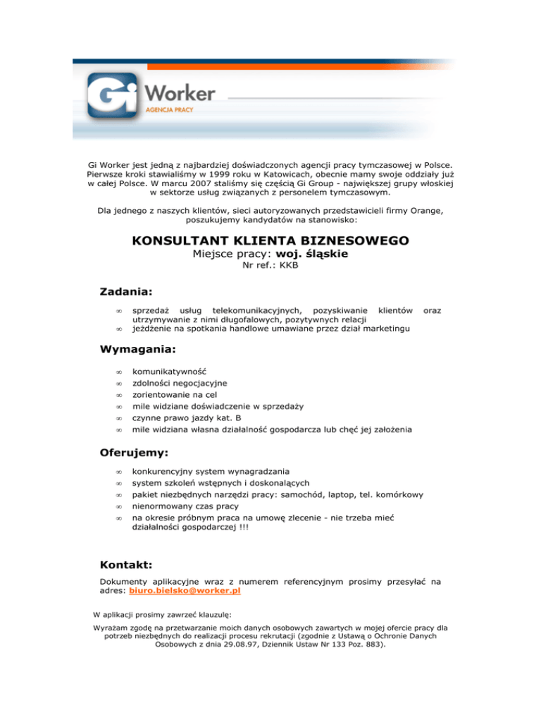 Gi Worker jest jedną z najbardziej doświadczonych agencji pracy tymczasowej w Polsce. Pierwsze kroki stawialiśmy w 1999 roku w Katowicach, obecnie mamy swoje oddziały juŜ w całej Polsce. W marcu 2007 staliśmy się częścią Gi Group - największej grupy włoskiej w sektorze usług związanych z personelem tymczasowym. Dla jednego z naszych klientów, sieci autoryzowanych przedstawicieli firmy Orange, poszukujemy kandydatów na stanowisko: KONSULTANT KLIENTA BIZNESOWEGO Miejsce pracy: woj. śląskie Nr ref.: KKB Zadania: • • sprzedaŜ usług telekomunikacyjnych, pozyskiwanie klientów utrzymywanie z nimi długofalowych, pozytywnych relacji jeŜdŜenie na spotkania handlowe umawiane przez dział marketingu oraz Wymagania: • komunikatywność • zdolności negocjacyjne • zorientowanie na cel • mile widziane doświadczenie w sprzedaŜy • czynne prawo jazdy kat. B • mile widziana własna działalność gospodarcza lub chęć jej załoŜenia Oferujemy: • konkurencyjny system wynagradzania • system szkoleń wstępnych i doskonalących • pakiet niezbędnych narzędzi pracy: samochód, laptop, tel. komórkowy • nienormowany czas pracy • na okresie próbnym praca na umowę zlecenie - nie trzeba mieć działalności gospodarczej !!! Kontakt: Dokumenty aplikacyjne wraz z numerem referencyjnym prosimy przesyłać na adres: [email protected] W aplikacji prosimy zawrzeć klauzulę: WyraŜam zgodę na przetwarzanie moich danych osobowych zawartych w mojej ofercie pracy dla potrzeb niezbędnych do realizacji procesu rekrutacji (zgodnie z Ustawą o Ochronie Danych Osobowych z dnia 29.08.97, Dziennik Ustaw Nr 133 Poz. 883).