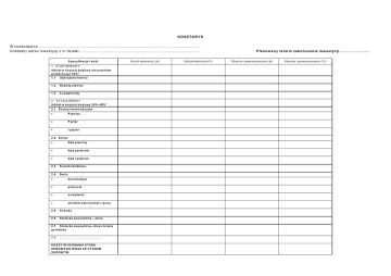 KOSZTORYS W n io sko d a w ca ................................................................................................................ ........................... D o kła d n y a d re s in w e stycji z n r d zia łki.................................................. ...................................................... S p e c y fik a c ja r o b ó t 1. S TA N ZE ROW Y U d zia ł w k o s zc ie b u d o w y n ie p o w in ien p r ze k r o c zy ć 1 0 % * 1 .1 U zb r o je n ie te r e n u 1 .2 R o b o ty zie m n e 1 .3 F u n d a m e n ty 2. S TA N S UROW Y U d zia ł w k o s zc ie b u d o w y 3 0 % -4 0% * 2 .1 Ś c ia n y k o n s tr uk c y jne : P iw n ic e P a r te r I p ię tr o 2 .2 . S tr o p : N a d p iw n ic ą N a d p a r te r e m N a d I p ię tr e m 2 .3 Ś c ia n k i d zia ło w e 2 .4 Dach: k o n s tr u k c ja p o k r y c ie o c ie p le n ie o b r ó b k i b la c h a rs k ie i r y n n y 2 .5 S chody 2 .6 S to la r k a ze w n ę trzn a – o k n a 2 .7 S to la r k a ze w n ę trzn a - d r zw i, b r am a g a r a żo w a 2 .8 .............................................. K O S Z T W Y K O N A N IA S T A N U Z E R O W E G O W R A Z Z E S T A N EM S UROW Y M K o szt e le m e n tu (zł) U d zia ł e le m e n tu (% ) P la n o w a n y te rm in za k o ń c ze n ia in w e s ty c ji ......................... O b e cn e za a w a n so w a n ie (zł) O b e cn e za a w a n so w a n ie (% ) U d zia ł w k o s zc ie b u d o w y : 4 0 % -5 0 % * 3 . IN S T A L A C JE 3 .1 W o d o c ią g ow e 3 .2 K a n a liza c ja s a n ita r n a 3 .3 G a zo w a 3 .4 CO 3 .5 E le k tr y c zn e 3 .6 ................................. 4 . S T A N W Y K O Ń C ZE N IO W Y 4 .1 T y n k i w e w n ę tr zn e , o k ła dzin y w e w n ę tr zn e 4 .2 R o b o ty m a la r s k ie 4 .3 P o s a d zk i 4 .4 . P o d ło g i 4 .5 S to la r k a w e w n ę trzn a 4 .6 B ia ły m o n ta ż 4 .7 .................................... 5 . E L E W A C JE I R O B O T Y Z EW N ĘT R ZN E 5 .1 O c ie p le n ie b u d y n ku 5 .2 E le w a c ja 5 .3 R o b o ty ze w n ę tr zn e OGÓŁE M D a ta sp o rzą d ze n ia ko szto rysu ........................ S p o rzą d ził ................................................................................ (p o d p is K re d y to b io rc y / o s o b y p o s ia d a ją c e j u p ra w n ie n ia ) Z w e ryfiko w a ł ................................................................................ * Je śli p ro ce n to w y u d zia ł p ra c zo sta ł p rze kro czo n y n ie zb ę d n e je st za łą cze n ie o św ia d cze n ia o so b y w yko n u ją ce j ko szto rys o p rzyczyn a ch p rze kro cze n ia w ska źn ikó w .