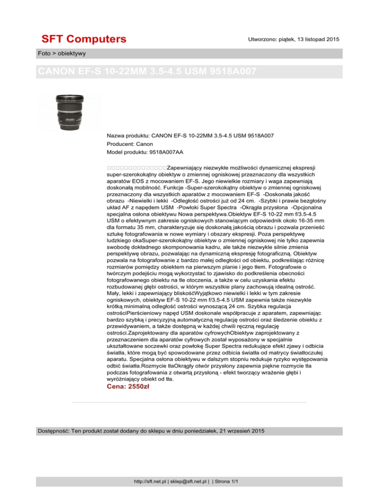 SFT Computers Utworzono: piątek, 13 listopad 2015 Foto > obiektywy CANON EF-S 10-22MM 3.5-4.5 USM 9518A007 Nazwa produktu: CANON EF-S 10-22MM 3.5-4.5 USM 9518A007 Producent: Canon Model produktu: 9518A007AA Zapewniający niezwykłe możliwości dynamicznej ekspresji super-szerokokątny obiektyw o zmiennej ogniskowej przeznaczony dla wszystkich aparatów EOS z mocowaniem EF-S. Jego niewielkie rozmiary i waga zapewniają doskonałą mobilność. Funkcje -Super-szerokokątny obiektyw o zmiennej ogniskowej przeznaczony dla wszystkich aparatów z mocowaniem EF-S -Doskonała jakość obrazu -Niewielki i lekki -Odległość ostrości już od 24 cm. -Szybki i prawie bezgłośny układ AF z napędem USM -Powłoki Super Spectra -Okrągła przysłona -Opcjonalna specjalna osłona obiektywu Nowa perspektywa.Obiektyw EF-S 10-22 mm f/3.5-4.5 USM o efektywnym zakresie ogniskowych stanowiącym odpowiednik około 16-35 mm dla formatu 35 mm, charakteryzuje się doskonałą jakością obrazu i pozwala przenieść sztukę fotografowania w nowe wymiary i obszary ekspresji. Poza perspektywę ludzkiego okaSuper-szerokokątny obiektyw o zmiennej ogniskowej nie tylko zapewnia swobodę dokładnego skomponowania kadru, ale także niezwykle silnie zmienia perspektywę obrazu, pozwalając na dynamiczną ekspresję fotograficzną. Obiektyw pozwala na fotografowanie z bardzo małej odległości od obiektu, podkreślając różnicę rozmiarów pomiędzy obiektem na pierwszym planie i jego tłem. Fotografowie o twórczym podejściu mogą wykorzystać to zjawisko do podkreślenia obecności fotografowanego obiektu na tle otoczenia, a także w celu uzyskania efektu rozbudowanej głębi ostrości, w którym wszystkie plany zachowują idealną ostrość. Mały, lekki i zapewniający bliskośćWyjątkowo niewielki i lekki w tym zakresie ogniskowych, obiektyw EF-S 10-22 mm f/3.5-4.5 USM zapewnia także niezwykle krótką minimalną odległość ostrości wynoszącą 24 cm. Szybka regulacja ostrościPierścieniowy napęd USM doskonale współpracuje z aparatem, zapewniając bardzo szybką i precyzyjną automatyczną regulację ostrości oraz śledzenie obiektu z przewidywaniem, a także dostępną w każdej chwili ręczną regulację ostrości.Zaprojektowany dla aparatów cyfrowychObiektyw zaprojektowany z przeznaczeniem dla aparatów cyfrowych został wyposażony w specjalnie ukształtowane soczewki oraz powłokę Super Spectra redukujące efekt zjawy i odbicia światła, które mogą być spowodowane przez odbicia światła od matrycy światłoczułej aparatu. Specjalna osłona obiektywu w dalszym stopniu redukuje ryzyko występowania odbić światła.Rozmycie tłaOkrągły otwór przysłony zapewnia piękne rozmycie tła podczas fotografowania z otwartą przysłoną - efekt tworzący wrażenie głębi i wyróżniający obiekt od tła. Cena: 2550zł Dostępność: Ten produkt został dodany do sklepu w dniu poniedziałek, 21 wrzesień 2015 http://sft.net.pl | [email protected] | | Strona 1/1