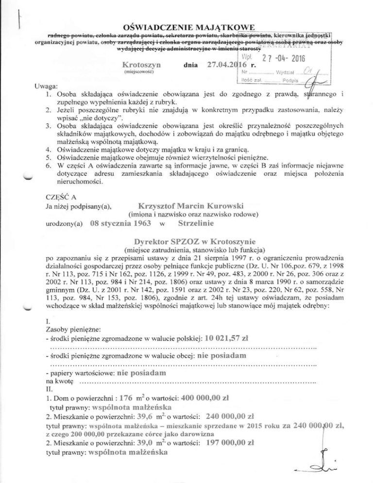 OSWIADCZENIE MAJĄTKqWE organizacyinei powiatu! dnia Krotoszyn Uwaga: 1. 2. 3. 4. 5. 6, 27.01,2 Osoba składająca oświadczenie obowiązana jest do zgodnego z prarłdą. sńannego i zupełnego wypełnienia kazdej z rubryk. Jeżeli poszczególne rubryki nie znajdują rł, konkretnym pr7,vpadku zastosowania. na]eży \łpisać .,nie dotyczy", Osoba składająca ośwjadczenię obowiąana jesl określićprzynależnośćposzczególnych składników majątkowych. dochodów i zobowiązań do majątku odrębnego i majątku obiętego małżęńską wspólnotą majątkową, oświadczenie majątkowe dotyczy majątku rł,kraju i za granicą. oświadczenie majątkowe obejmuje róWnież wjerz}lelności pięniężnę. W części A oświadczenia zawarte są informacje jame, w części B zaśinformacje niejawne dotyczące adTesu zamięszkania składającego oświadczenie oraz miejsca położenia nieruchomości, cZĘŚc A Ja niżej podpisany(a). Krzysztof Marcin Kurowski (imi9na i naz*isko oraz nazrłisko rodowe) urodzony(a) 08 sĘcznia 1963 w Strzelinie Dyrektor SPZOZ w Krotoszynie (miejsce zatrudnienia, stanowisko lub fuŃcja) po zapoznaniu się z przepisami ustawy z dnia 21 sierpnia 1997 r. o ograniczeniu prowadzcnia działalnościgospodarczej przez osoby pełniące funkcje publiczne (Dz, U, Nr 106.poz. 679, z 1998 r, Nr 113. poz, 715 i Nl |62, poz. 1126, z 1999 r. Nr 49, poz. 483, z 2000 r. Nr 26, poz.306 oraz z 2002 r, Nr 113, poz. 984 i Nr 214, poz, 1806) omz ustawy z dnia 8 marca 1990 r. o samorządzie gminnlrn (Dz. U. z 2001 r. Nr I42, poz. 159I oraz ż 2002 r. Nr 23. poz. 220, Nr 62, poz. 558, NI 113. poz, 984, Nr 153, poz, 1806), żgodnie z art. 24h tej ustawy oświadczam, źę posiadam wchodzące w skład małżeńskiej wspólności majątkorłej iub stanowiące mój majątek odrębny: L Zasoby pieniężne: - środki pieniężne zgromadzone w walucie polskiej: 10 021,57 środki pienięźne zglomadzonę ł,walucie obcej: nie papiery wańościowe: nie zl posiadam posiadam na k\łotę TT Dom o po§,ierzcbni : 176 m2o wartości: 400 000rOOzl t}tuł p€wny: wspólnota malż€ńska 2, Mieszkanie o powierzchni: 39,6 m2,o wańości: 240 000,00 zł tytuł prawny: wspólnota malżeń§ka - mieszkanie sprzcdanc w 2015 roku za 240 000,00 z czego 200 000,00 przekazane córce jako darołvizna l 2, Mięszkanie o powierzchni: 39,0 m2,o wafiości: l97000,00zł tytuł prawny: lvspólnota małżeńska 1, r zl, I -1^- nie posiadam rodzaj gospodarstwa|,..,....,,........,....., powieźchnia| 3. Gospodarst$,o roine: o wańości: rodzaj zabudo$y; tytuł prawny: nie posiądam Ź tego tyt.iłu osiągnełem (ęłam) rv roku ubicgłym prz,rchód i dochód u,rr_lsokości: nie osiągnąlem 4. Inne nienrchomości: nie posiadam pou ierzchnia: qJtuł prawny: llI. Posiadam urlziały lł, spółkach hand1olirych - należ!, podać liczbę i ęmitenta udzjełów: Nie posiadam udziały te stanowią pakiet Większ), niż 10% udziałóu w spółce: 0,00 %o Z tego tytufu osiągnąłem (ęłam) \ł, roku ubiegłyn dochód rł,rvysokościl nie osiągnąlem Iv, Posiadam akcje rł,spółkach handlo\\,ych naleźy podać liczbę i emitenta akcji: nie posiadam akcję te stanowią pakiet \ł,iększy niż l0% akcji rv spółce: Z tego tytuhl osiągnełem (ęłam) w roku ubieglym dochód w rł,ysokości; Nabyłem(am) (nabył oój małżonek,z wyłączeniem mienia przynależ]ego do iego majątku od.ętnego; od' Skarbu Pństwa. innej państwou,ej osoby prarłnej. jednostek sa]norządtl terytoriairrego, lub ich związków lub od komunalnej osoby prarł,nej następujące mienie, którc podlegało zbyciu w drodze przetargu - należy podać opis mienia i datę nab_vcia, od kogo: nie nabvlem vI. 1, Prowadzę działalnośćgospodarczą2 (należy podać folmę pra\lną i przedmiot działalności): nie prorł,adzę osohiście,..,..,,.,,., wspólnie z innymi osobanri,..,..,..,..,..,.. osobami tego t}tułu osiągnęłęm (ęłam) w roku ubiegłym przychód i dochód w wysokości:,,,,, - - 2. Zarządzafi działalnościągospodarczą lub jestem przedstavicielenr pełnomocnikiem r:rkiej działalności(należy podać formę prawną i przedmiot dzialalności): nie zafzadzam ) tego tytułu osiągnęłem (ęłam) w loku ubiegłym dochód u, §,ysokości:, ,. , .. . .. vII. 1. W spółkach handlowych (naz\\,ą siedziba spółki): , , . , .. "" " , Nie zasiadam jestem członkiem zarządu (od kiedy): - / -jestem człoŃiem rady nadzorczej (od kiedy): -jestem człoŃiem komisji rewizyjnej (od kiedy): ,,....,..,..,..", 2. Z tego ty|ułu osiągnąłenr w roku ubiegłym dochód w rłlsokości:00,00 zI nctto W spółdzielniach: nie dotycąv - jeslem członkien zarządu (od kied,v): - jcstem członkiem rady nadzorczejr 1od . kiedy):,..,.......,.. ..,.. -jestem cżłoŃięm komisji rewizyinej (od kiedy): 3. Z tego t}tułu osiągnęłem (ęłam) w roku ubiegłym dochód w wysokości: " " " " " " " ", W fundacjach prowadzących działalności -jestem człoŃiem zarządu (odkiedy): od 2013 roku do31,03,2015 -jestem człoŃiem rady nadzorczej (od kiedy): -jestem człoŃiem komisji rewizyjnej (od kiedy)| Z tego t}tułu osiągnęłem lł,roku ubiegłym dochód u,wysokości: 113 655,15 vIlL Ime dochody osiągane z zl t}-tułu zatrudnienia lub innej działalnościzarobkowcj lub zaięć, z podaniem kwot uzyskiwan.vch Z każdęgo t},tułuI lnne źródla - ZUS - l6 838,56 , dochód żony 95 679,97 z| Tx. o $,artości porłyżej10.000 mechaDicznych należy podać nrarkę, model i rok produkcji): Składniki mienia ruchomego zł. (rł. przypadku pojazdów HONDA AcCoRD 20l0 HONDA FRv 2005 x. pożyczki Zobowiqzania pieniężne o watościporq,żej 10,000 zł, , rł tym zaciągnięte kredyty i jakim w zdarzeniem, lv z związku oraz warunli, na jatich zostały udzielone (wobec kogo. jakiej *1sokości): Kredyt t, rachunku osobi§t"vm l0,000,00 zI §1 Kodeksu kamego podstaI Po*vzsze ośuiadczenie5\ladam suiado"n),ral, iz na po,/ha\, za pódanie nieprarrd1 lub Zalajerie pra!Ąd) tsro/i kara S