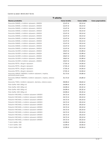 Cennik na dzień: 08-03-2017 02:51 T-shirts Nazwa produktu Cena brutto Cena netto Cena poprzednia Koszulka DANIEL z krótkim rękawem, UNISEX 12,47 zł 10,14 zł - Koszulka DANIEL z krótkim rękawem, UNISEX 12,47 zł 10,14 zł - Koszulka DANIEL z krótkim rękawem, UNISEX 12,47 zł 10,14 zł - Koszulka DANIEL z krótkim rękawem, UNISEX 12,47 zł 10,14 zł - Koszulka DANIEL z krótkim rękawem, UNISEX 12,47 zł 10,14 zł - Koszulka DANIEL z krótkim rękawem, UNISEX 12,47 zł 10,14 zł - Koszulka DANIEL z krótkim rękawem, UNISEX 12,47 zł 10,14 zł - Koszulka DANIEL z krótkim rękawem, UNISEX 12,47 zł 10,14 zł - Koszulka DANIEL z krótkim rękawem, UNISEX 12,47 zł 10,14 zł - Koszulka DANIEL z krótkim rękawem, UNISEX 12,47 zł 10,14 zł - Koszulka DANIEL z krótkim rękawem, UNISEX 12,47 zł 10,14 zł - Koszulka OLIVER z krótkim rękawem, UNISEX 19,67 zł 15,99 zł - Koszulka OLIVER z krótkim rękawem, UNISEX 19,67 zł 15,99 zł - Koszulka OLIVER z krótkim rękawem, UNISEX 19,67 zł 15,99 zł - Koszulka OLIVER z krótkim rękawem, UNISEX 19,67 zł 15,99 zł - Koszulka OLIVER z krótkim rękawem, UNISEX 19,67 zł 15,99 zł - Koszulka PETR z długim rękawem 17,91 zł 14,56 zł - Koszulka PETR z długim rękawem 17,91 zł 14,56 zł - Koszulka PETR z długim rękawem 17,91 zł 14,56 zł - Koszulka PETR z długim rękawem 17,91 zł 14,56 zł - Koszulka SIRIUS THERON z krótkim rękawem, męskia, pomarańczowo-szara 31,73 zł 25,80 zł - Koszulka SIRIUS THERON z krótkim rękawem, męskia, zielonoszara 31,73 zł 25,80 zł - Koszulka THEA z krótkim rękawem, damska, zielono-szara 49,99 zł 40,64 zł - Polo Geffer 400 180g.m2 24,99 zł 20,32 zł - Polo Geffer 400 180g.m2 24,99 zł 20,32 zł - Polo Geffer 400 180g.m2 24,99 zł 20,32 zł - Polo Geffer 400 180g.m2 24,99 zł 20,32 zł - Poloshirt MICHAEL z krótkim rękawem UNISEX 24,72 zł 20,10 zł - Poloshirt MICHAEL z krótkim rękawem UNISEX 24,72 zł 20,10 zł - Poloshirt MICHAEL z krótkim rękawem UNISEX 24,72 zł 20,10 zł - Poloshirt MICHAEL z krótkim rękawem UNISEX 24,72 zł 20,10 zł - Poloshirt MICHAEL z krótkim rękawem UNISEX 24,72 zł 20,10 zł - Poloshirt MICHAEL z krótkim rękawem UNISEX 24,72 zł 20,10 zł - Poloshirt MICHAEL z krótkim rękawem UNISEX 24,72 zł 20,10 zł - Poloshirt MICHAEL z krótkim rękawem UNISEX 24,72 zł 20,10 zł - Poloshirt MICHAEL z krótkim rękawem UNISEX 24,72 zł 20,10 zł - Poloshirt MICHAEL z krótkim rękawem UNISEX 24,72 zł 20,10 zł - Poloshirt MICHAEL z krótkim rękawem UNISEX 24,72 zł 20,10 zł - T-shirt Geffer 200 12,99 zł 10,56 zł - T-shirt Geffer 200 12,99 zł 10,56 zł - T-shirt Geffer 200 12,99 zł 10,56 zł - 1/2 T-shirt Geffer 200 12,99 zł 10,56 zł - T-shirt Geffer 200 9,99 zł 8,12 zł - T-shirt Geffer 200 12,99 zł 10,56 zł - T-shirt Geffer 220 11,99 zł 9,75 zł - T-shirt Geffer 220 11,99 zł 9,75 zł - T-shirt Geffer 220 11,99 zł 9,75 zł - T-shirt Geffer 220 11,99 zł 9,75 zł - T-shirt Geffer 220 11,99 zł 9,75 zł - T-shirt Geffer 220 11,99 zł 9,75 zł - T-shirt Geffer 220 11,99 zł 9,75 zł - T-shirt Geffer 220 9,99 zł 8,12 zł - T-shirt Geffer 220 11,99 zł 9,75 zł - T-shirt Geffer 220 11,99 zł 9,75 zł - T-shirt Geffer 250 11,99 zł 9,75 zł - T-shirt Geffer 250 11,99 zł 9,75 zł - T-shirt Geffer 250 11,99 zł 9,75 zł - T-shirt Geffer 250 11,99 zł 9,75 zł - T-shirt Geffer 250 11,99 zł 9,75 zł - T-shirt Geffer 250 11,99 zł 9,75 zł - T-shirt Geffer 250 11,99 zł 9,75 zł - T-shirt Geffer 250 11,99 zł 9,75 zł - 9,99 zł 8,12 zł - T-shirt Geffer 250 Biały 2/2 Powered by TCPDF (www.tcpdf.org)