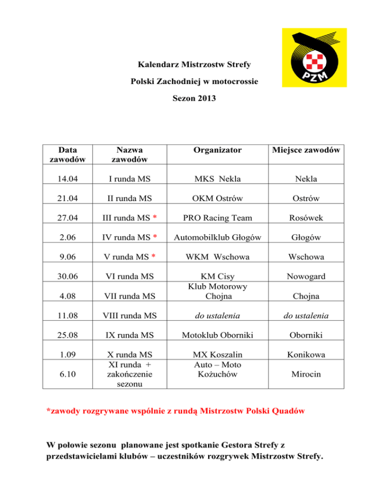Kalendarz Mistrzostw Strefy Polski Zachodniej w motocrossie Sezon 2013 Data zawodów Nazwa zawodów Organizator Miejsce zawodów 14.04 I runda MS MKS Nekla Nekla 21.04 II runda MS OKM Ostrów Ostrów 27.04 III runda MS * PRO Racing Team Rosówek 2.06 IV runda MS * Automobilklub Głogów Głogów 9.06 V runda MS * WKM Wschowa Wschowa 30.06 VI runda MS Nowogard 4.08 VII runda MS KM Cisy Klub Motorowy Chojna 11.08 VIII runda MS do ustalenia do ustalenia 25.08 IX runda MS Motoklub Oborniki Oborniki 1.09 X runda MS XI runda + zakończenie sezonu MX Koszalin Auto – Moto Kożuchów Konikowa 6.10 Chojna Mirocin *zawody rozgrywane wspólnie z rundą Mistrzostw Polski Quadów W połowie sezonu planowane jest spotkanie Gestora Strefy z przedstawicielami klubów – uczestników rozgrywek Mistrzostw Strefy.