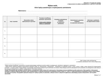 Załącznik nr 1F (wzór) do wniosku o dopuszczenie do udziału w postępowaniu nr DZP.381.15.2014.RB Wykaz osób, które będą uczestniczyć w wykonywaniu zamówienia Wykonawca: …………………………………………………………………………………………………………………………………….. …………………………………………………………………………………………………………………………………………………………… l.p. Imię i nazwisko Stanowisko/ zakres wykonywanych czynności Posiadane kwalifikacje zawodowe /uprawnienia (należy podać dokładny zakres i nr uprawnień)1 Posiadane wykształcenie niezbędne do wykonania zamówienia Doświadczenie zawodowe niezbędne do wykonania zamówienia Informacja o podstawie do dysponowania osobą2 1. 2. 3. 4. ............................................................................... Data i podpis osoby upoważnionej do składania oświadczeń woli w imieniu Wykonawcy 1 Należy wykazać kwalifikacje i uprawnienia w sposób potwierdzający spełnienie warunku udziału w postępowaniu, określony w ogłoszeniu o zamówieniu. Należy wpisać właściwą podstawę dysponowania wskazaną osobą, np. dysponowanie bezpośrednie – zatrudnienie na podstawie umowy o pracę, umowy o dzieło, umowy zlecenia lub dysponowanie pośrednie – w postaci zasobu innego podmiotu. W przypadku dysponowania osobami innych podmiotów do wniosku należy dołączyć pisemne zobowiązania tych podmiotów do udostępnienia osób zdolnych do wykonania zamówienia (np. zgodnie z załącznikiem nr 1D do wzoru wniosku). Uwaga! W przypadku gdy wymagane warunki udziału w postępowaniu spełni więcej niż 5 wykonawców, Zamawiający przyzna dodatkowe punkty wykonawcy, który zgodnie z informacjami zawartymi w wykazie zaoferuje zatrudnienie osób uczestniczących w realizacji zamówienia na podstawie umowy o pracę , tj. 1 pkt za 1 osobę zatrudnioną na podstawie umowy o pracę, jednak nie więcej niż 4 punkty. W przypadku wykazania więcej niż 1 osoby na jedno ze stanowisk, o których mowa w sekcji III.3.4 ogłoszenia, Zamawiający przyzna maksymalnie 1 pkt na jedno stanowisko 2 Strona 1 z 1