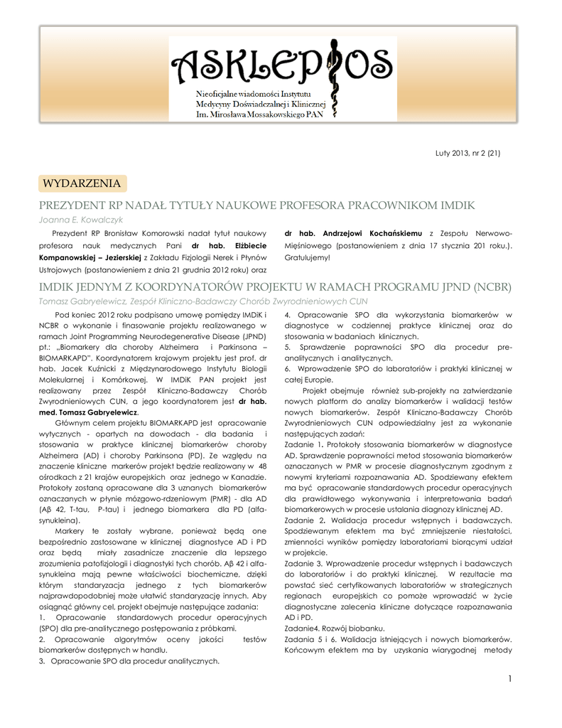 Luty 2013, nr 2 (21) WYDARZENIA PREZYDENT RP NADAŁ TYTUŁY NAUKOWE PROFESORA PRACOWNIKOM IMDIK Joanna E. Kowalczyk Prezydent RP Bronisław Komorowski nadał tytuł naukowy profesora nauk medycznych Pani dr hab. Elżbiecie Kompanowskiej – Jezierskiej z Zakładu Fizjologii Nerek i Płynów dr hab. Andrzejowi Kochańskiemu z Zespołu Nerwowo- Mięśniowego (postanowieniem z dnia 17 stycznia 201 roku.). Gratulujemy! Ustrojowych (postanowieniem z dnia 21 grudnia 2012 roku) oraz IMDIK JEDNYM Z KOORDYNATORÓW PROJEKTU W RAMACH PROGRAMU JPND (NCBR) Tomasz Gabryelewicz, Zespół Kliniczno-Badawczy Chorób Zwyrodnieniowych CUN Pod koniec 2012 roku podpisano umowę pomiędzy IMDiK i NCBR o wykonanie i finasowanie projektu realizowanego w ramach Joint Programming Neurodegenerative Disease (JPND) pt.: „Biomarkery dla choroby Alzheimera i Parkinsona – BIOMARKAPD”. Koordynatorem krajowym projektu jest prof. dr hab. Jacek Kuźnicki z Międzynarodowego Instytutu Biologii 4. Opracowanie SPO dla wykorzystania biomarkerów w diagnostyce w codziennej praktyce klinicznej oraz do stosowania w badaniach klinicznych. 5. Sprawdzenie poprawności SPO dla procedur preanalitycznych i analitycznych. 6. Wprowadzenie SPO do laboratoriów i praktyki klinicznej w Molekularnej i Komórkowej. W IMDiK PAN projekt jest realizowany przez Zespół Kliniczno-Badawczy Chorób Zwyrodnieniowych CUN, a jego koordynatorem jest dr hab. med. Tomasz Gabryelewicz. Głównym celem projektu BIOMARKAPD jest opracowanie wytycznych - opartych na dowodach - dla badania i stosowania w praktyce klinicznej biomarkerów choroby Alzheimera (AD) i choroby Parkinsona (PD). Ze względu na znaczenie kliniczne markerów projekt będzie realizowany w 48 ośrodkach z 21 krajów europejskich oraz jednego w Kanadzie. Protokoły zostaną opracowane dla 3 uznanych biomarkerów oznaczanych w płynie mózgowo-rdzeniowym (PMR) - dla AD (Aβ 42, T-tau, P-tau) i jednego biomarkera dla PD (alfasynukleina). Markery te zostały wybrane, ponieważ będą one bezpośrednio zastosowane w klinicznej diagnostyce AD i PD oraz będą miały zasadnicze znaczenie dla lepszego zrozumienia patofizjologii i diagnostyki tych chorób. Aβ 42 i alfasynukleina mają pewne właściwości biochemiczne, dzięki którym standaryzacja jednego z tych biomarkerów najprawdopodobniej może ułatwić standaryzację innych. Aby osiągnąć główny cel, projekt obejmuje następujące zadania: 1. Opracowanie standardowych procedur operacyjnych całej Europie. Projekt obejmuje również sub-projekty na zatwierdzanie nowych platform do analizy biomarkerów i walidacji testów nowych biomarkerów. Zespół Kliniczno-Badawczy Chorób Zwyrodnieniowych CUN odpowiedzialny jest za wykonanie następujących zadań: Zadanie 1. Protokoły stosowania biomarkerów w diagnostyce AD. Sprawdzenie poprawności metod stosowania biomarkerów oznaczanych w PMR w procesie diagnostycznym zgodnym z nowymi kryteriami rozpoznawania AD. Spodziewany efektem ma być opracowanie standardowych procedur operacyjnych dla prawidłowego wykonywania i interpretowania badań biomarkerowych w procesie ustalania diagnozy klinicznej AD. Zadanie 2. Walidacja procedur wstępnych i badawczych. Spodziewanym efektem ma być zmniejszenie niestałości, zmienności wyników pomiędzy laboratoriami biorącymi udział w projekcie. Zadanie 3. Wprowadzenie procedur wstępnych i badawczych do laboratoriów i do praktyki klinicznej. W rezultacie ma powstać sieć certyfikowanych laboratoriów w strategicznych regionach europejskich co pomoże wprowadzić w życie diagnostyczne zalecenia kliniczne dotyczące rozpoznawania AD i PD. (SPO) dla pre-analitycznego postępowania z próbkami. 2. Opracowanie algorytmów oceny jakości testów biomarkerów dostępnych w handlu. 3. Opracowanie SPO dla procedur analitycznych. Zadanie4. Rozwój biobanku. Zadania 5 i 6. Walidacja istniejących i nowych biomarkerów. Końcowym efektem ma by uzyskania wiarygodnej metody 1 diagnostycznej choroby Alzheimera o wysokiej czułości i swoistości. IMDIK PARTNEREM W PROJEKCIE DOTYCZĄCYM KSZTAŁCENIA W OBSZARZE NAUK BIOMEDYCZNYCH INTERDYSPLINARNEGO Barbara Zabłocka 21 stycznia 2013 Narodowe Centrum Badań i Rozwoju, ogłosiło, że do finansowania zakwalifikowany został projekt pt. „Nowoczesne metody, leki, i terapie dla ochrony zdrowia i gospodarki Europ XXI wieku – interdyscyplinarne kształcenie w obszarze nauk biomedycznych na studiach II i III stopnia” koordynowany przez Wydział Biologii Uniwersytetu Warszawskiego. Jednym z partnerów w projekcie jest Instytut Medycyny Doświadczalnej i Klinicznej im. M. Mossakowskiego PAN. Wniosek ten był zgłoszony w konkursie nr 1/POKL/4.3/2012 oraz 2/POKL/4.3/2012 na dofinansowanie projektów w ramach Działania 4.3 Priorytet IV PO KL Wzmocnienie potencjału dydaktycznego uczelni w obszarach kluczowych w kontekście celów Strategii Europa 2020.” POWSTANIE NOWY INFORMATOR IMDIK Dyrekcja Szanowni Państwo, finalizujemy wydanie nowego informatora IMDiK PAN. Dr Joanna Kowalczyk jest osobą koordynującą przygotowanie zunifikowanych materiałów. Będzie się Ona do Państwa zwracała o przygotowanie danych oraz udział w innych działaniach, w tym np. wykonanie zdjęć Zespołu i Kierownika, udostępnienie materiałów graficznych itp. Z góry dziękujemy za współpracę. NAJNOWSZE PUBLIKACJE NAUKOWE Joanna E. Kowalczyk na podstawie „PubMed" i informacji otrzymanych od Pracowników IMDIK Ryszard Pluta, Janusz Kocki, Ryszard Maciejewski, Marzena Ułamek-Kozioł, Mirosław Jabłoński, Anna Bogucka-Kocka, Stanisław J. Czuczwar Ischemia signalling to Alzheimer-related genes. Folia Neuropathol 2012; 50 (4): 322-329 Anna Potulska-Chromik, Elena Sinkiewicz-Darol, Anna Kostera-Pruszczyk, Hanna Drac, Dagmara Kabzińska, Beata ZakrzewskaPniewska, Marek Gołębiowski, Andrzej Kochański Charcot-Marie-Tooth type 1C disease coexisting with progressive multiple sclerosis: a study of an overlapping syndrome. Folia N
