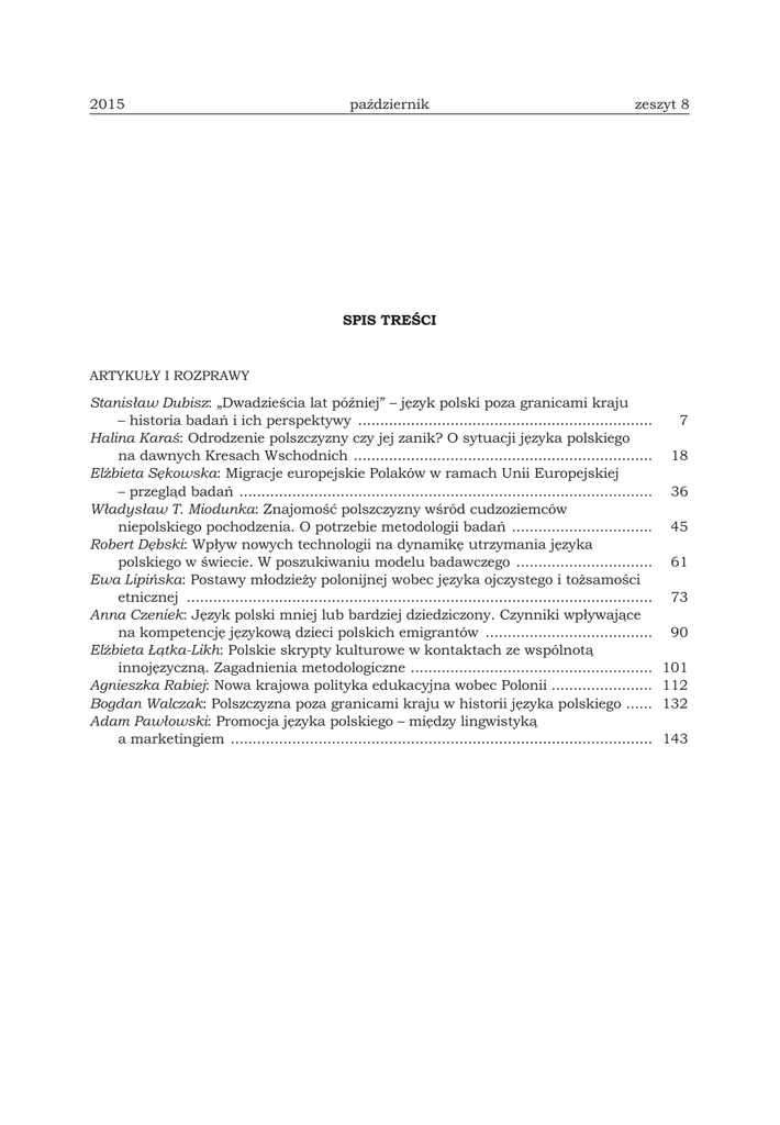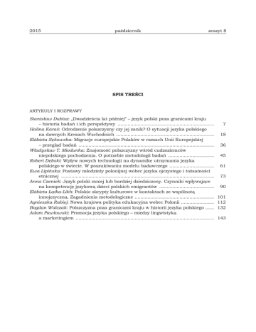 2015 październik zeszyt 8 SPIS TREŚCI ARTYKUŁY I ROZPRAWY Stanisław Dubisz: „Dwadzieścia lat później” – język polski poza granicami kraju – historia badań i ich perspektywy ................................................................... Halina Karaś: Odrodzenie polszczyzny czy jej zanik? O sytuacji języka polskiego na dawnych Kresach Wschodnich .................................................................... Elżbieta Sękowska: Migracje europejskie Polaków w ramach Unii Europejskiej – przegląd badań .............................................................................................. Władysław T. Miodunka: Znajomość polszczyzny wśród cudzoziemców niepolskiego pochodzenia. O potrzebie metodologii badań ................................ Robert Dębski: Wpływ nowych technologii na dynamikę utrzymania języka polskiego w świecie. W poszukiwaniu modelu badawczego ............................... Ewa Lipińska: Postawy młodzieży polonijnej wobec języka ojczystego i tożsamości etnicznej .......................................................................................................... Anna Czeniek: Język polski mniej lub bardziej dziedziczony. Czynniki wpływające na kompetencję językową dzieci polskich emigrantów ...................................... Elżbieta Łątka-Likh: Polskie skrypty kulturowe w kontaktach ze wspólnotą innojęzyczną. Zagadnienia metodologiczne ....................................................... Agnieszka Rabiej: Nowa krajowa polityka edukacyjna wobec Polonii ....................... Bogdan Walczak: Polszczyzna poza granicami kraju w historii języka polskiego ...... Adam Pawłowski: Promocja języka polskiego – między lingwistyką a marketingiem ................................................................................................ 7 18 36 45 61 73 90 101 112 132 143 2015 październik zeszyt 8 CONTENTS PAPERS AND DISSERTATIONS Stanisław Dubisz: “Twenty years later” – the Polish language abroad – the history and prospects of the research .......................................................................... Halina Karaś: Rebirth or decline of the Polish language? On the position of Polish in the old Eastern Borderlands ........................................................................ Elżbieta Sękowska: European migrations of Poles within the European Union – review of studies ............................................................................................ Władysław T. Miodunka: The command of Polish among foreigners of non-Polish origin. On the need of a research methodology ................................................. Robert Dębski: Impact of new technologies on the dynamics of maintaining the Polish language in the world. In search of a research model ....................... Ewa Lipińska: Attitudes of the youth from the Polish community abroad towards their mother tongue and ethnical identity ........................................................ Anna Czeniek: The more or less inherited Polish language. Factors influencing the language competence of Polish emigrants’ children .................................... Elżbieta Łątka-Likh: Polish cultural scripts in contact with speakers of another language. Methodological issues ...................................................................... Agnieszka Rabiej: The new national educational policy towards the Polish community abroad ........................................................................................... Bogdan Walczak: The Polish language beyond the country’s borders in the history of Polish ........................................................................................................... Adam Pawłowski: Promotion of the Polish language – on the borderline between linguistics and marketing ................................................................................. 7 18 36 45 61 73 90 101 112 132 143 2015 październik zeszyt 8 W ZESZYCIE Ten zeszyt „Poradnika Językowego” powstał z inicjatywy Pana Profesora Władysława T. Miodunki, któremu Redakcja składa serdeczne życzenia z okazji Jego tegorocznego jubileuszu. *** – Badania języka polskiego poza granicami kraju zostały zapoczątkowane w latach 30. XX w. Układają się one w cztery okresy: 1945–1970, 1971–1989/90, 1990–2004, po 2004. Od próby pierwszej ich syntezy upływa właśnie 20 lat, co motywuje podjęcie prac nad kolejnymi podsumowaniami. – Sytuacja języka polskiego na dawnych Kresach Wschodnich podlega obecnie bardzo dynamicznym zmianom, co upoważnia postawienie alternatywnego pytania: czy mamy do czynienia z odrodzeniem, czy zanikaniem języka polskiego na Wschodzie. – W obrębie Unii Europejskiej zachodzą współcześnie intensywne migracje ludności, w których biorą udział także Polacy. Zakres skutków tych migracji, mających charakter społeczny, kulturowy i psychologiczny, uzasadnia podjęcie badań nad tymi procesami. – Wśród obcokrajowców zdających certyfikatowe egzaminy z języka polskiego zdecydowanie przeważają osoby niepolskiego pochodzenia (ponad 80%), które chcą w Polsce podjąć pracę lub uzyskać polskie obywatelstwo. Wymaga to określonych działań w sferze polityki językowej i glottodydaktyki polonistycznej. – W sytuacji emigracyjnej sprawy tożsamości narodowej (etnicznej) nabierają ostrości. Badania młodzieży pokolenia polonijnego w Chicago, Paryżu i Wiedniu wykazują wśród niej znaczny stopień poczucia polskości, co jednak nie wiąże jej planów na przyszłość ani z Polską, ani z obecnym krajem osiedlenia. – W większości (według badań pilotażowych) polskojęzycznych rodzin poza granicami kraju język polski (jako kod odziedziczony) pozostaje wartością rdzenną, a zatem jego znajomość u dzieci jest wspierana przez rodziców. Jego zachowanie zależy m.in. od pozycji społecznej rodziny, jej zamoż