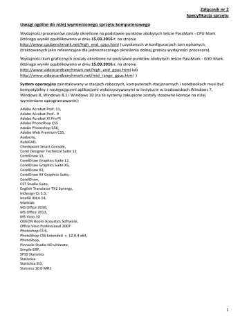 Załącznik nr 2 Specyfikacja sprzętu Uwagi ogólne do niżej wymienionego sprzętu komputerowego Wydajności procesorów zostały określone na podstawie punktów zdobytych teście PassMark ‐ CPU Mark (którego wyniki opublikowano w dniu 15.03.2016 r. na stronie http://www.cpubenchmark.net/high_end_cpus.html ) uzyskanych w konfiguracjach tam opisanych, (traktowanych jako referencyjne dla jednoznacznego określenia dolnej granicy wydajności procesora). Wydajności kart graficznych zostały określone na podstawie punktów zdobytych teście PassMark ‐ G3D Mark. (którego wyniki opublikowano w dniu 15.03.2016 r. na stronie http://www.videocardbenchmark.net/high_end_gpus.html lub http://www.videocardbenchmark.net/mid_range_gpus.html ) System operacyjny zainstalowany w stacjach roboczych, komputerach stacjonarnych i notebookach musi być kompatybilny z następującymi aplikacjami wykorzystywanymi w Instytucie w środowiskach Windows 7, Windows 8, Windows 8.1 i Windows 10 (na te systemy zakupione zostały stosowne licencje na niżej wymienione oprogramowanie): Adobe Acrobat Prof. 11, Adobe Acrobat Prof.. 9 Adobe Acrobat XI Pro Pl Adobe PhotoShop CS5 Adobe Photoshop CS6, Adobe Web Premium CS5, Audacity, AutoCAD, Checkpoint Smart Console, Corel Designer Technical Suite 12 CorelDraw 11, CorelDraw Graphics Suite 12, CorelDraw Graphics Suite X5, CorelDraw X3, CorelDraw X4 Graphics Suite, CorelDraw, CST Studio Suite, English Translator TX2 Synergy, InDesign Cs 5.5, IntelliJ IDEA 14, Mathlab MS Office 2010, MS Office 2013, MS Visio 10 ODEON Room Acoustics Software, Office Visio Professional 2007 Photoshop CS 6, PhotoShop CSS Extended v. 12.0.4 x64, PhotoShop, Pinnacle Studio HD ultimate, Simple ERP, SPSS Statistics Statistica Statistica 8.0, Statistica 10.0 MR1 1 Zapis 3YNBD onSite oznacza następujący rodzaj serwisu gwarancyjnego: Gwarancja: 36 miesięcy Serwis gwarancyjny: W siedzibie Zamawiającego Pełna sprawność sprzętu zostanie przywrócona w czasie nie dłuższym, niż 48 godzin od otrzymania formalnego zawiadomienia o awarii sprzętu Uszkodzone dyski twarde pozostają u Zamawiającego lub są komisyjnie utylizowane W przypadku konieczności naprawy w czasie dłuższym, niż 48 godzin podmiot świadczący serwis nieodpłatnie dostarczy sprzęt zastępczy o równorzędnych parametrach i nieodpłatnie przygotuje go do pracy zgodnej z przeznaczeniem sprzętu naprawianego (w przypadku uszkodzenia jednostki centralnej komputera serwis wykona na sprzęcie zastępczym instalację oprogramowania dostarczonego przez użytkownika i przekopiowanie koniecznych danych) Jeżeli sprzęt po 3 (trzech) naprawach nadal wykazuje wady w działaniu – zostanie wymieniony na nowy, wolny od wad lub nastąpi zwrot zapłaty Zamawiającemu (w pełnej kwocie brutto za cały wadliwy zestaw, który zostanie zwrócony Wykonawcy) – wg decyzji Zamawiającego. Komputery stacjonarne (do każdego komputera: klawiatura i mysz opt. bezprzewodowa oraz zasilacz awaryjny UPS jeśli jest wymagany) TYP Konfiguracja Liczba procesorów x86: 1 Wydajność procesora co najmniej: 9972 pkt., stacje‐ pobór mocy nie większy niż: 65W, robocze‐ 16GB RAM projektowe 256 GB SSD + 2TB SATA 7.2 rpm wydajność niezintegrowanej karty graficznej co najmniej: 2265 pkt., pobór mocy nie większy niż: 41W DVDRW DVD Poziom hałasu < 30dB Sprawność zasilania 90% Zainstalowany i skonfigurowany system operacyjny 3YNBD onSite TYP‐1‐ Zasilacz awaryjny UPS do stacji TYP-1 TYP‐2‐ stacja‐ robocza graficzna Liczba procesorów x86: 1 Wydajność procesora co najmniej: 10081 pkt. pobór mocy nie większy niż: 80W 32 GB RAM ECC 256 GB SSD + 2 x 2TB SATA 7.2 rpm, praca ciągła wydajność niezintegrowanej karty graficznej co najmniej: 4411 pkt., pobór mocy nie większy niż: 108 W DVD+-RW poziom hałasu < 30dB Sprawność zasilania min. 90% Zainstalowany i skonfigurowany system operacyjny 3YNBD on-site Zasilacz awaryjny UPS do stacji TYP-2 Liczba Przykład (przykłady) rozwiązań komputera urządzeń stacjonarnego ‐ typ procesora, typ karty graficznej, system operacyjny, cena 11 Stacja robocza 1) Typ Producent Procesor Pamięć Dyski K. graficzna System op. Orientacyjna cena brutto 1) Mogą zostać zaproponowane różne rozwiązania, nie koniecznie na formularzu 1) Mogą zostać zaproponowane różne rozwiązania, nie koniecznie na formularzu TYP UPS‐1 11 4 Orientacyjna cena brutto Stacja robocza 1) Typ Producent Procesor Pamięć Dyski K. graficzna System op. Orientacyjna cena brutto TYP UPS‐2 4 Orientacyjna cena brutto 2 TYP‐3‐ stacja‐ robocza‐ graficzna Liczba procesorów x86: 1 Wydajność procesora co najmniej: 10081 pkt. pobór mocy nie większy niż: 80W 64 GB RAM ECC 256 GB SSD + 4TB SATA 7.2 rpm, pr.ciągła wydajność niezintegrowanej karty graficznej co najmniej: 3409 pkt., pobór mocy nie większy niż: 60W DVD+-RW poziom hałasu < 30dB Sprawność zasilania min. 90% Zainstalowany i skonfigurowany system operacyjny 3YNBD on‐site Liczba procesorów x86: 1 Wydajność procesora co najmniej: 7040 pkt. komputer pobór mocy nie większy niż: 65W laboratoryjny 8 GB RAM HDD 1 TB SATA 7.2 krpm wydajność zintegrowanej karty graficznej co najmniej: 986 pkt., DVD+-RW poziom hałasu < 30dB Sprawność zasilania min. 90% Zainstalowany i skonfigurowany system operacyjny 3YNBD on‐site TYP‐4 – 1 Procesor Pamięć Dyski K. graficzna System op. Orientacyjna cena brutto 3 1 Liczba procesorów x86: 1 Wydajność procesora co najmniej: 13489 pkt. Stacja‐ obliczeniowo pobór mocy nie większy niż: 140W, częstotliwość co najmniej 3.5GHz ‐graficzna 64 GB RAM ECC DDR4 256 GB SSD + 2TB SATA 7.2 rpm, pr.ciągła wydajność niezintegrowanej karty graficznej co najmniej: 4411 pkt., pobór mocy nie większy niż: 108 W DVD+-RW poziom hałasu < 30dB Sprawność zasilania min. 90% Zainstalowany i skonfigurowany system operacyjny 3YNBD on‐site 1 TYP‐5B ‐ Liczba komputerów stacjonarnych 1) Mogą zostać zaprop