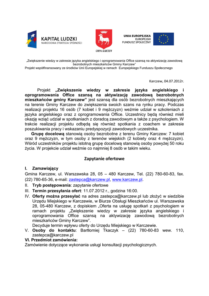 „Zwiększenie wiedzy w zakresie języka angielskiego i oprogramowania Office szansą na aktywizację zawodową bezrobotnych mieszkańców Gminy Karczew” Projekt współfinansowany ze środków Unii Europejskiej w ramach Europejskiego Funduszu Społecznego Karczew, 04.07.2012r. Projekt „Zwiększenie wiedzy w zakresie języka angielskiego i oprogramowania Office szansą na aktywizację zawodową bezrobotnych mieszkańców gminy Karczew” jest szansą dla osób bezrobotnych mieszkających na terenie Gminy Karczew do zwiększenia swoich szans na rynku pracy. Podczas realizacji projektu 16 osób (7 kobiet i 9 mężczyzn) weźmie udział w szkoleniach z języka angielskiego oraz z oprogramowania Office. Uczestnicy będą również mieli okazję wziąć udział w spotkaniach z doradcą zawodowym a także z psychologiem. W trakcie realizacji projektu odbędą się również spotkania z coachem w zakresie poszukiwania pracy i wskazaniu predyspozycji zawodowych uczestnika. Grupę docelową stanowią osoby bezrobotne z terenu Gminy Karczew: 7 kobiet oraz 9 mężczyzn, w tym osoby z terenów wiejskich (2 kobiety oraz 4 mężczyzn). Wśród uczestników projektu istotną grupę docelową stanowią osoby powyżej 50 roku życia. W projekcie udział weźmie co najmniej 8 osób w takim wieku. Zapytanie ofertowe I. Zamawiający Gmina Karczew, ul. Warszawska 28, 05 – 480 Karczew, Tel. (22) 780-60-83, fax. (22) 780-65-36, e-mail: [email protected], www.karczew.pl. II. Tryb postępowania: zapytanie ofertowe III. Termin przesyłania ofert: 11.07.2012 r., godzina 16:00. IV. Oferty można przesyłać na adres [email protected] lub złożyć w siedzibie Urzędu Miejskiego w Karczewie, w Biurze Obsługi Mieszkańców ul. Warszawska 28, 05-480 Karczew, z dopiskiem „Oferta na usługę spotkań z psychologiem w ramach projektu „Zwiększenie wiedzy w zakresie języka angielskiego i oprogramowania Office szansą na aktywizację zawodową bezrobotnych mieszkańców Gminy Karczew”. Decyduje termin wpływu oferty do Urzędu Miejskiego w Karczewie. V. Osoby do kontaktu: Bartłomiej Tkaczyk – (22) 780-60-83 wew. 110, [email protected] VI. Przedmiot zamówienia: Zamówienie dotyczące wykonania usługi konsultacji psychologicznych. VII. Określenie przedmiotu zamówienia: Indywidualne spotkania z psychologiem odbędą się w miesiącu lipcu 2012r. Każdy uczestników odbędzie 1 godzinę spotkania z psychologiem. W sumie odbędzie się 16 godzin konsultacji. Efektem spotkania będzie określenie silnych stron (zasobów) a także deficytów każdego uczestnika oraz sposobu ich minimalizowania. VIII. Termin realizacji zamówienia Termin realizacji zamówienia: od chwili podpisania umowy do dnia 31.07.2012r. Szczegółowy przedmiot zamówienia wraz z terminami został wskazany w pkt. VII. IX. Kryterium Kryterium, decydującym o wyborze Wykonawcy jest najniższa cena - 100%. X. Płatności Płatności będą realizowane na podstawie złożonych przez Wykonawcę faktur na koniec każdego miesiąca wykonywania usługi. XI. Dokumenty Wykonawca zobowiązany jest złożyć: 1.ofertę według wzoru stanowiącego załącznik do niniejszego zapytania, 2. dokumenty potwierdzające posiadanie kwalifikacji do wykonywania przedmiotu zapytania, 3. w przypadku osoby fizycznej – kopia dowodu osobistego; w przypadku osoby prawnej – kopię dokumenty potwierdzającego prowadzenie działalności gospodarczej (decyzji o wpisie do ewidencji działalności gospodarczej lub wpis do KRS). „Zwiększenie wiedzy w zakresie języka angielskiego i oprogramowania Office szansą na aktywizację zawodową bezrobotnych mieszkańców Gminy Karczew” Projekt współfinansowany ze środków Unii Europejskiej w ramach Europejskiego Funduszu Społecznego Karczew, ………. .2012r. Oferta na usługę konsultacji psychologicznych w ramach realizacji projektu „Zwiększenie wiedzy w zakresie języka angielskiego i oprogramowania Office szansą na aktywizację zawodową bezrobotnych mieszkańców Gminy Karczew” Nazwa Beneficjenta: Gmina Karczew Numer Konkursu: 1/POKL/7.3/2011 Okres realizacji: 01.03.2012-31.08.2012 1. Oferuję wykonanie konsultacji psychologicznych za kwotę …………….. (brutto) (słownie ……………………………………………………………….. ) za godzinę, tj. łącznie …………………… za całość zadania. 2. Oświadczam, iż znane są mi zasady realizacji projektów w ramach Programu Operacyjnego Kapitał Ludzki oraz zasady rozliczania projektów w ramach POKL. 3. Oświadczam, iż znane są mi zasady zawarcia umowy oraz zasady płatności, wskazane w ogłoszeniu (zapytaniu) i akceptuję je. 4. Oświadczam, iż znany jest mi okres realizacji Projektu. Szczegółowa kalkulacja kosztów szkoleń – załącznik do Oferty Lp. 1 Nazwa Spotkania z psychologiem Ilość Cena jednostkowa Suma 16 godzin SUMA Podpis ………………………………………..