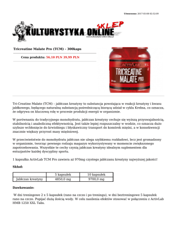 Utworzono: 2017-03-08 02:52:09 Tricreatine Malate Pro (TCM) - 300kaps Cena produktu: 56,10 PLN 39,99 PLN Tri-Creatine Malate (TCM) – jabłczan kreatyny to substancja powstająca w reakcji kreatyny i kwasu jabłkowego, będącego naturalną substancją pośredniczącą biorącą udział w cyklu Krebsa, co oznacza, że odgrywa on kluczową rolę w procesie produkcji energii w organizmie. W porównaniu do tradycyjnego monohydratu, jabłczan kreatyny cechuje się wyższą przyswajalnością, stabilnością i anaboliczną efektywnością. Jest także lepiej rozpuszczalny w wodzie, co oznacza dużo szybsze wchłonięcie do krwiobiegu i błyskawiczny transport do komórek mięśni, a w konsekwencji znacznie większy przyrost masy mięśniowej. W przeciwieństwie do monohydratu jabłczan nie ulega szybkiemu rozkładowi, lecz jest gromadzony w organizmie, tworząc pewnego rodzaju magazyn wykorzystywany w momencie zwiększonego zapotrzebowania. Wszystkie te cechy czynią jabłczan kreatyny idealnym suplementem dla entuzjastów każdej dyscypliny sportu. 1 kapsułka ActivLab TCM Pro zawiera aż 970mg czystego jabłczanu kreatyny najwyższej jakości! Skład: Jabłczan kreatyny 5 kapsułek 10 kapsułek 4850,0 mg 9700,0 mg Dawkowanie: W dni treningowe 2 x 5 kapsułek (rano na czczo i po treningu), w dni beztreningowe 5 kapsułek rano na czczo. Popijać dużą ilością wody. W celu nasilenia efektów stosować w połączeniu z ActivLab HMB 1250 XXL Tabs. Adres: http://www.ko.sklep.pl/ Telefon: kom. 782 010 880 Email: [email protected]