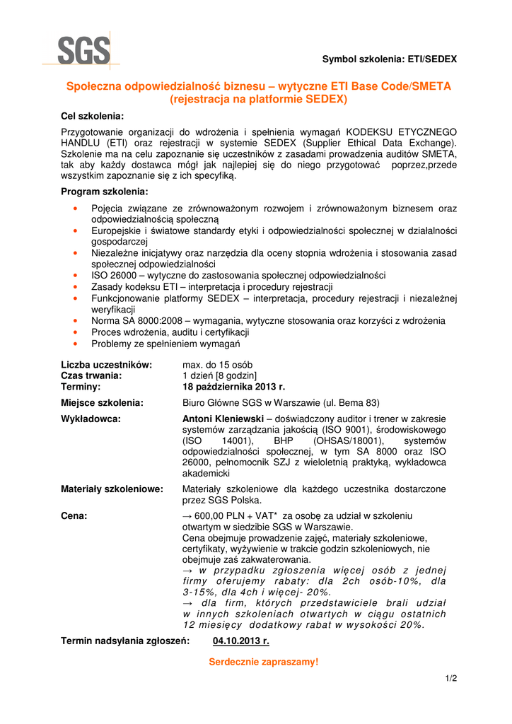 Symbol szkolenia: ETI/SEDEX Społeczna odpowiedzialność biznesu – wytyczne ETI Base Code/SMETA (rejestracja na platformie SEDEX) Cel szkolenia: Przygotowanie organizacji do wdrożenia i spełnienia wymagań KODEKSU ETYCZNEGO HANDLU (ETI) oraz rejestracji w systemie SEDEX (Supplier Ethical Data Exchange). Szkolenie ma na celu zapoznanie się uczestników z zasadami prowadzenia auditów SMETA, tak aby każdy dostawca mógł jak najlepiej się do niego przygotować poprzez,przede wszystkim zapoznanie się z ich specyfiką. Program szkolenia: • • • • • • • • • Pojęcia związane ze zrównoważonym rozwojem i zrównoważonym biznesem oraz odpowiedzialnością społeczną Europejskie i światowe standardy etyki i odpowiedzialności społecznej w działalności gospodarczej Niezależne inicjatywy oraz narzędzia dla oceny stopnia wdrożenia i stosowania zasad społecznej odpowiedzialności ISO 26000 – wytyczne do zastosowania społecznej odpowiedzialności Zasady kodeksu ETI – interpretacja i procedury rejestracji Funkcjonowanie platformy SEDEX – interpretacja, procedury rejestracji i niezależnej weryfikacji Norma SA 8000:2008 – wymagania, wytyczne stosowania oraz korzyści z wdrożenia Proces wdrożenia, auditu i certyfikacji Problemy ze spełnieniem wymagań Liczba uczestników: Czas trwania: Terminy: max. do 15 osób 1 dzień [8 godzin] 18 października 2013 r. Miejsce szkolenia: Biuro Główne SGS w Warszawie (ul. Bema 83) Wykładowca: Antoni Kleniewski – doświadczony auditor i trener w zakresie systemów zarządzania jakością (ISO 9001), środowiskowego (ISO 14001), BHP (OHSAS/18001), systemów odpowiedzialności społecznej, w tym SA 8000 oraz ISO 26000, pełnomocnik SZJ z wieloletnią praktyką, wykładowca akademicki Materiały szkoleniowe: Materiały szkoleniowe dla każdego uczestnika dostarczone przez SGS Polska. Cena: → 600,00 PLN + VAT* za osobę za udział w szkoleniu otwartym w siedzibie SGS w Warszawie. Cena obejmuje prowadzenie zajęć, materiały szkoleniowe, certyfikaty, wyżywienie w trakcie godzin szkoleniowych, nie obejmuje zaś zakwaterowania. → w przypadku zgłos zenia w ięcej osób z jednej firmy oferujemy rabaty: dla 2ch osób-10%, dla 3-15%, dla 4ch i w ięcej- 20%. → dla firm, których przedstaw iciele brali udział w innych szkoleniach otw artych w ciągu ostatnich 12 miesięcy dodatkow y rabat w w ysokości 20%. Termin nadsyłania zgłoszeń: 04.10.2013 r. Serdecznie zapraszamy! 1/2 Symbol szkolenia: ETI/SEDEX Warunki uczestnictwa i dodatkowe informacje: • • • • • Zgłoszenia przyjmowane są wyłącznie na karcie zgłoszenia udziału dostarczonej przez SGS lub on-line ze strony internetowej www.akademia-audytorow.pl. Organizator ma prawo odmówić przyjęcia zgłoszenia z powodu braku miejsc. Decyduje kolejność zgłoszeń. Organizator ma prawo odwołać szkolenie w przypadku zbyt małej liczby zgłoszeń. Informacja ta zostanie przekazana wszystkim zgłoszonym najpóźniej 10 dni roboczych przed planowanym rozpoczęciem kursu. Istnieje możliwość anulowania zgłoszenia wyłącznie drogą pisemną (fax lub e-mail) bez ponoszenia jakichkolwiek kosztów na 2 tygodnie przed planowanym rozpoczęciem, po tym terminie zgłaszający będzie obciążony kosztami manipulacyjnymi w wysokości 20% ustalonej stawki. Płatność następuje po szkoleniu na podstawie otrzymanej faktury VAT w terminie 14 dni od jej wystawienia przed wydaniem certyfikatu ze szkolenia. 1/2