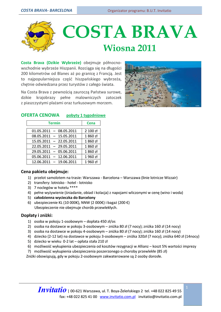COSTA BRAVA- BARCELONA Organizator programu: B.U.T. Invitatio COSTA BRAVA Wiosna 2011 Costa Brava (Dzikie Wybrzeże) obejmuje północnowschodnie wybrzeże Hiszpanii. Rozciąga się na długości 200 kilometrów od Blanes aż po granicę z Francją. Jest to najpopularniejsza częśd hiszpaoskiego wybrzeża, chętnie odwiedzana przez turystów z całego świata. Na Costa Brava z pewnością zauroczą Paostwa surowe, dzikie krajobrazy pełne malowniczych zatoczek z piaszczystymi plażami oraz turkusowym morzem. OFERTA CENOWA pobyty 1 tygodniowe Termin 01.05.2011 08.05.2011 15.05.2011 22.05.2011 29.05.2011 05.06.2011 12.06.2011 – – – – – – – 08.05.2011 15.05.2011 22.05.2011 29.05.2011 05.06.2011 12.06.2011 19.06.2011 Cena 2 100 zł 1 860 zł 1 860 zł 1 860 zł 1 860 zł 1 960 zł 1 960 zł Cena pakietu obejmuje: 1) 2) 3) 4) 5) 6) przelot samolotem na trasie: Warszawa - Barcelona – Warszawa (linie lotnicze Wizzair) transfery: lotnisko - hotel - lotnisko 7 noclegów w hotelu **** pełne wyżywienie (śniadanie, obiad i kolacja) z napojami wliczonymi w cenę (wino i woda) całodzienna wycieczka do Barcelony ubezpieczenie KL (10 000€), NNW (2 000€) i bagaż (200 €) Ubezpieczenie nie obejmuje chorób przewlekłych. Dopłaty i zniżki: 1) osoba w pokoju 1-osobowym – dopłata 450 zł/os 2) osoba na dostawce w pokoju 3-osobowym – zniżka 80 zł (7 nocy); zniżka 160 zł (14 nocy) 3) osoba na dostawce w pokoju 4-osobowym – zniżka 80 zł (7 nocy); zniżka 160 zł (14 nocy) 4) dziecko (2-12 lat) na dostawce w pokoju 3-osobowym – zniżka 320zł (7 nocy); zniżka 640 zł (14nocy) 5) dziecko w wieku 0-2 lat – opłata stała 210 zł 6) możliwośd wykupienia ubezpieczenia od kosztów rezygnacji w Allianz – koszt 5% wartości imprezy 7) możliwośd wykupienia ubezpieczenia poszerzonego o choroby przewlekłe (85 zł) Zniżki obowiązują, gdy w pokoju 2-osobowym zakwaterowane są 2 osoby dorosłe. Invitatio | 00-621 Warszawa, ul. T. Boya-Żeleoskiego 2 tel. +48 022 825 49 55 fax: +48 022 825 41 00 www.invitatio.com.pl [email protected] 1