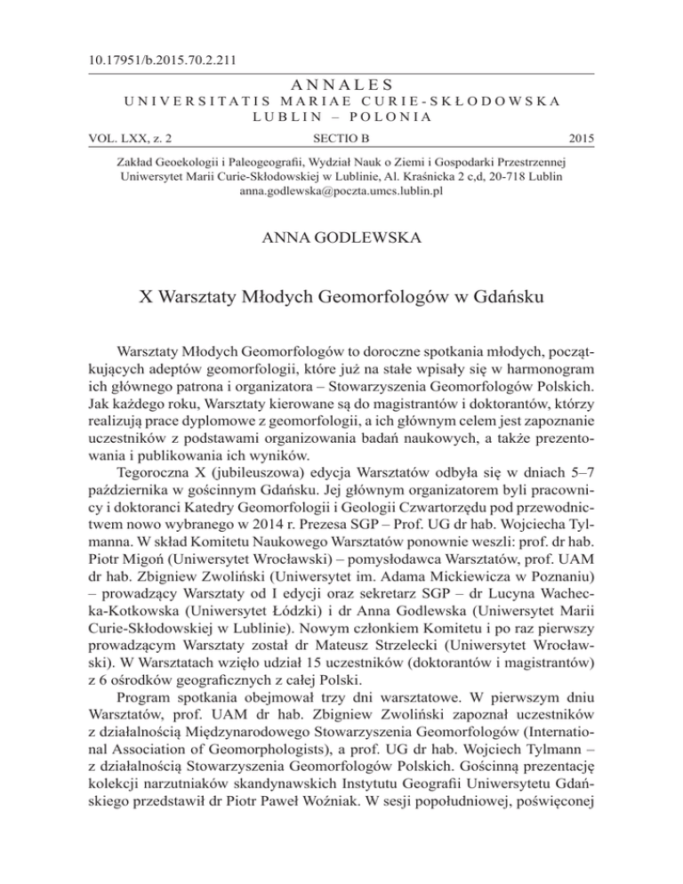 10.17951/b.2015.70.2.211 ANNALES U N I V E R S I TAT I S MAR IAE C U R I E - S K Ł O D O W S KA LUBLIN – POLONIA VOL. LXX, z. 2 SECTIO B 2015 Zakład Geoekologii i Paleogeografii, Wydział Nauk o Ziemi i Gospodarki Przestrzennej Uniwersytet Marii Curie-Skłodowskiej w Lublinie, Al. Kraśnicka 2 c,d, 20-718 Lublin [email protected] ANNA GODLEWSKA X Warsztaty Młodych Geomorfologów w Gdańsku Warsztaty Młodych Geomorfologów to doroczne spotkania młodych, początkujących adeptów geomorfologii, które już na stałe wpisały się w harmonogram ich głównego patrona i organizatora – Stowarzyszenia Geomorfologów Polskich. Jak każdego roku, Warsztaty kierowane są do magistrantów i doktorantów, którzy realizują prace dyplomowe z geomorfologii, a ich głównym celem jest zapoznanie uczestników z podstawami organizowania badań naukowych, a także prezentowania i publikowania ich wyników. Tegoroczna X (jubileuszowa) edycja Warsztatów odbyła się w dniach 5–7 października w gościnnym Gdańsku. Jej głównym organizatorem byli pracownicy i doktoranci Katedry Geomorfologii i Geologii Czwartorzędu pod przewodnictwem nowo wybranego w 2014 r. Prezesa SGP – Prof. UG dr hab. Wojciecha Tylmanna. W skład Komitetu Naukowego Warsztatów ponownie weszli: prof. dr hab. Piotr Migoń (Uniwersytet Wrocławski) – pomysłodawca Warsztatów, prof. UAM dr hab. Zbigniew Zwoliński (Uniwersytet im. Adama Mickiewicza w Poznaniu) – prowadzący Warsztaty od I edycji oraz sekretarz SGP – dr Lucyna Wachecka-Kotkowska (Uniwersytet Łódzki) i dr Anna Godlewska (Uniwersytet Marii Curie-Skłodowskiej w Lublinie). Nowym członkiem Komitetu i po raz pierwszy prowadzącym Warsztaty został dr Mateusz Strzelecki (Uniwersytet Wrocławski). W Warsztatach wzięło udział 15 uczestników (doktorantów i magistrantów) z 6 ośrodków geograficznych z całej Polski. Program spotkania obejmował trzy dni warsztatowe. W pierwszym dniu Warsztatów, prof. UAM dr hab. Zbigniew Zwoliński zapoznał uczestników z działalnością Międzynarodowego Stowarzyszenia Geomorfologów (International Association of Geomorphologists), a prof. UG dr hab. Wojciech Tylmann – z działalnością Stowarzyszenia Geomorfologów Polskich. Gościnną prezentację kolekcji narzutniaków skandynawskich Instytutu Geografii Uniwersytetu Gdańskiego przedstawił dr Piotr Paweł Woźniak. W sesji popołudniowej, poświęconej 212 ANNA GODLEWSKA Planowaniu badań naukowych, prof. UAM dr hab. Zbigniew Zwoliński wygłosił wykład dotyczący „Planowania i organizacji badań naukowych”, a dr Mateusz Strzelecki przedstawił elementy „Strategii pozyskiwania środków na badania naukowe”. Ostatnie w tej sesji wystąpienie pt. „Przygotowanie projektu badawczego” wygłosił Przewodniczący Warsztatów – prof. UG dr hab. Wojciech Tylmann. Natomiast sesję wieńczył panel dyskusyjny uczestników z Prowadzącymi (Fig. 1A). Na zakończenie dnia odbyły się prezentacje dr Lucyny Wacheckiej-Kotkowskiej i dr Mateusza Strzeleckiego dotyczące badań terenowych z zakresu geomorfologii, prowadzonych w różnych częściach świata (m.in. południowo-wschodnia Azja, Grenlandia). Odbyły się one w kameralnej atmosferze, połączonej z uroczystą kolacją. W drugim dniu Warsztatów, w sesji porannej, organizatorzy przygotowali wycieczkę terenową do Gdyni-Orłowa. Prowadzący wycieczkę, mgr Damian Moskalewicz, zaprezentował budowę geologiczną i współczesne procesy geomorfologiczne w obrębie klifu orłowskiego. Uczestnicy mieli okazję wysłuchać aktualnie rozwijanych teorii na temat rozwoju geologicznego tego obszaru, a piękna pogoda pozwoliła podziwiać wychodnie utworów przedczwartorzędowych (miocen) oraz efekty współcześnie zachodzących ruchów masowych, czyli obrywania i osuwania. Sesja popołudniowa, poprowadzona przez dr Annę Godlewską, poświęcona była „Organizacji i przygotowaniu publikacji naukowej”. Po zapoznaniu się z elementami poprawnego pisania publikacji, uczestnicy wykonali samodzielną recenzję artykułu. Jej wartościowym rezultatem było omówienie przez uczestników zarówno elementów poprawnych, jak i błędów merytorycznych i technicznych recenzowanego artykułu. Drugi dzień warsztatów zakończyła sesja wieczorna poprowadzona przez dr Lucynę Wachecką-Kotkowską. Jej tematem były „Zasady przygotowania prezentacji naukowej”. Po wysłuchaniu wykładu, uczestnicy mieli możliwość dyskusji o swoich doświadczeniach w prezentowaniu własnych badań. Miłym zakończeniem tego dnia był wieczór towarzyski, który odbył się w jednym z pubów na gdańskiej starówce. Uczestnicy i prowadzący nie zapomnieli, że ważnym elementem współpracy naukowej jest dobra integracja (Fig. 1B). Ostatni dzień Warsztatów poświęcony był przygotowaniu i prezentacji projektów badawczych. Uczestnicy podzieleni na grupy tematyczne przedstawili własne koncepcje wniosków o finansowanie badań naukowych. Bogate doświadczenie prowadzących – prof. UG dr hab. Wojciecha Tylmanna (Fig. 1C), dr Mateusza Strzeleckiego i dr Lucyny Wacheckiej-Kotkowskiej, pozwoliło uzupełnić ich wnioski o wiele ważnych informacji, a przy tym ustrzec się od popełnienia błędów przy ich składaniu. X WARSZTATY MŁODYCH GEOMORFOLOGóW W GDAńSKU 213 Fot. 1. Warsztaty Młodych Geomorfologów w Gdańsku w obiektywie: A) panel dyskusyjny uczestników z prowadzącymi; B) spotkanie integracyjne; C) Przewodniczący Komitetu Organizacyjnego WMG oraz Prezes SGP prof. UG dr hab. Wojciech Tylmann podczas Warsztatów; D) wręczanie dyplomów uczestnikom Warsztatów (fot. L. Wachecka-Kotkowska) Warsztaty zakończyły się wręczeniem dyplomów Stowarzyszenia Geomorfologów Polskich wszystkim uczestnikom (Fig. 1D). Reprezentujący Stowarzyszenie Prezes – prof. UG dr hab. Wojciech Tylmann oraz sekretarz – dr Lucyna Wachecka-Kotkowska podziękowali wszystkim za przybycie, życząc sukcesów naukowych na niwie geomorfolo