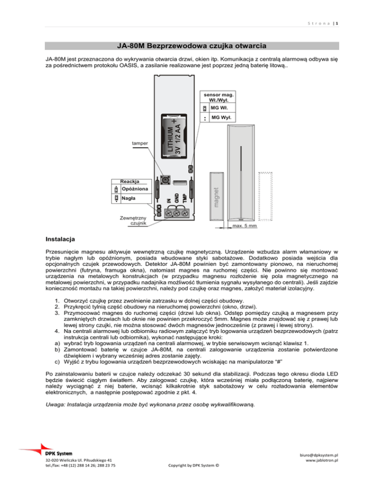 S t r o n a |1 JA-80M Bezprzewodowa czujka otwarcia JA-80M jest przeznaczona do wykrywania otwarcia drzwi, okien itp. Komunikacja z centralą alarmową odbywa się za pośrednictwem protokołu OASIS, a zasilanie realizowane jest poprzez jedną baterię litową.. sensor mag. Wł./Wył. MG Wł. tamper MG Wył. LITHIUM 3V 1/2 AA + Opóźniona Nagła magnet Reackja Zewnętrzny czujnik max. 5 mm Instalacja Przesunięcie magnesu aktywuje wewnętrzną czujkę magnetyczną. Urządzenie wzbudza alarm włamaniowy w trybie nagłym lub opóźnionym, posiada wbudowane styki sabotażowe. Dodatkowo posiada wejścia dla opcjonalnych czujek przewodowych. Detektor JA-80M powinien być zamontowany pionowo, na nieruchomej powierzchni (futryna, framuga okna), natomiast magnes na ruchomej części. Nie powinno się montować urządzenia na metalowych konstrukcjach (w przypadku magnesu rozłożenie się pola magnetycznego na metalowej powierzchni, w przypadku nadajnika możliwość tłumienia sygnału wysyłanego do centrali). Jeśli zajdzie konieczność montażu na takiej powierzchni, należy pod czujkę oraz magnes, założyć materiał izolacyjny. 1. Otworzyć czujkę przez zwolnienie zatrzasku w dolnej części obudowy. 2. Przykręcić tylnią część obudowy na nieruchomej powierzchni (okno, drzwi). 3. Przymocować magnes do ruchomej części (drzwi lub okna). Odstęp pomiędzy czujką a magnesem przy zamkniętych drzwiach lub oknie nie powinien przekroczyć 5mm. Magnes może znajdować się z prawej lub lewej strony czujki, nie można stosować dwóch magnesów jednocześnie (z prawej i lewej strony). 4. Na centrali alarmowej lub odbiorniku radiowym załączyć tryb logowania urządzeń bezprzewodowych (patrz instrukcja centrali lub odbiornika), wykonać następujące kroki: a) wybrać tryb logowania urządzeń na centrali alarmowej, w trybie serwisowym wcisnąć klawisz 1. b) Zamontować baterię w czujce JA-80M, na centrali zalogowanie urządzenia zostanie potwierdzone dźwiękiem i wybrany wcześniej adres zostanie zajęty. c) Wyjść z trybu logowania urządzeń bezprzewodowych wciskając na manipulatorze “#” Po zainstalowaniu baterii w czujce należy odczekać 30 sekund dla stabilizacji. Podczas tego okresu dioda LED będzie świecić ciągłym światłem. Aby zalogować czujkę, która wcześniej miała podłączoną baterię, najpierw należy wyciągnąć z niej baterie, wcisnąć kilkakrotnie styk sabotażowy w celu rozładowania elementów elektronicznych, a następnie postępować zgodnie z pkt. 4. Uwaga: Instalacja urządzenia może być wykonana przez osobę wykwalifikowaną. 32-020 Wieliczka Ul. Piłsudskiego 41 tel./fax: +48 (12) 288 14 26; 288 23 75 [email protected] www.jablotron.pl Copyright by DPK System © S t r o n a |2 Przełączniki DIP na płytce czujki MG ON / MG OFF - włączenie/wyłączenie czujki magnetycznej. W trybie normalnej pracy (magnes-czujka) zworka powinna być w pozycji ON, przy podpięciu innej zewnętrznej czujki do złącza (IN, GND, TMP), należy ustawić pozycję OFF (wówczas JA-80M pełni funkcję transmitera sygnałów do centrali alarmowej lub odpowiedniego odbiornika firmy Jablotron np. UC-8x, AC8x). INS / DEL - Sygnał z czujki, na której włączony jest przełącznik w pozycji DEL spowoduje na centrali załączenie odliczania czasu na wejście/wyjście (reakcja opóźniona centrali), w przypadku ustawienia INS czujka będzie transmitować sygnał nagły (nie będzie odliczany czas na wejście/wyjście, od razu nastąpi alarm na obiekcie). Ustawienie to dotyczy tylko pracy czujki zalogowanej do centrali alarmowej, nie jest wykorzystywane w przypadku czujki zalogowanej do odbiornika radiowego UC-8x lub AC-8x. Otworzenie obudowy czujki, spowoduje wysłanie sygnału sabotażowego. Kontrola otwarcia/zamknięcia Podczas logowania czujki do systemu przez założenie baterii, fabrycznie jest wybierany tryb kontroli otwarcia/zamknięcia. Jeśli nie jest to wymagane i czujka ma reagować tylko na otwarcie, podczas zakładania baterii należy wcisnąć i przytrzymać styk sabotażowy (tamper) na czujce. Podłączanie do JA-80M czujek przewodowych Do czujki JA-80M można podłączyć detektory zewnętrzne posiadające wyjścia przekaźnikowe. Na przykład czujka może zabezpieczyć wiele okien i drzwi. Czujkę magnetyczną można wyłączyć przełącznikiem DIP, wówczas JA-80M pełnić będzie rolę transmitera sygnału dla czujek zewnętrznych. Dwa wejścia (złącza TAMP & IN) zostaną aktywowane po rozłączeniu z GND. IN – po wzbudzeniu tego wejścia (rozłączenie od GND), JA-80M prześle tą samą informację jak przy wzbudzeniu czujki magnetycznej. Reakcja systemu na wzbudzenie może być ustawiona na przełączniku DIP (nagła lub opóźniona). TMP – przy wzbudzeniu tego wyjścia (rozłączenie od GND), urządzenie wyśle informacje taką samą jak przy wzbudzeniu wewnętrznej czujki sabotażowej. GND TMP IN Uwaga: Jeżeli złącza nie są używane, należy pozostawić je zwarte. Przykład podłączenia dodatkowych czujek Test czujki 15 minut po zamknięciu czujki każde jej naruszenie będzie sygnalizowane zapaleniem się diody LED, informacja o detekcji będzie przesyłana do centrali alarmowej, po tym czasie dioda LED zostaje wyłączona. Aby ponownie załączyć tryb testu należy otworzyć zamknąć obudowę czujki. Dokładny poziom sygnału można zmierzyć na klawiaturze systemowej lub poprzez program Comlink / Olink. Wymiana baterii Poziom baterii zasilających czujkę jest cały czas monitorowany, jeżeli są słabe użytkownik i/lub instalator są o tym informowani. Czujka w tym czasie pracuje normalnie, dodatkowo każde naruszenie czujki jest sygnalizowane zapaleniem się diody LED. Informacja ta jest wysyłana około 2 tygodnie przed zupełnym rozładowaniem baterii. W tym czasie powinny być wymienione przez autoryzowanego instalatora. Po wymianie baterii przez 1 minutę 32-020 Wieliczka Ul. Piłsudskiego 41 tel./fax: +48 (12) 288 14