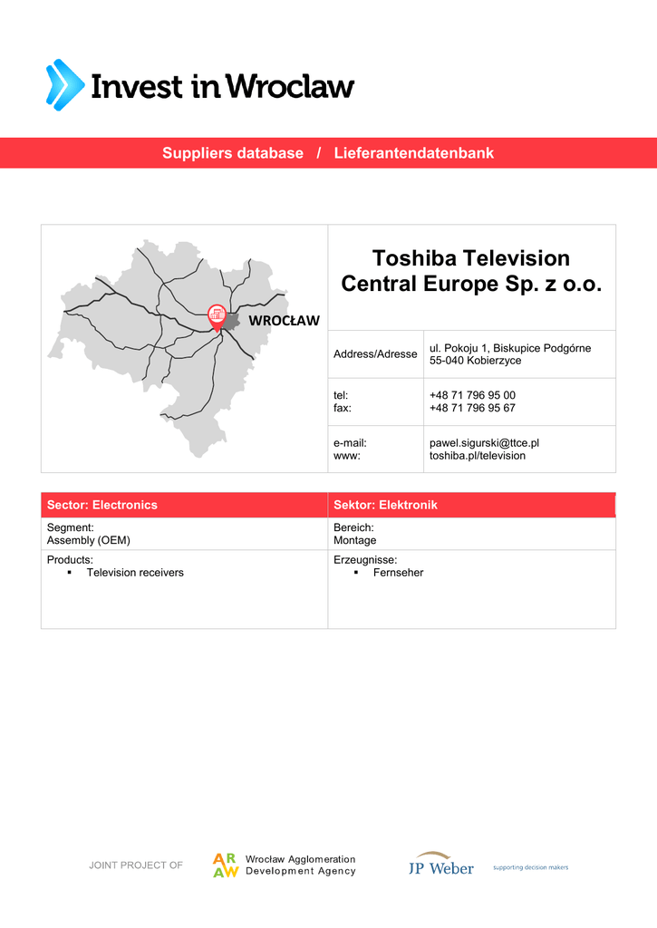 Suppliers database / Lieferantendatenbank Toshiba Television Central Europe Sp. z o.o. WROCŁAW Address/Adresse ul. Pokoju 1, Biskupice Podgórne 55-040 Kobierzyce tel: fax: +48 71 796 95 00 +48 71 796 95 67 e-mail: www: [email protected] toshiba.pl/television Sector: Electronics Sektor: Elektronik Segment: Assembly (OEM) Bereich: Montage Products: Television receivers Erzeugnisse: Fernseher