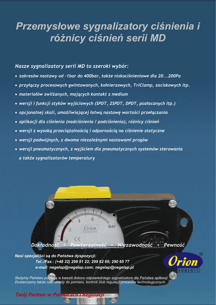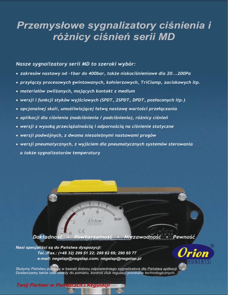 Przemysłowe sygnalizatory ciśnienia / różnicy ciśnień serii MD Nasze sygnalizatory serii MD to szeroki wybór: zakresów nastawy od –1bar do 400bar, także niskociśnieniowe dla 20...200Pa przyłączy procesowych gwintowanych, kołnierzowych, TriClamp, zaciskowych itp. materiałów zwilżanych, mających kontakt z medium wersji i funkcji styków wyjściowych (SPDT, 2SPDT, DPDT, pozłacanych itp.) opcjonalnej skali, umożliwiającej łatwą nastawę wartości przełączania aplikacji dla ciśnienia (nadciśnienia / podciśnienia), różnicy ciśnień wersji z wysoką przeciążalnością i odpornością na ciśnienie statyczne wersji podwójnych, z dwoma niezależnymi nastawami progów wersji pneumatycznych, z wyjściem dla pneumatycznych systemów sterowania a także sygnalizatorów temperatury Dokładność ▪ Powtarzalność ▪ Niezawodność ▪ Pewność Nasi specjaliści są do Państwa dyspozycji: Tel.:/Fax.: (+48 32) 299 51 22; 299 62 69; 290 65 77 e-mail: [email protected]; [email protected] Służymy Państwu pomocą w kwestii doboru odpowiedniego sygnalizatora dla Państwa aplikacji. Dostarczamy także całe układy do pomiaru, kontroli i/lub regulacji procesów technologicznych. NEGELAP-Automatyka ● ul. Kukułek 26 ● 41-200 Sosnowiec ● Tel./Fax.: (+48 32) 299 51 22; 299 62 69; 290 65 77 Twój Partner whttp://www.negelap.com Pomiarach i Regulacji ● e-mail: [email protected]; [email protected] Precyzyjny Pomiar i Kontrola Ciśnienia Przemysłowe sygnalizatory ciśnienia i różnicy ciśnień serii MD Przemysłowe sygnalizatory ciśnienia / różnicy ciśnień serii MD powtarzalnością, pracujących często w niekorzystnych warunkach. Dzięki zastosowaniu odpowiednich komór pomiarowych i materiałów części zwilżanych, sygnalizatory serii MD znajdują zastosowanie w tysiącach różnych aplikacji przemysłowych, w instalacjach technologicznych. Posiadają szeroki wybór elementów elektrycznych, włączając wyjścia SPDT, 2SPDT, DPDT, pozłacane styki, wersje hermetyczne w celu dopasowania odpowiedniej wersji przyrządu dla wielu krytycznych zastosowań. Opcjonalna skala ciśnienia oferuje użytkownikowi możliwość prostszej nastawy, wymaganej wartości przełączania; natomiast szeroki wybór niskich i wysokich zakresów ciśnień, zaspokaja większość aplikacji. Dodatkowo dostępna jest wersja DS dla zakresów 0,067...0,213bar do 7...200bar, posiadająca zabudowane wewnątrz dwa mechanizmy; zapewniająca możliwość nastawy dwóch, niezależnych wartości przełączania. Ponadto, na zapytanie oferujemy wersje specjalne sygnalizatorów, dostosowane do nietypowych lub innowacyjnych aplikacji użytkownika. W przypadku jeśli wymagane są wersje dla strefy zagrożenia wybuchem, oferujemy serię FC w obudowach ognioszczelnych z aprobatą ATEX i IECEx [II 2 GD Ex d IIC Gb Ex tb IIIC Db T85°C (-20°C < Ta < +60°C)]. Wykonane są one w trzech rodzajach obudów tj. aluminiowej (gazy grupy IIA, IIB, IIC), z żeliwa szarego (gazy grupy I, dla kopalni) oraz ze stali nierdzewnej (gazy grupy IIC, atmosfera silnie korozyjna). Dodatkowo oferujemy także sygnalizatory temperatury (termostaty) serii MDT, oferujące zakresy nastaw od 25...90°C do 120...215°C. Charakteryzują się one kapilarą wykonaną ze stali nierdzewnej SS316 o długości 2m, czujnikiem z przyłączem gwintowanym 3/8” lub 1/2” (inne na zapytanie) oraz tak jak w przypadku sygnalizatorów serii MD opcjonalna skalą nastawy i prostotą konfiguracji wartości przełączania. APLIKACJE CECHY Przemysł Energetyczny Przemysł Chemiczny Przemysł Hutniczy Gospodarka Wodno-Ściekowa Przemysł Spożywczy Przemysł Papierniczy Powtarzalność: ±1% FS Piece i palniki Obudowa: odlew aluminium, ochrona IP66 Turbiny parowe i gazowe Styki wyjściowe: SPDT, 2SPDT, DPDT, Aplikacje hydrauliczne Kotły i kompresory Obrabiarki i inne maszyny Hydrauliczne systemy hamulcowe Wersje ze skalą ciśnienia dla łatwej nastawy Uzdatnianie wody Materiały przyłączy: stal nierdzewna SS316L, Ochrona przeciwpożarowa Przechowywanie i transport gazu ziemnego, LPG Zakresy nastawy od -1bar do 400bar, także dla bardzo niskich ciśnień 20...200Pa Wersje dla ciśnień (nadciśnienie / podciśnienie), różnicy ciśnień, temperatury (MDT) Temp. procesu: -5…+80oC, (max. 150oC dla membran metalowych) hermetyczne, pozłacane, dla obciążeń DC itp. Przyłącza procesowe: gwintowane, kołnierzowe, higieniczne Hastelloy C, Monel 400, Tytan, Tantal Materiały membran: Neopren, Teflon, SS316L, Hastelloy C, Monel 400, Tytan, Tantal NEGELAP-Automatyka ● ul. Kukułek 26 ● 41-200 Sosnowiec ● Tel./Fax.: (+48 32) 299 51 22; 299 62 69; 290 65 77 http://www.negelap.com ● e-mail: [email protected]; [email protected] Precyzyjny Pomiar i Kontrola Ciśnienia Sygnalizatory ciśnienia / różnicy ciśnień (presostaty) serii MD zostały zaprojektowane dla aplikacji, które wymagają solidnych, stabilnych i bardzo odpornych przyrządów; charakteryzujących się wysoką dokładnością i Przemysłowe sygnalizatory ciśnienia / różnicy ciśnień serii MD Śruby blokady nastaw użytkownika Oddzielny blok podłączeniowych zacisków elektrycznych Niezawodny mikroprzełącznik dla trwałej i stabilnej pracy Unikalny mechanizm skali dla wysokiej rozdzielczości nastawy Łożyskowana powierzchnia dźwigni dla poprawnej pracy Specjalny mechanizm dźwigni, poprawiający transmisję ruchu Odpowiednia oś dźwigni dla solidnego podparcia Osłona elementów nastawy, odporna na manipulacje Czytelna, opcjonalna skala nastawy ciśnienia z wysoką rozdzielczością dla prostej i dokładnej nastawy Śrubki mocujące pokrywę sygnalizatora Wysoki stopień ochrony obudowy IP66 Zewnętrzne otwory, dla montażu na obiekcie Wybór rodzaju przepustu kablowego, zależnie od wielkości kabla Szeroka gama przyłączy procesowych i materiałów zwilżanych, mających kontakt z procesem NEGELAP-Automatyka ● ul. Kukułek 26 ● 41-200 Sosnowiec ● Tel./Fax