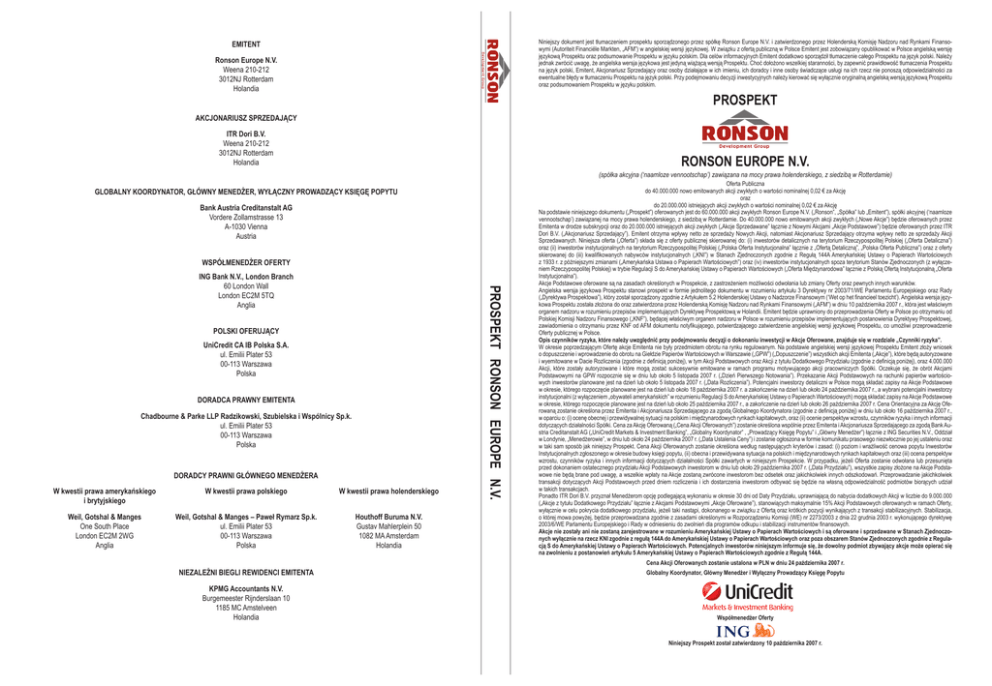 Niniejszy dokument jest tłumaczeniem prospektu sporządzonego przez spółkę Ronson Europe N.V. i zatwierdzonego przez Holenderską Komisję Nadzoru nad Rynkami Finansowymi (Autoriteit Financiële Markten, „AFM”) w angielskiej wersji językowej. W związku z ofertą publiczną w Polsce Emitent jest zobowiązany opublikować w Polsce angielską wersję językową Prospektu oraz podsumowanie Prospektu w języku polskim. Dla celów informacyjnych Emitent dodatkowo sporządził tłumaczenie całego Prospektu na język polski. Należy jednak zwrócić uwagę, że angielska wersja językowa jest jedyną wiążącą wersją Prospektu. Choć dołożono wszelkiej staranności, by zapewnić prawidłowość tłumaczenia Prospektu na język polski, Emitent, Akcjonariusz Sprzedający oraz osoby działające w ich imieniu, ich doradcy i inne osoby świadczące usługi na ich rzecz nie ponoszą odpowiedzialności za ewentualne błędy w tłumaczeniu Prospektu na język polski. Przy podejmowaniu decyzji inwestycyjnych należy kierować się wyłącznie oryginalną angielską wersją językową Prospektu oraz podsumowaniem Prospektu w języku polskim. EMITENT Ronson Europe N.V. Weena 210-212 3012NJ Rotterdam Holandia PROSPEKT AKCJONARIUSZ SPRZEDAJĄCY ITR Dori B.V. Weena 210-212 3012NJ Rotterdam Holandia RONSON EUROPE N.V. (spółka akcyjna (‘naamloze vennootschap’) zawiązana na mocy prawa holenderskiego, z siedzibą w Rotterdamie) GLOBALNY KOORDYNATOR, GŁÓWNY MENEDŻER, WYŁĄCZNY PROWADZĄCY KSIĘGĘ POPYTU Bank Austria Creditanstalt AG Vordere Zollamstrasse 13 A-1030 Vienna Austria WSPÓŁMENEDŻER OFERTY POLSKI OFERUJĄCY UniCredit CA IB Polska S.A. ul. Emilii Plater 53 00-113 Warszawa Polska DORADCA PRAWNY EMITENTA Chadbourne & Parke LLP Radzikowski, Szubielska i Wspólnicy Sp.k. ul. Emilii Plater 53 00-113 Warszawa Polska DORADCY PRAWNI GŁÓWNEGO MENEDŻERA W kwestii prawa amerykańskiego i brytyjskiego W kwestii prawa polskiego W kwestii prawa holenderskiego Weil, Gotshal & Manges One South Place London EC2M 2WG Anglia Weil, Gotshal & Manges – Paweł Rymarz Sp.k. ul. Emilii Plater 53 00-113 Warszawa Polska Houthoff Buruma N.V. Gustav Mahlerplein 50 1082 MA Amsterdam Holandia PROSPEKT RONSON EUROPE N.V. ING Bank N.V., London Branch 60 London Wall London EC2M 5TQ Anglia Oferta Publiczna do 40.000.000 nowo emitowanych akcji zwykłych o wartości nominalnej 0,02 € za Akcję oraz do 20.000.000 istniejących akcji zwykłych o wartości nominalnej 0,02 € za Akcję Na podstawie niniejszego dokumentu („Prospekt”) oferowanych jest do 60.000.000 akcji zwykłych Ronson Europe N.V. („Ronson”, „Spółka” lub „Emitent”), spółki akcyjnej (‘naamloze vennootschap’) zawiązanej na mocy prawa holenderskiego, z siedzibą w Rotterdamie. Do 40.000.000 nowo emitowanych akcji zwykłych („Nowe Akcje”) będzie oferowanych przez Emitenta w drodze subskrypcji oraz do 20.000.000 istniejących akcji zwykłych („Akcje Sprzedawane” łącznie z Nowymi Akcjami „Akcje Podstawowe”) będzie oferowanych przez ITR Dori B.V. („Akcjonariusz Sprzedający”). Emitent otrzyma wpływy netto ze sprzedaży Nowych Akcji, natomiast Akcjonariusz Sprzedający otrzyma wpływy netto ze sprzedaży Akcji Sprzedawanych. Niniejsza oferta („Oferta”) składa się z oferty publicznej skierowanej do: (i) inwestorów detalicznych na terytorium Rzeczypospolitej Polskiej („Oferta Detaliczna”) oraz (ii) inwestorów instytucjonalnych na terytorium Rzeczypospolitej Polskiej („Polska Oferta Instytucjonalna” łącznie z „Ofertą Detaliczną”, „Polska Oferta Publiczna”) oraz z oferty skierowanej do (iii) kwalifikowanych nabywców instytucjonalnych („KNI”) w Stanach Zjednoczonych zgodnie z Regułą 144A Amerykańskiej Ustawy o Papierach Wartościowych z 1933 r. z późniejszymi zmianami („Amerykańska Ustawa o Papierach Wartościowych”) oraz (iv) inwestorów instytucjonalnych spoza terytorium Stanów Zjednoczonych (z wyłączeniem Rzeczypospolitej Polskiej) w trybie Regulacji S do Amerykańskiej Ustawy o Papierach Wartościowych („Oferta Międzynarodowa” łącznie z Polską Ofertą Instytucjonalną „Oferta Instytucjonalna”). Akcje Podstawowe oferowane są na zasadach określonych w Prospekcie, z zastrzeżeniem możliwości odwołania lub zmiany Oferty oraz pewnych innych warunków. Angielska wersja językowa Prospektu stanowi prospekt w formie jednolitego dokumentu w rozumieniu artykułu 3 Dyrektywy nr 2003/71/WE Parlamentu Europejskiego oraz Rady („Dyrektywa Prospektowa”), który został sporządzony zgodnie z Artykułem 5.2 Holenderskiej Ustawy o Nadzorze Finansowym (‘Wet op het financieel toezicht’). Angielska wersja językowa Prospektu została złożona do oraz zatwierdzona przez Holenderską Komisję Nadzoru nad Rynkami Finansowymi („AFM”) w dniu 10 października 2007 r., która jest właściwym organem nadzoru w rozumieniu przepisów implementujących Dyrektywę Prospektową w Holandii. Emitent będzie uprawniony do przeprowadzenia Oferty w Polsce po otrzymaniu od Polskiej Komisji Nadzoru Finansowego („KNF”), będącej właściwym organem nadzoru w Polsce w rozumieniu przepisów implementujących postanowienia Dyrektywy Prospektowej, zawiadomienia o otrzymaniu przez KNF od AFM dokumentu notyfikującego, potwierdzającego zatwierdzenie angielskiej wersji językowej Prospektu, co umożliwi przeprowadzenie Oferty publicznej w Polsce. Opis czynników ryzyka, które należy uwzględnić przy podejmowaniu decyzji o dokonaniu inwestycji w Akcje Oferowane, znajduje się w rozdziale „Czynniki ryzyka”. W okresie poprzedzającym Ofertę akcje Emitenta nie były przedmiotem obrotu na rynku regulowanym. Na podstawie angielskiej wersji językowej Prospektu Emitent złoży wniosek o dopuszczenie i wprowadzenie do obrotu na Giełdzie Papierów Wartościowych w Warszawie („GPW”) („Dopuszczenie”) wszystkich akcji Emitenta („Akcje”), które będą autoryzow