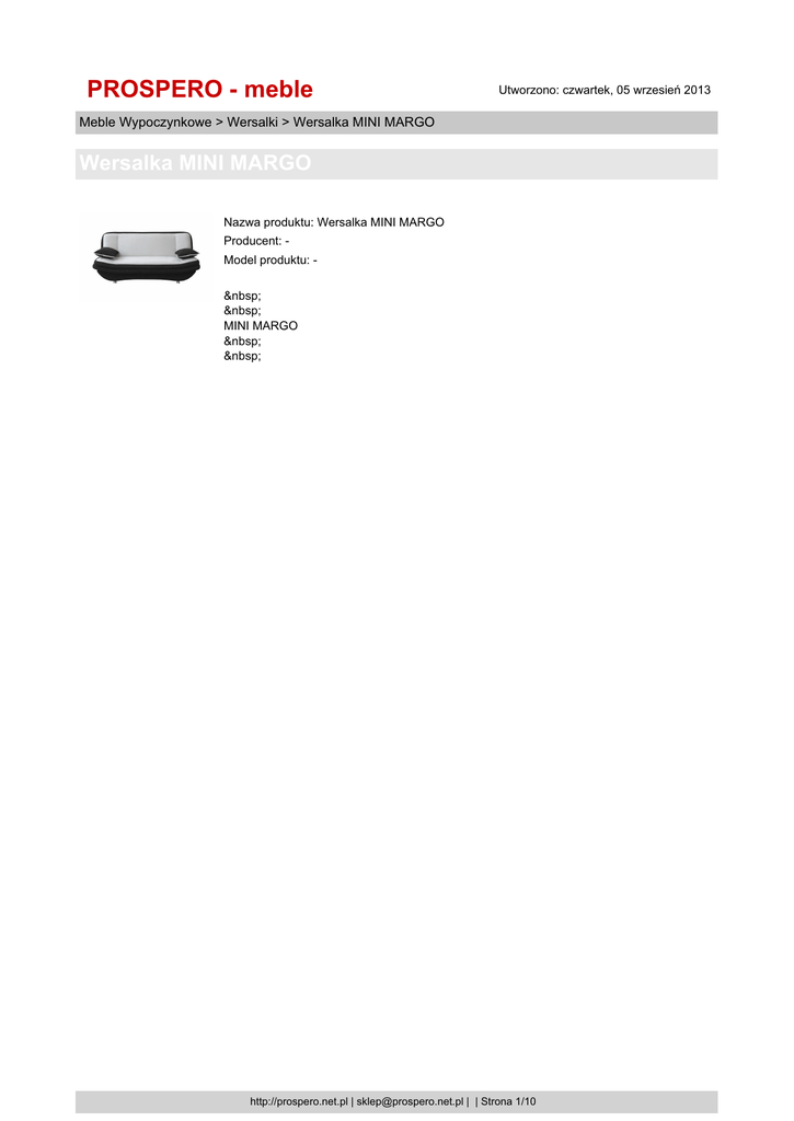 PROSPERO - meble Utworzono: czwartek, 05 wrzesień 2013 Meble Wypoczynkowe > Wersalki > Wersalka MINI MARGO Wersalka MINI MARGO Nazwa produktu: Wersalka MINI MARGO Producent: Model produktu: MINI MARGO http://prospero.net.pl | [email protected] | | Strona 1/10 PROSPERO - meble Utworzono: czwartek, 05 wrzesień 2013 Meble Wypoczynkowe > Wersalki > Wersalka MINI MARGO Wersalka MINI MARGO http://prospero.net.pl | [email protected] | | Strona 2/10 PROSPERO - meble Utworzono: czwartek, 05 wrzesień 2013 Meble Wypoczynkowe > Wersalki > Wersalka MINI MARGO Wersalka MINI MARGO Normal 0 21 false false false PL X-NONE X-NONE DefSemiHidden="true" DefQFormat="false" DefPriority="99" LatentStyleCount="267"> UnhideWhenUsed="false" QFormat="true" Name="Normal" /> UnhideWhenUsed="false" QFormat="true" Name="heading 1" /> http://prospero.net.pl | [email protected] | | Strona 3/10 PROSPERO - meble Utworzono: czwartek, 05 wrzesień 2013 Meble Wypoczynkowe > Wersalki > Wersalka MINI MARGO Wersalka MINI MARGO UnhideWhenUsed="false" QFormat="true" Name="Title" /> UnhideWhenUsed="false" QFormat="true" Name="Subtitle" /> UnhideWhenUsed="false" QFormat="true" Name="Strong" /> UnhideWhenUsed="false" QFormat="true" Name="Emphasis" /> UnhideWhenUsed="false" Name="Table Grid" /> UnhideWhenUsed="false" QFormat="true" Name="No Spacing" /> UnhideWhenUsed="false" Name="Light Shading" /> UnhideWhenUsed="false" Name="Light List" /> UnhideWhenUsed="false" Name="Light Grid" /> UnhideWhenUsed="false" Name="Medium Shading 1" /> UnhideWhenUsed="false" Name="Medium Shading 2" /> UnhideWhenUsed="false" Name="Medium List 1" /> UnhideWhenUsed="false" Name="Medium List 2" /> UnhideWhenUsed="false" Name="Medium Grid 1" /> UnhideWhenUsed="false" Name="Medium Grid 2" /> UnhideWhenUsed="false" Name="Medium Grid 3" /> UnhideWhenUsed="false" Name="Dark List" /> UnhideWhenUsed="false" Name="Colorful Shading" /> http://prospero.net.pl | [email protected] | | Strona 4/10 PROSPERO - meble Utworzono: czwartek, 05 wrzesień 2013 Meble Wypoczynkowe > Wersalki > Wersalka MINI MARGO Wersalka MINI MARGO UnhideWhenUsed="false" Name="Colorful List" /> UnhideWhenUsed="false" Name="Colorful Grid" /> UnhideWhenUsed="false" Name="Light Shading Accent 1" /> UnhideWhenUsed="false" Name="Light List Accent 1" /> UnhideWhenUsed="false" Name="Light Grid Accent 1" /> UnhideWhenUsed="false" Name="Medium Shading 1 Accent 1" /> UnhideWhenUsed="false" Name="Medium Shading 2 Accent 1" /> UnhideWhenUsed="false" Name="Medium List 1 Accent 1" /> UnhideWhenUsed="false" QFormat="true" Name="List Paragraph" /> UnhideWhenUsed="false" QFormat="true" Name="Quote" /> UnhideWhenUsed="false" QFormat="true" Name="Intense Quote" /> UnhideWhenUsed="false" Name="Medium List 2 Accent 1" /> UnhideWhenUsed="false" Name="Medium Grid 1 Accent 1" /> UnhideWhenUsed="false" Name="Medium Grid 2 Accent 1" /> UnhideWhenUsed="false" Name="Medium Grid 3 Accent 1" /> UnhideWhenUsed="false" Name="Dark List Accent 1" /> UnhideWhenUsed="false" Name="Colorful Shading Accent 1" /> UnhideWhenUsed="false" Name="Colorful List Accent 1" /> UnhideWhenUsed="false" Name="Colorful Grid Accent 1" /> UnhideWhenUsed="false" Name="Light Shading Accent 2" /> UnhideWhenUsed="false" Name="Light List Accent 2" /> UnhideWhenUsed="false" Name="Light Grid Accent 2" /> UnhideWhenUsed="false" Name="Medium Shading 1 Accent 2" /> UnhideWhenUsed="false" Name="Medium Shading 2 Accent 2" /> UnhideWhenUsed="false" Name="Medium List 1 Accent 2" /> UnhideWhenUsed="false" Name="Medium List 2 Accent 2" /> UnhideWhenUsed="false" Name="Medium Grid 1 Accent 2" /> http://prospero.net.pl | [email protected] | | Strona 5/10 PROSPERO - meble Utworzono: czwartek, 05 wrzesień 2013 Meble Wypoczynkowe > Wersalki > Wersalka MINI MARGO Wersalka MINI MARGO UnhideWhenUsed="false" Name="Medium Grid 2 Accent 2" /> UnhideWhenUsed="false" Name="Medium Grid 3 Accent 2" /> UnhideWhenUsed="false" Name="Dark List Accent 2" /> UnhideWhenUsed="false" Name="Colorful Shading Accent 2" /> UnhideWhenUsed="false" Name="Colorful List Accent 2" /> UnhideWhenUsed="false" Name="Colorful Grid Accent 2" /> UnhideWhenUsed="false" Name="Light Shading Accent 3" /> UnhideWhenUsed="false" Name="Light List Accent 3" /> UnhideWhenUsed="false" Name="Light Grid Accent 3" /> UnhideWhenUsed="false" Name="Medium Shading 1 Accent 3" /> UnhideWhenUsed="false" Name="Medium Shading 2 Accent 3" /> UnhideWhenUsed="false" Name="Medium List 1 Accent 3" /> UnhideWhenUsed="false" Name="Medium List 2 Accent 3" /> UnhideWhenUsed="false" Name="Medium Grid 1 Accent 3" /> UnhideWhenUsed="false" Name="Medium Grid 2 Accent 3" /> UnhideWhenUsed="false" Name="Medium Grid 3 Accent 3" /> UnhideWhenUsed="false" Name="Dark List Accent 3" /> UnhideWhenUsed="false" Name="Colorful Shading Accent 3" /> UnhideWhenUsed="false" Name="Colorful List Accent 3" /> UnhideWhenUsed="false" Name="Colorful Grid Accent 3" /> UnhideWhenUsed="false" Name="Light Shading Accent 4" /> UnhideWhenUsed="false" Name="Light List Accent 4" /> UnhideWhenUsed="false" Name="Light Grid Accent 4" /> UnhideWhenUsed="false" Name="Medium Shading 1 Accent 4" /> UnhideWhenUsed="false" Name="Medium Shading 2 Accent 4" /> UnhideWhenUsed="false" Name="Medium List 1 Accent 4" /> UnhideWhenUsed="false" Name="Medium List 2 Accent 4" /> UnhideWhenUsed="false" Name="Medium Grid 1 Accent 4" /> http://prospero.net.pl | [email protected] | | Strona 6/10 PROSPERO - meble Utworzono: czwartek, 05 wrzesień 2013 Meble Wypoczynkowe > Wersalki > Wersalka MINI MARGO Wersalka MINI MARGO UnhideWhenUsed="false" Name="Medium Grid 2 Accent 4" /> UnhideWhenUsed="false" Name="Medium Grid 3 Accent 4" /> UnhideWhenUsed="false" Name="Dark List Accent 4" /> UnhideWhenUsed="false" Name="Colorful Shading Accent 4" /> UnhideWhenUsed="false" Name="Colorful List Accent 4" /> UnhideWhenUsed="false" Name="Colorful Grid Accent 4" /> UnhideWhenUsed="false" Name="Light Shading Accent 5" /> UnhideWhenUsed="false" Name="Light List Accent 5" /> UnhideWhenUsed="false" Name="Lig