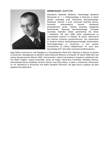 ADAM KULIŚ / BARYTON Absolwent Wydziału Wokalno- Aktorskiego Akademii Muzycznej im. I. J. Paderewskiego w Poznaniu w klasie śpiewu solowego prof. Wojciecha Maciejowskiego. Studiował również u prof. Leonarda Andrzeja Mroza. Uczestnik mistrzowskich kursów wokalnych prowadzonych przez: Helenę Łazarską, Jewgienija Nestierienko, Ryszarda Karczykowskiego. Prowadzi warsztaty teatralne (także pantomimy) dla dzieci i młodzieży. Od roku 2006 ściśle współpracuje ze szczecińskim teatrem La Fayette. W swoim repertuarze ma również miniatury pantomimiczne. Jest asystentem w Studium Kultury Zachodniopomorskiego Uniwersytetu Technologicznego w Szczecinie, a tym samym instruktorem w Chórze Akademickim im. prof. Jana Szyrockiego ZUT. Jest także cenionym konferansjerem. Jego debiut sceniczny to rola Papagena w Czarodziejskim Flecie W.A. Mozarta w Operze na Zamku w Szczecinie. Występował na deskach Uckermärkische Bühnen w Schwedt. W latach 2006-2011 był solistą Stowarzyszenia Mozart 2003. Koncertował z takimi kameralnymi zespołami wokalnymi jak: The Baltic Singers, Inspiro Ensemble, Voces de fuego, Pomerania Ensemble, Mirabilia Musica, Zachodniopomorscy Wokaliści Cantum Novum oraz Deus Meus, a także z orkiestrami Filharmonii im. M. Karłowicza w Szczecinie oraz Baltic Neopolis Orchestra. Na jego koncie znajduje się kilka wydawnictw płytowych.