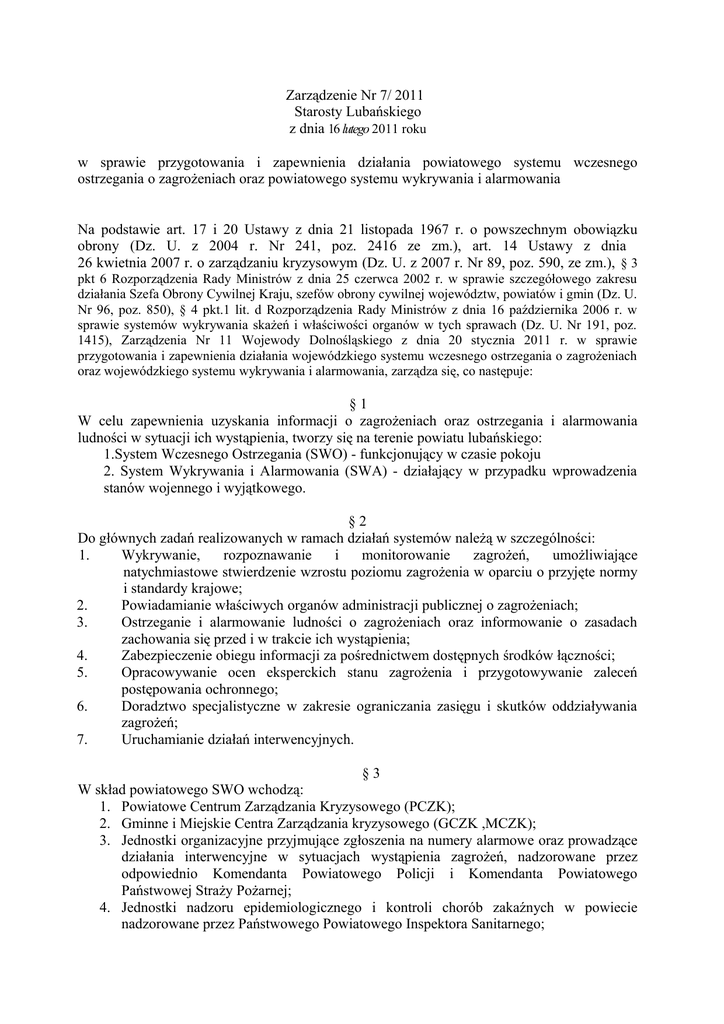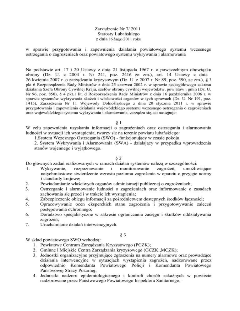 Zarządzenie Nr 7/ 2011 Starosty Lubańskiego z dnia 16 lutego 2011 roku w sprawie przygotowania i zapewnienia działania powiatowego systemu wczesnego ostrzegania o zagrożeniach oraz powiatowego systemu wykrywania i alarmowania Na podstawie art. 17 i 20 Ustawy z dnia 21 listopada 1967 r. o powszechnym obowiązku obrony (Dz. U. z 2004 r. Nr 241, poz. 2416 ze zm.), art. 14 Ustawy z dnia 26 kwietnia 2007 r. o zarządzaniu kryzysowym (Dz. U. z 2007 r. Nr 89, poz. 590, ze zm.), § 3 pkt 6 Rozporządzenia Rady Ministrów z dnia 25 czerwca 2002 r. w sprawie szczegółowego zakresu działania Szefa Obrony Cywilnej Kraju, szefów obrony cywilnej województw, powiatów i gmin (Dz. U. Nr 96, poz. 850), § 4 pkt.1 lit. d Rozporządzenia Rady Ministrów z dnia 16 października 2006 r. w sprawie systemów wykrywania skażeń i właściwości organów w tych sprawach (Dz. U. Nr 191, poz. 1415), Zarządzenia Nr 11 Wojewody Dolnośląskiego z dnia 20 stycznia 2011 r. w sprawie przygotowania i zapewnienia działania wojewódzkiego systemu wczesnego ostrzegania o zagrożeniach oraz wojewódzkiego systemu wykrywania i alarmowania, zarządza się, co następuje: §1 W celu zapewnienia uzyskania informacji o zagrożeniach oraz ostrzegania i alarmowania ludności w sytuacji ich wystąpienia, tworzy się na terenie powiatu lubańskiego: 1.System Wczesnego Ostrzegania (SWO) - funkcjonujący w czasie pokoju 2. System Wykrywania i Alarmowania (SWA) - działający w przypadku wprowadzenia stanów wojennego i wyjątkowego. §2 Do głównych zadań realizowanych w ramach działań systemów należą w szczególności: 1. Wykrywanie, rozpoznawanie i monitorowanie zagrożeń, umożliwiające natychmiastowe stwierdzenie wzrostu poziomu zagrożenia w oparciu o przyjęte normy i standardy krajowe; 2. Powiadamianie właściwych organów administracji publicznej o zagrożeniach; 3. Ostrzeganie i alarmowanie ludności o zagrożeniach oraz informowanie o zasadach zachowania się przed i w trakcie ich wystąpienia; 4. Zabezpieczenie obiegu informacji za pośrednictwem dostępnych środków łączności; 5. Opracowywanie ocen eksperckich stanu zagrożenia i przygotowywanie zaleceń postępowania ochronnego; 6. Doradztwo specjalistyczne w zakresie ograniczania zasięgu i skutków oddziaływania zagrożeń; 7. Uruchamianie działań interwencyjnych. §3 W skład powiatowego SWO wchodzą: 1. Powiatowe Centrum Zarządzania Kryzysowego (PCZK); 2. Gminne i Miejskie Centra Zarządzania kryzysowego (GCZK ,MCZK); 3. Jednostki organizacyjne przyjmujące zgłoszenia na numery alarmowe oraz prowadzące działania interwencyjne w sytuacjach wystąpienia zagrożeń, nadzorowane przez odpowiednio Komendanta Powiatowego Policji i Komendanta Powiatowego Państwowej Straży Pożarnej; 4. Jednostki nadzoru epidemiologicznego i kontroli chorób zakaźnych w powiecie nadzorowane przez Państwowego Powiatowego Inspektora Sanitarnego; 5. Jednostki monitorowania chorób odzwierzęcych i odzwierzęcych czynników chorobotwórczych oraz badań kontrolnych zakażeń zwierząt - nadzorowane przez Powiatowego Lekarza Weterynarii; 6. Wydział Środowiska i Rolnictwa Starostwa Powiatowego w Lubaniu; 7. Nadawcy programów radiowych i telewizyjnych; 8. Ośrodek Szkoleń Specjalistycznych Straży Granicznej w Lubaniu 9. Jednostki Ochotniczych Straży Pożarnych §4 Jednostki i instytucje wchodzące w skład SWO zobowiązuje się do wzajemnej wymiany informacji uzyskanych w toku własnej działalności statutowej, mających bezpośredni lub pośredni związek z wystąpieniem zagrożeń ludności lub środowiska. §5 Schemat organizacyjny SWO oraz obiegu informacji, przedstawia załącznik nr 1. §6 Włączenie jednostek i instytucji do SWO nie zmienia ich służbowego podporządkowania i zakresu realizowanych zadań. §7 Elementy organizacyjne powiatowego SWA stanowią: 1. 2. 3. 4. 5. 6. 7. 8. 9. Powiatowe Centrum Zarządzania Kryzysowego (PCZK); Gminne i Miejskie Centra Zarządzania kryzysowego (GCZK ,MCZK): Jednostki organizacyjne przyjmujące zgłoszenia na numery alarmowe oraz prowadzące działania interwencyjne w sytuacjach wystąpienia zagrożeń, nadzorowane przez odpowiednio Komendanta Powiatowego Policji i Komendanta Powiatowego Państwowej Straży Pożarnej; Jednostki nadzoru epidemiologicznego i kontroli chorób zakaźnych w powiecie nadzorowane przez Państwowego Powiatowego Inspektora Sanitarnego; Jednostki monitorowania chorób odzwierzęcych i odzwierzęcych czynników chorobotwórczych oraz badań kontrolnych zakażeń zwierząt - nadzorowane przez Powiatowego Lekarza Weterynarii; Wydział Środowiska i Rolnictwa Starostwa Powiatowego w Lubaniu; Nadawcy programów radiowych i telewizyjnych; Ośrodek Szkoleń Specjalistycznych Straży Granicznej w Lubaniu Jednostki Ochotniczych Straży Pożarnych §8 Schemat organizacyjny SWA oraz obiegu informacji przedstawia załącznik nr 2. §9 Miejscy i gminni szefowie obrony cywilnej zapewnią nieprzerwaną pracę SWA, z chwilą jego uruchomienia, na swoich obszarach działania. § 10 Dla zapewnienia prawidłowego funkcjonowania SWA, należy obsady osobowe tych elementów reklamować od obowiązku czynnej służby wojskowej w razie ogłoszenia mobilizacji i w czasie wojny. § 11 Informacje uzyskane w ramach działania systemów, dotyczące występowania zagrożeń wymagających podjęcia szczególnych działań, w tym ostrzegania i alarmowania ludności, organy i jednostki organizacyjne wymienione w §3 i §7 niezwłocznie przekazują do Powiatowego Centrum Zarządzania Kryzysowego. § 12 Koordynację działań w ramach systemów przejmuje PCZK, przy wystąpieniu zdarzenia wykraczającego poza obszar jednej gminy. § 13 Szef Obrony Cywilnej Powiatu, poprzez Centrum Zarządzania Kryzysowego, współdziała ze środkami masowego przekazu, o zasięgu regionalnym. § 14 Za przygotowanie elementów organizacyjnych systemów do realizacji zadań, o których mowa w § 2, odpowiedzialne są w zakresie swoich komp