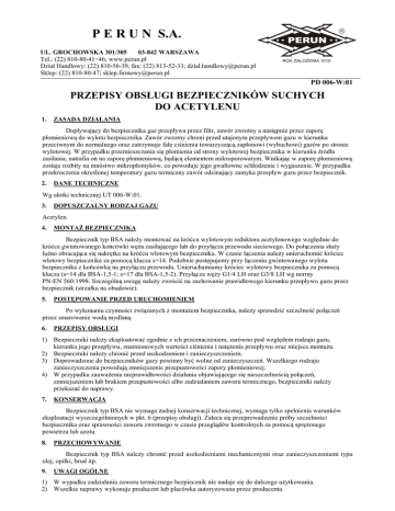 P E R U N S.A. UL. GROCHOWSKA 301/305 03-842 WARSZAWA Tel.: (22) 810-80-41÷46; www.perun.pl Dział Handlowy: (22) 810-56-39, fax: (22) 813-52-33; [email protected] Sklep: (22) 810-80-47; [email protected] PD 006-W:01 PRZEPISY OBSŁUGI BEZPIECZNIKÓW SUCHYCH DO ACETYLENU 1. ZASADA DZIAŁANIA Dopływający do bezpiecznika gaz przepływa przez filtr, zawór zwrotny a następnie przez zaporę płomieniową do wylotu bezpiecznika. Zawór zwrotny chroni przed utajonym przepływem gazu w kierunku przeciwnym do normalnego oraz zatrzymuje falę ciśnienia towarzyszącą zapłonowi (wybuchowi) gazów po stronie wylotowej. W przypadku przemieszczania się płomienia od strony wylotowej bezpiecznika w kierunku źródła zasilania, natrafia on na zaporę płomieniową, będącą elementem mikroporowatym. Wnikając w zaporę płomieniową zostaje rozbity na mnóstwo mikropłomyków, co powoduje jego gwałtowne schłodzenie i wygaszenie. W przypadku przekroczenia określonej temperatury gazu termiczny zawór odcinający zamyka przepływ gazu przez bezpiecznik. 2. DANE TECHNICZNE Wg ulotki technicznej UT 006-W:01. 3. DOPUSZCZALNY RODZAJ GAZU Acetylen. 4. MONTAŻ BEZPIECZNIKA Bezpiecznik typ BSA należy montować na króćcu wylotowym reduktora acetylenowego względnie do króćca gwintowanego końcówki węża zasilającego lub do przyłącza przewodu sieciowego. Do połączenia służy luźno obracająca się nakrętka na króćcu wlotowym bezpiecznika. W czasie łączenia należy unieruchomić króciec wlotowy bezpiecznika za pomocą klucza s=14. Podobnie postępujemy przy łączeniu gwintowanego wylotu bezpiecznika z końcówką na przyłączu przewodu. Unieruchamiamy króciec wylotowy bezpiecznika za pomocą klucza (s=14 dla BSA-1,5-1; s=17 dla BSA-1,5-2). Przyłącza węży G1/4 LH oraz G3/8 LH wg normy PN-EN 560:1998. Szczególną uwagę należy zwrócić na zachowanie prawidłowego kierunku przepływu gazu przez bezpiecznik (strzałka na obudowie). 5. POSTĘPOWANIE PRZED URUCHOMIENIEM Po wykonaniu czynności związanych z montażem bezpiecznika, należy sprawdzić szczelność połączeń przez smarowanie wodą mydlaną. 6. PRZEPISY OBSŁUGI 1) Bezpieczniki należy eksploatować zgodnie z ich przeznaczeniem, zarówno pod względem rodzaju gazu, kierunku jego przepływu, znamionowych wartości ciśnienia i natężenia przepływu oraz miejsca montażu. 2) Bezpieczniki należy chronić przed uszkodzeniem i zanieczyszczeniem. 3) Doprowadzone do bezpieczników gazy powinny być wolne od zanieczyszczeń. Wszelkiego rodzaju zanieczyszczenia powodują zmniejszenie przepustowości zapory płomieniowej. 4) W przypadku zauważenia nieprawidłowości działania objawiającego się nieszczelnością połączeń, zmniejszeniem lub brakiem przepustowości albo zadziałaniem zaworu termicznego, bezpieczniki należy przekazać do naprawy. 7. KONSERWACJA Bezpiecznik typ BSA nie wymaga żadnej konserwacji technicznej, wymaga tylko spełnienia warunków eksploatacji wyszczególnionych w pkt. 6 (przepisy obsługi). Zaleca się przeprowadzenie próby szczelności bezpiecznika oraz sprawności zaworu zwrotnego w czasie przeglądów kontrolnych za pomocą sprężonego powietrza lub azotu. 8. PRZECHOWYWANIE Bezpiecznik typ BSA należy chronić przed uszkodzeniami mechanicznymi oraz zanieczyszczeniami typu olej, opiłki, brud itp. 9. UWAGI OGÓLNE 1) W wypadku zadziałania zaworu termicznego bezpiecznik nie nadaje się do dalszego użytkowania. 2) Wszelkie naprawy wykonuje producent lub placówka autoryzowana przez producenta.
