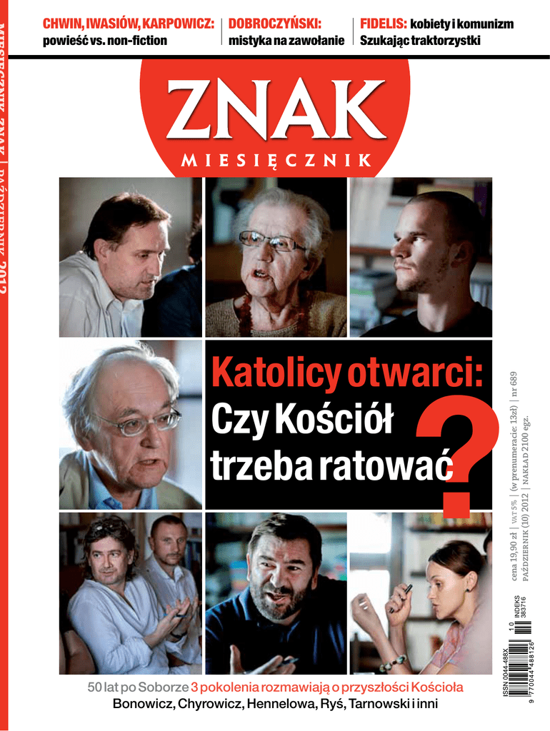 Fidelis: kobiety i komunizm powieść vs. non-fiction Szukając traktorzystki mistyka na zawołanie Katolicy otwarci: Czy Kościół trzeba ratować indeks 383716 ? cena 19,90 zł | vat 5% | (w prenumeracie: 13zł) | nr 689 październik (10) 2012 | nakład 2100 egz. Chwin, Iwasiów, Karpowicz: Dobroczyński: 50 lat po Soborze 3 pokolenia rozmawiają o przyszłości Kościoła Bonowicz, Chyrowicz, Hennelowa, Ryś, Tarnowski i inni 2 PAŹDZIERNIK 2012 nr 689 TEMAT MIESIĄCA 6 10 16 22 28 W tym miesiącu mija 50 lat od rozpoczęcia obrad II Soboru Watykańskiego. Czy dziś Kościół znów potrzebuje odnowy? Na czym polegają jego najważniejsze problemy? Co myślą o Kościele w Polsce wierzący? Ankieta: Kryzys w Kościele?, Maria Poniewierska, s. Barbara Chyrowicz SSPS Katedra Kłamstwa. Kryzys katolicyzmu w Irlandii, ks. Martin Henry „Interesuje mnie Kościół, który się dzieje”, Z bp. Grzegorzem Rysiem rozmawia Dominika Kozłowska Ankieta cd.: Kryzys w Kościele?, o. Wacław Oszajca SJ, o. Dominik Jurczak OP, Arek Gruszczyński, Karol Kleczka Debata „Znaku” Czy Kościół potrafi się dziś odnawiać? DEBATy 42 50 55 58 61 63 66 Kiedy zachęcano kobiety do wybierania zawodów tradycyjnie „męskich”, nie prowadzono analogicznej akcji promującej „kobiece” zajęcia wśród mężczyzn. Komunizm stworzył swoją własną patriarchalną hierarchię, często związaną z hierarchią w produkcji Szukając traktorzystki – kobiety i komunizm, Małgorzata Fidelis Transnarodowe ścieżki, Z Januszem Muchą rozmawia Marta Duch-Dyngosz Kryzys powieści szaleje nad Polską, Stefan Chwin Jak okrągła jest ta płaska Ziemia, Ignacy Karpowicz Powieściowość „książki”, Inga Iwasiów Eskapizm od kryzysu?, Michał Cetnarowski Nieodzowność hreczkosieja-awangardzisty, Jakub Lubelski 4 Czy Kościół trzeba ratować? STAŁE RUBRYKI 90 Alber Gorzkowski: Filolog czyta Biblię 105 Marek Skwarnicki: Noc mediolańska 127 Jerzy Illg: „Wzywany czy niewzywany...” idee 78 80 84 87 LKZ 94 103 106 110 113 116 119 128 Edytorstwo to powrót do korzeni humanistyki. Praca edytora polega na przywracaniu pamięci kulturze. Trafne interpretacje można budować tylko na dobrym wydaniach. Czy mamy takie w Polsce? Dzieła na wydanie, Łukasz Garbal. Maria Prussak, Piotr Kłoczowski, Zdzisław Kudelski, Grażyna Borkowska, Józef Fert, Józef Święch Edytorskie rekomendacje, Łukasz Garbal Podzwonne dla przyjaźni, Anna Arno Metamorfozy „bez-wiednego kapłana”, Łukasz Tischner Gdy pieniądz znaczył niewiele…, Krzysztof Wołodźko Nowoczesność pieniądza, Paweł Tomczok Mistrzynie pustyni, Katarzyna Sokołowska Prywatna Liturgia, Krystyna Strączek 42 55 Szukając traktorzystki – kobiety i komunizm Kryzys powieści szaleje nad Polską fot. Kacper Kowalski/Forum, Andrzej Wiernicki/Forum, Dominik Sadowski/Agencja Gazeta okładka fot. bogdan krężel 70 Doświadczenie wykraczania poza siebie niegdyś nierozerwalnie związane z sacrum, dziś niekoniecznie musi przybierać formy przeżycia religijnego. Czy uczestnictwo w imprezie techno naśladuje znany w klasycznej duchowości wzorzec participation mystique? Rozmowa otwiera nowy cykl „Znaku” pt. „Lęki współczesności” Nieświęta mistyka, z Bartłomiejem Dobroczyńskim rozmawia Olga Drenda W drodze do pojednania, Janusz Poniewierski Etyczne zobowiązanie, Paweł Śpiewak Pojednanie tożsamością Kościoła, bp Grzegorz Ryś Nie ma łatwego przebaczenia, Anna Wolff-Powęska 3 Dominika Kozłowska Świadczyć znaczy doświadczyć „C ul. Tadeusza Kościuszki 37, 30‒105 Kraków tel. (12) 61 99 530, fax (12) 61 99 502 www.miesiecznik.znak.com.pl e-mail: [email protected] redakcja: Marta Duch-Dyngosz, Dominika Kozłowska (redaktor naczelna), Janusz Poniewierski, Adam Puchejda, Justyna Siemienowicz, Marcin Sikorski, Krystyna Strączek, Karol Tarnowski, Magdalena Wojaczek (sekretarz redakcji), Henryk Woźniakowski, Marzena Zdanowska zespół: Wojciech Bonowicz, Bohdan Cywiński, Tomasz Fiałkowski, Tadeusz Gadacz, Jarosław Gowin, Stanisław Grygiel, ks. Michał Heller, Wacław Hryniewicz OMI, Piotr Kłodkowski, ks. Jan Kracik, Janina Ochojska-Okońska, bp Grzegorz Ryś, Marek Skwarnicki, Władysław Stróżewski, Stefan Wilkanowicz, Jacek Woźniakowski współpraca: Paulina Bulska, Agnieszka Goławska, Jacek Maj, Elżbieta Kot, Cezary Kościelniak, Jolanta Prochowicz, Miłosz Puczydłowski, Szymon Szczęch opieka artystyczna: Władysław Buchner projekt graficzny pisma: Marek Zalejski/Studio Q produkcja: Beata Czarkowska, Barbara Gąsiorowska, Urszula Horecka, druk: Drukarnia Colonel, Kraków, ul. Dąbrowskiego 16 reklama: Marcin Sikorski, tel. (12) 61 99 500, e-mail: [email protected] prenumerata: Joanna Dyląg, tel. (12) 61 99 569, e-mail: [email protected] Redakcja nie zwraca tekstów niezamówionych oraz zastrzega sobie prawo ich redagowania i skracania. Redakcja nie odpowiada za treść zamieszczanych ogłoszeń. Rozpowszechnianie redakcyjnych materiałów publicystycznych bez zgody wydawcy jest zabronione. Dofinansowano ze środków Ministerstwa Kultury i Dziedzictwa Narodowego w ramach programu operacyjnego „Promocja czytelnictwa. Rozwój czasopism kulturalnych” hrześcijaństwo to nie doktryna” pisaliśmy w wakacyjnym numerze miesięcznika „Znak”. Podkreślaliśmy wówczas, że choć chrześcijaństwo może być i bywa traktowane jako zespół przekonań i reguł moralnych, to jednak tak rozumiana prawda chrześcijaństwa pozwala uchwycić jedynie zewnętrzną, doktrynalną stronę religii. Karol Tarnowski, jeden z uczestników debaty „Znaku” poświęconej Kościołowi, której zapis publikujemy w Temacie Miesiąca, podkreśla, że prawda zewnętrzna religii powinna inicjować i pobudzać do odkrycia jej wewnętrznej prawdy, czyli – jak zgodnie podkreślają Tarnowski i bp Grzegorz Ryś – chrześcijańskiej miłości. To właśnie ona, a nie siła racjonalnych argumentów przemawiających na rzecz słus
