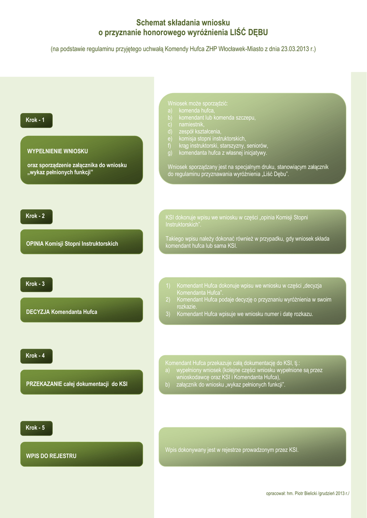 Schemat składania wniosku o przyznanie honorowego wyróżnienia LIŚĆ DĘBU (na podstawie regulaminu przyjętego uchwałą Komendy Hufca ZHP Włocławek-Miasto z dnia 23.03.2013 r.) WYPEŁNIENIE WNIOSKU Wniosek może sporządzić: a) komenda hufca, b) komendant lub komenda szczepu, c) namiestnik, d) zespół kształcenia, e) komisja stopni instruktorskich, f) krąg instruktorski, starszyzny, seniorów, g) komendanta hufca z własnej inicjatywy. oraz sporządzenie załącznika do wniosku „wykaz pełnionych funkcji” Wniosek sporządzany jest na specjalnym druku, stanowiącym załącznik do regulaminu przyznawania wyróżnienia „Liść Dębu”. Krok - 1 Krok - 2 KSI dokonuje wpisu we wniosku w części „opinia Komisji Stopni Instruktorskich”. OPINIA Komisji Stopni Instruktorskich Takiego wpisu należy dokonać również w przypadku, gdy wniosek składa komendant hufca lub sama KSI. Krok - 3 1) 2) DECYZJA Komendanta Hufca 3) Komendant Hufca dokonuje wpisu we wniosku w części „decyzja Komendanta Hufca”. Komendant Hufca podaje decyzję o przyznaniu wyróżnienia w swoim rozkazie. Komendant Hufca wpisuje we wniosku numer i datę rozkazu. Krok - 4 PRZEKAZANIE całej dokumentacji do KSI Komendant Hufca przekazuje całą dokumentację do KSI, tj.: a) wypełniony wniosek (kolejne części wniosku wypełnione są przez wnioskodawcę oraz KSI i Komendanta Hufca), b) załącznik do wniosku „wykaz pełnionych funkcji”. Krok - 5 WPIS DO REJESTRU Wpis dokonywany jest w rejestrze prowadzonym przez KSI. opracował: hm. Piotr Bielicki /grudzień 2013 r./