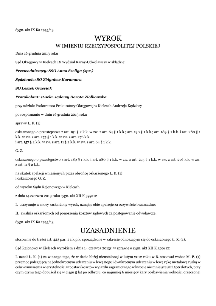 Sygn. akt IX Ka 1745/13 WYROK W IMIENIU RZECZYPOSPOLITEJ POLSKIEJ Dnia 16 grudnia 2013 roku Sąd Okręgowy w Kielcach IX Wydział Karny-Odwoławczy w składzie: Przewodniczący: SSO Anna Szeliga (spr.) Sędziowie: SO Zbigniew Karamara SO Leszek Grzesiak Protokolant: st.sekr.sądowy Dorota Ziółkowska przy udziale Prokuratora Prokuratury Okręgowej w Kielcach Andrzeja Kędziory po rozpoznaniu w dniu 16 grudnia 2013 roku sprawy Ł. K. (1) oskarżonego o przestępstwa z art. 191 § 2 k.k. w zw. z art. 64 § 1 k.k.; art. 190 § 1 k.k.; art. 189 § 1 k.k. i art. 280 § 1 k.k. w zw. z art. 275 § 1 k.k. w zw. z art. 276 k.k. i art. 157 § 2 k.k. w zw. z art. 11 § 2 k.k. w zw. z art. 64 § 1 k.k. G. Z. oskarżonego o przestępstwo z art. 189 § 1 k.k. i art. 280 § 1 k.k. w zw. z art. 275 § 1 k.k. w zw. z art. 276 k.k. w zw. z art. 11 § 2 k.k. na skutek apelacji wniesionych przez obrońcę oskarżonego Ł. K. (1) i oskarżonego G. Z. od wyroku Sądu Rejonowego w Kielcach z dnia 14 czerwca 2013 roku sygn. akt XII K 399/12 I. utrzymuje w mocy zaskarżony wyrok, uznając obie apelacje za oczywiście bezzasadne; II. zwalnia oskarżonych od ponoszenia kosztów sądowych za postępowanie odwoławcze. Sygn. akt IX Ka 1745/13 UZASADNIENIE stosownie do treści art. 423 par. 1 a k.p.k. sporządzone w zakresie odnoszącym się do oskarżonego Ł. K. (1). Sąd Rejonowy w Kielcach wyrokiem z dnia 14 czerwca 2013r. w sprawie o sygn. akt XII K 399/12: I. uznał Ł. K. (1) za winnego tego, że w dacie bliżej nieustalonej w lutym 2012 roku w B. stosował wobec M. P. (1) przemoc polegającą na jednokrotnym uderzeniu w lewą nogę i dwukrotnym uderzeniu w lewą rękę metalową rurką w celu wymuszenia wierzytelności w postaci kosztów wyjazdu zagranicznego w kwocie nie mniejszej niż 500 złotych, przy czym czynu tego dopuścił się w ciągu 5 lat po odbyciu, co najmniej 6 miesięcy kary pozbawienia wolności orzeczonej za podobne przestępstwo umyślne wyrokiem Sądu Rejonowego w Kielcach z dnia 30 sierpnia 2005 roku w sprawie IX K 562/05, którą odbywał w okresie od 22 stycznia 2009 roku do dnia 18 listopada 2010 roku tj. przestępstwa z art. 191 par. 2 k.k. w zw. z art. 64 par. 1 k.k. i za to na mocy art. 191 par. 2 k.k. wymierzył Ł. K. (1) karę 1 roku pozbawienia wolności; II. uznał Ł. K. (1) za winnego tego, że w dniu 19 lutego 2012 roku w K. groził M. P. (1) pozbawieniem życia, a groźby te wzbudziły u M. P. (1) uzasadnioną obawę, że będą spełnione tj. przestępstwa z art. 190 par. 1 k.k. i za to na podstawie tego przepisu wymierzył Ł. K. (1) karę 5 miesięcy pozbawienia wolności; III. uznał Ł. K. (1) i G. Z. za winnych tego, że w dniu 19 lutego 2012 roku w K. działając wspólnie i w porozumieniu pozbawili wolności M. P. (1) w ten sposób, że przetrzymywali i przewozili wyżej wymienionego w bagażniku samochodu marki B. (...) o nr rej. (...), a także działając wspólnie i w porozumieniu stosowali wobec M. P. (1) przemoc, w ten sposób, że Ł. K. (1) przytrzymywał, kopał, uderzał ręką M. P. (1) w twarz oraz uderzał M. P. (1) po głowie, rękach i nogach kluczem typu „żabka”, co spowodowało u pokrzywdzonego obrażenia w postaci sińców z obrzękiem na twarzy, kończynach dolnych i górnych, otarć naskórka na kończynach dolnych, które to obrażenia naruszyły czynności narządów ciała M. P. (1) na czas trwający nie dłużej niż 7 dni, a G. Z. przytrzymywał i uderzył ręką w twarz M. P. (1), którą to przemoc oskarżeni stosowali w celu wymuszenia zwrotu wierzytelności Ł. K. (1) w postaci kosztów wyjazdu zagranicznego w kwocie nie mniejszej niż 500 złotych, oraz zabrali portfel wartości 5 złotych z dowodem osobistym oraz dokumentem w postaci decyzji Miejskiego Ośrodka Pomocy Rodzinie dotyczącej przyznania zasiłku, przy czym Ł. K. (1) czynu tego dopuścił się w ciągu 5 lat po odbyciu, co najmniej 6 miesięcy kary pozbawienia wolności orzeczonej za podobne przestępstwo umyślne wyrokiem Sądu Rejonowego w Kielcach z dnia 30 sierpnia 2005 roku w sprawie IX K 562/05, którą odbywał w okresie od 22 stycznia 2009 roku do dnia 18 listopada 2010 roku tj. w stosunku do oskarżonego Ł. K. (1) przestępstwa z art. 189 par. 1 k.k., art. 191 par. 2 k.k., art. 157 par. 2 k.k. w zw. z art. 11 par. 2 k.k. w zw. z art. 64 par. 1 k.k. a w stosunku do oskarżonego G. Z. przestępstwa z art. 189 par. 1 k.k., art. 191 par. 2 k.k., art. 157 par. 2 k.k. w zw. z art. 11 par. 2 k.k. i za to na mocy art. 191 par. 2 k.k. w zw. z art. 11 par. 3 k.k. wymierzył oskarżonemu Ł. K. (1) karę 3 lat pozbawienia wolności a oskarżonemu G. Z. karę 2 lat i 3 miesięcy pozbawienia wolności. Na mocy art. 85 k.k. i art. 86 par. 1 k.k. orzeczone wobec Ł. K. (1) w punktach I, II i III kary pozbawienia wolności połączył i wymierzył mu, jako karę łączną karę 3 lat i 8 miesięcy pozbawienia wolności. Zasądził od Ł. K. (1) i G. Z. na rzecz Skarbu Państwa kwoty po 805 złotych tytułem części kosztów sądowych, zwalniając ich od ponoszenia tych kosztów w pozostałej części. Apelacje od tego wyroku wnieśli obrońca oskarżonego Ł. K. (1) i oskarżony G. Z.. Obrońca oskarżonego Ł. K. (1) zaskarżył wyrok na jego korzyść w całości zarzucając: 1. naruszenie prawa procesowego, które miało wpływ na jego treść, a to art. 7 k.p.k., art. 5 par. 2 k.p.k., art. 410 k.p.k. wynikające z dokonania ustaleń faktycznych z naruszeniem swobodnej oceny dowodów, w szczególności przyznanie wiarygodności i mocy dowodowej zeznaniom pokrzywdzonego, niekonsekwentnym i rażąco niespójnym, opartym zgodnie z twierdzeniami samego pokrzywdzonego w znacznej części na urojeniach wynikających z zaburzeń osobowości będących rezultatem uzależnienia od alkoholu i środków psychoaktywnych a nadto niepełne uwzględnienie dowodów korzystnych dla oskarżonego i interpretację niedających się usunąć wątpliwości na niekorzyść oskarżonego, 2. 