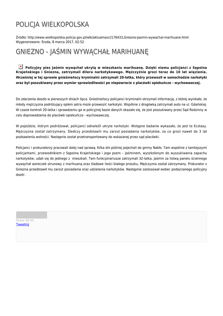 POLICJA WIELKOPOLSKA Źródło: http://www.wielkopolska.policja.gov.pl/wlk/aktualnosci/176433,Gniezno-Jasmin-wywachal-marihuane.html Wygenerowano: Środa, 8 marca 2017, 02:52 GNIEZNO - JAŚMIN WYWĄCHAŁ MARIHUANĘ Policyjny pies Jaśmin wywąchał ukrytą w mieszkaniu marihuanę. Dzięki niemu policjanci z Sępolna Krajeńskiego i Gniezna, zatrzymali dilera narkotykowego. Mężczyźnie grozi teraz do 10 lat więzienia. Wcześniej w tej sprawie gnieźnieńscy kryminalni zatrzymali 20-latka, który przewoził w samochodzie narkotyki oraz był poszukiwany przez wymiar sprawiedliwości po niepowrocie z placówki opiekuńczo - wychowawczej. Do zdarzenia doszło w pierwszych dniach lipca. Gnieźnieńscy policjanci kryminalni otrzymali informację, z której wynikało, że młody mężczyzna podróżujący oplem astra może przewozić narkotyki. Wspólnie z drogówką zatrzymali auto na ul. Gdańskiej. W czasie kontroli 20-latka i sprawdzeniu go w policyjnej bazie danych okazało się, że jest poszukiwany przez Sąd Rodzinny w celu doprowadzenia do placówki opiekuńczo - wychowawczej. W pojeździe, którym podróżował, policjanci odnaleźli ukryte narkotyki. Wstępne badanie wykazało, że jest to Ecstasy. Mężczyzna został zatrzymany. Śledczy przedstawili mu zarzut posiadania narkotyków, za co grozi nawet do 3 lat pozbawienia wolności. Następnie został przetransportowany do wskazanej przez sąd placówki. Policjanci i prokuratorzy pracowali dalej nad sprawą. Kilka dni później pojechali do gminy Nakło. Tam wspólnie z tamtejszymi policjantami, przewodnikiem z Sępolna Krajeńskiego i jego psem – Jaśminem, wyszkolonym do wyszukiwania zapachu narkotyków, udali się do jednego z mieszkań. Tam funkcjonariusze zatrzymali 32-latka. Jaśmin za listwą panelu ściennego wywąchał woreczek strunowy z marihuaną oraz śladowe ilości białego proszku. Mężczyzna został zatrzymany. Prokurator z Gniezna przedstawił mu zarzut posiadania oraz udzielania narkotyków. Następnie zastosował wobec podejrzanego policyjny dozór. Ocena: 0/5 (0) Tweetnij