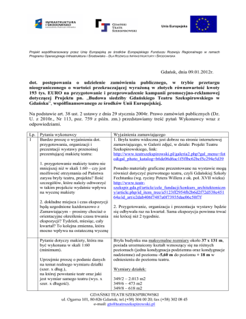 Unia Europejska Europejski Fundusz Projekt współfinansowany przez Unię Europejską ze środków Europejskiego Funduszu Rozwoju Regionalnego w ramach Programu Operacyjnego Infrastruktura i Środowisko - DLA ROZWOJU INFRASTRUKTURY I ŚRODOWISKA Gdańsk, dnia 09.01.2012r. dot. postępowania o udzielenie zamówienia publicznego, w trybie przetargu nieograniczonego o wartości przekraczającej wyrażoną w złotych równowartość kwoty 193 tys. EURO na przygotowanie i przeprowadzenie kampanii promocyjno-reklamowej dotyczącej Projektu pn. „Budowa siedziby Gdańskiego Teatru Szekspirowskiego w Gdańsku”, współfinansowanego ze środków Unii Europejskiej. Na podstawie art. 38 ust. 2 ustawy z dnia 29 stycznia 2004r. Prawo zamówień publicznych (Dz. U. z 2010r., Nr 113, poz. 759 z późn. zm.) przedstawiamy treść pytań Wykonawcy wraz z odpowiedziami. Lp. Pytania wykonawcy 1 Bardzo proszę o wyjaśnienia dot. przygotowania, organizacji i prezentacji wystawy przenośnej prezentującej makietę teatru: 1. przygotowanie makiety teatru nie mniejszej niż w skali 1:60 – czy jest możliwość otrzymania od Państwa zarysu bryły teatru, projektu? Ilość szczegółów, które należy odtworzyć w takim projekcie wydatnie wpływa na wycenę makiety 2. dokładne miejsca i czas ekspozycji będą uzgodnione każdorazowo z Zamawiającym – prosimy chociaż o orientacyjne określenie czasu trwania ekspozycji? Tydzień, miesiąc, cały kwartał? To kolejna zmienna, która mocno wpływa na ostateczną wycenę Pytanie dotyczy makiety, która ma być wykonana w skali 1:60 (minimum). Uprzejmie proszę o podanie danych na temat realnego wymiaru działki (szer. x dług.), na której powstanie teatr oraz jaki jest wymiar samego teatru (wys. x szer. x długość). Wyjaśnienia zamawiającego 1. Bryła teatru widoczna jest dobrze na stronie internetowej zamawiającego, w Galerii zdjęć, w dziale: Projekt Teatru Szekspirowskiego, link: http://www.teatrszekspirowski.pl/galeria2.php?gal_menu=fot o&gal_photo_katalog=b6de06d6ac1f5ffbc62bcf5c294e5d39 Ponadto materiały graficzne prezentowane na wystawie mogą również dotyczyć pierwotnego teatru, czyli Gdańskiej Szkoły Fechtunku (wg. ryciny Petera Willera z ok. poł. XVII wieku) http://www.teatrszekspir.gda.pl/article/cele_fundacji/konkurs_architektoniczn y/article.php/id_item_tree/a5123ff2954fb2b6d2f72d538e451 64a/id_art/e2dab406f7487a0f73935dae06c50f7f 2. Przygotowanie, organizacja i prezentacja wystawy będzie się odbywała raz na kwartał. Sama ekspozycja powinna trwać nie krócej niż 2 tygodnie. Bryła budynku ma maksymalne rozmiary około 37 x 131 m, posiada urozmaicony kształt wznoszący się na różnych poziomach (jedna kondygnacja podziemna oraz kondygnacje nadziemne) od poziomu -5,60 m do poziomu + 18 m w odniesieniu do poziomu teatru. Wymiary działek: 349/2 – 2.013 m2 349/6 – 473 m2 349/8 – 618 m2 GDAŃSKI TEATR SZEKSPIROWSKI ul. Ogarna 101, 80-826 Gdańsk; tel.(+58) 304 00 20; fax (+58) 302 08 45 e-mail: [email protected] Czy makieta ma odzwierciedlać działkę w podanej skali, czy tylko samą bryłę teatru, bez terenów przyległych do niej (zieleń, chodniki, parking naziemnym etc.)? 349/12 – 2.990 m2 Makieta powinna odzwierciedlać działkę z zagospodarowaniem terenu GDAŃSKI TEATR SZEKSPIROWSKI ul. Ogarna 101, 80-826 Gdańsk, tel./fax (+58) 304 00 20