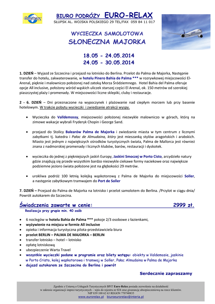 BIURO PODRÓŻY EURO-RELAX SŁUPSK AL. WOJSKA POLSKIEGO 29 TEL/FAX 059 84 11 017 WYCIECZKA SAMOLOTOWA SŁONECZNA MAJORKA 18.05 - 24.05.2014 24.05 - 30.05.2014 1. DZIEŃ – Wyjazd ze Szczecina i przejazd na lotnisko do Berlina. Przelot do Palma de Majorka, Następnie transfer do hotelu, zakwaterowanie, w hotelu Pinero Bahia de Palma *** w rozrywkowej miejscowości ElArenal, pięknie i malowniczo położonej nad zatoką Morza Śródziemnego. Hotel Bahia del Palma oferuje opcje All inclusive, położony wśród wąskich uliczek starszej części El Arenal, ok. 150 metrów od szerokiej piaszczystej plaży i promenady. W miejscowości liczne sklepiki, cluby i restauracje. 2 - 6. DZIEŃ – Dni przeznaczone na wypoczynek i plażowanie nad ciepłym morzem lub przy basenie hotelowym. W trakcie pobytu wycieczki i zwiedzanie atrakcji wyspy. Wycieczka do Valldemossy, miejscowości położonej niezwykle malowniczo w górach, którą na zimowe wakacje wybrali Fryderyk Chopin i George Sand. przejazd do Stolicy Balearów Palma de Majorka i zwiedzanie miasta w tym centrum z licznymi zabytkami tj. katedra i Pałac de Almudaina, który jest mieszanką stylów aragońskich i arabskich. Miasto jest jednym z największych ośrodków turystycznych świata, Palma de Mallorca jest również znana z nadmorskiej promenady i licznych klubów, barów, restauracji i dyskotek. wycieczka do jednej z piękniejszych jaskiń Europy, Jaskini Smoczej w Porto Cisto, arcydzieło natury gdzie znajdują się przede wszystkim bardzo niezwykle ciekawe formy naciekowe oraz największe podziemne jezioro świata położone jest na głębokości 29 metrów. urokliwa podróż 100 letnią kolejką wąskotorową z Palma de Majorka do miejscowości Soller, a następnie zabytkowym tramwajem do Port de Soller 7. DZIEŃ – Przejazd do Palma de Majorka na lotnisko i przelot samolotem do Berlina. /Przylot w ciągu dnia/ Powrót autokarem do Szczecina. Świadczenia zawarte w cenie: 2999 zł. Realizacja przy grupie min. 40 osób 6 noclegów w hotelu Bahia de Palma *** pokoje 2/3 osobowe z łazienkami, wyżywienie na miejscu w formie All inclusive opieka i informacja turystyczna pilota-przedstawiciela biura przelot BERLIN – PALMA DE MAJORKA – BERLIN transfer lotnisko – hotel – lotnisko opłatę lotniskową ubezpieczenie Warta Travel wszystkie wycieczki podane w programie oraz bilety wstępu: obiekty w Valdemosie, jaskinie w Porto Cristo, kolej wąskotorowa i tramwaj w Soller, Pałac Almudaina w Palma de Majorka dojazd autokarem ze Szczecina do Berlina i powrót Serdecznie zapraszamy Zgodnie z Ustawą o Usługach Turystycznych BPiT Euro-Relax posiada zezwolenie na działalność w zakresie organizacji imprez turystycznych – wpis do rejestru nr 024 oraz gwarancję ubezpieczeniową na rzecz klientów. NIP 839 100 62 63 REGON 770740835 www.eurorelax.pl [email protected]