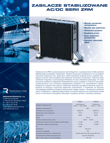 ZASILACZE STABILIZOWANE AC/DC SERII ZRM 4 Wysoka sprawność energetyczna 4 Wysoka moc wyjściowa 4 Chłodzenie pasywne 4 Bezgłośna praca 4 Duża stabilność parametrów 4 Łączenie równoległe wyjść Zasilacze serii ZRM to zaawansowane technologicznie i wysokosprawne źródła zasilania pokładowego do pojazdów wojskowych. Wysoka sprawność energetyczna ma szczególne znaczenie zwłaszcza tam, gdzie ilość ciepła wydzielana podczas pracy urządzeń zasilających stanowi duże obciążenie dla systemów wentylacji i klimatyzacji. Daje ona także możliwość rezygnacji z wymuszonego chłodzenia na rzecz chłodzenia pasywnego. To z kolei korzystnie wpływa na zwiększenie niezawodności pracy urządzeń w trudnych warunkach środowiskowych oraz zmniejsza niedogodności związane z ich użytkowaniem (hałas). Wydajności prądowe oferowanych jednostek spełniają wymagania odnośnie zapotrzebowania na energię w ogromnej większości zastosowań, a możliwość ich łączenia równoległego dodatkowo zwiększa elastyczność całego systemu. Wymienione wcześniej cechy w połączeniu z całkowitą odpornością na zwarcie wyjścia oraz możliwością trwałej pracy w warunkach przeciążenia decydują o wysokiej wartości użytkowej zasilaczy. Radiotechnika Marketing Sp. z o.o. 55-080 Kąty Wrocławskie ul. Fabryczna 20, Pietrzykowice, Poland tel. +48 71/ 327 07 00 fax +48 71/ 327 08 00 e-mail: [email protected] www.radiotechnika.com.pl Napięcie wejściowe AC ZRM01 ZRM02 Jednofazowe 230 V +10% -20% Trójfazowe 400 V ± 10% Napięcie wyjściowe DC Nominalna moc wyjściowa Maksymalny prąd wyjściowy Sprawność 28 V 4000 W 6500 W 170 A 310 A 93% 95% Waga 44 kg Zakres temperaturowy pracy -30oC ÷ +50oC Stabilność temperaturowa napięcia wyjściowego ≤ 0,3% ≤ 0,3% Przydźwięk napięcia wyjściowego ≤ 0,5% ≤ 0,9% PF Chłodzenie Łączenie równoległe 0,98 Pasywne Tak Narażenia klimatyczne i mechaniczne Wg NO-06-A103 dla grupy N8-UZ-II Kompatybilność elektromagnetyczna Wg NO-06-A200 Maks. prąd upływu w sieci zasilającej < 30 mA Podstawową aplikacją dla zasilaczy ZRM są pokładowe systemy zasilania akumulatorowego (24 V DC) w pojazdach zarówno kołowych, jak i gąsiennicowych. Zapewniają one niezbędne do pracy wszelkich urządzeń elektronicznych zasilanie w momencie, gdy silnik pojazdu jest wyłączony i nie pracuje alternator, a źródło zasilania pojazdu pochodzi z zewnątrz (agregat prądotwórczy, polowa stacja zasilania, stacjonarna instalacja elektryczna). Służą one również do ładowania akumulatorów zasilających pokładową aparaturę elektroniczną, a po zastosowaniu Układu Sprzęgającego Akumulatory (USA) także do ładowania akumulatorów pojazdowych. Umiejscowienie ZRM w pojazdowym systemie zasilania IRM TPZ ZRM APU FRM SRM LVD USA G LRM AKUMULATORY POJAZDOWE PRM PS LRM AKUMULATORY ELEKTRONIKI Przedstawione rozwiązanie jest kompletnym i łatwo konfigurowalnym, pokładowym systemem zasilania oraz dystrybucji energii elektrycznej, dedykowanym do pojazdów wojskowych. W jego skład wchodzą urządzenia i podzespoły, takie jak: zasilacze z serii ZRM (AC/DC), przetwornice PRM (DC/DC), falowniki IRM (DC/AC), układy dystrybucji energii SRM, specjalizowane wiązki kablowe, filtry przeciwzakłóceniowe FRM i inne. W skład systemu wchodzą również urządzenia dbające o kondycję zespołów akumulatorów, zarówno pojazdowych jak i tych wykorzystywanych do zasilania pokładowych systemów elektronicznych. Do grupy tych urządzeń należy m.in. seria układów ładowania akumulatorów LRM oraz układ nadzoru napięcia LVD, który może być integrowany z wieloma innymi urządzeniami, bezpośrednio współpracującymi z akumulatorami. Do ich podstawowych zadań należą: ograniczenie maksymalnego prądu ładowania, uzależnienie napięcia ładowania od temperatury oraz zapobieganie nadmiernemu rozładowaniu akumulatorów. Są to powszechnie występujące problemy, które prowadzą do znacznego ograniczenia żywotności zdecydowanej większości stosowanych dzisiaj akumulatorów. System ten zawiera również: tablice przyłączy zasilania (TPZ) pełniące funkcję interfejsu ze źródłami energii pochodzącymi z zewnątrz pojazdu, układy sprzęgające akumulatory (USA) zapobiegające konsekwencjom wynikającym z rozruchu silnika w pojazdach, gdzie zastosowano dwa zespoły akumulatorów (pojazdowe i elektroniki), czy pulpity sterownia (PS), których zadaniem jest monitoring i umożliwienie zarządzania całym systemem zasilania. Cechą wyróżniającą elementy systemu są zastosowane specjalizowane technologie przetwarzania energii elektrycznej. Pozwalają one blokom odpowiedzialnym za konwersję energii uzyskać sprawności na poziomie nawet 98%. To powoduje, że całkowita sprawność energetyczna kompletnych urządzeń wyposażonych w zaawansowane układy filtrów i zabezpieczeń jest nadal na bardzo wysokim poziomie. Taka wysoka efektywność daje możliwość rezygnacji z bardzo zawodnego chłodzenia wykorzystującego wentylatory, a dla użytkownika oznacza to również bezgłośną pracę i bardzo dużą odporność urządzeń na zapylenie. Wszystkie urządzenia systemu spełniają odnośne wojskowe, normy środowiskowe oraz kompatybilności elektromagnetycznej (EMC).