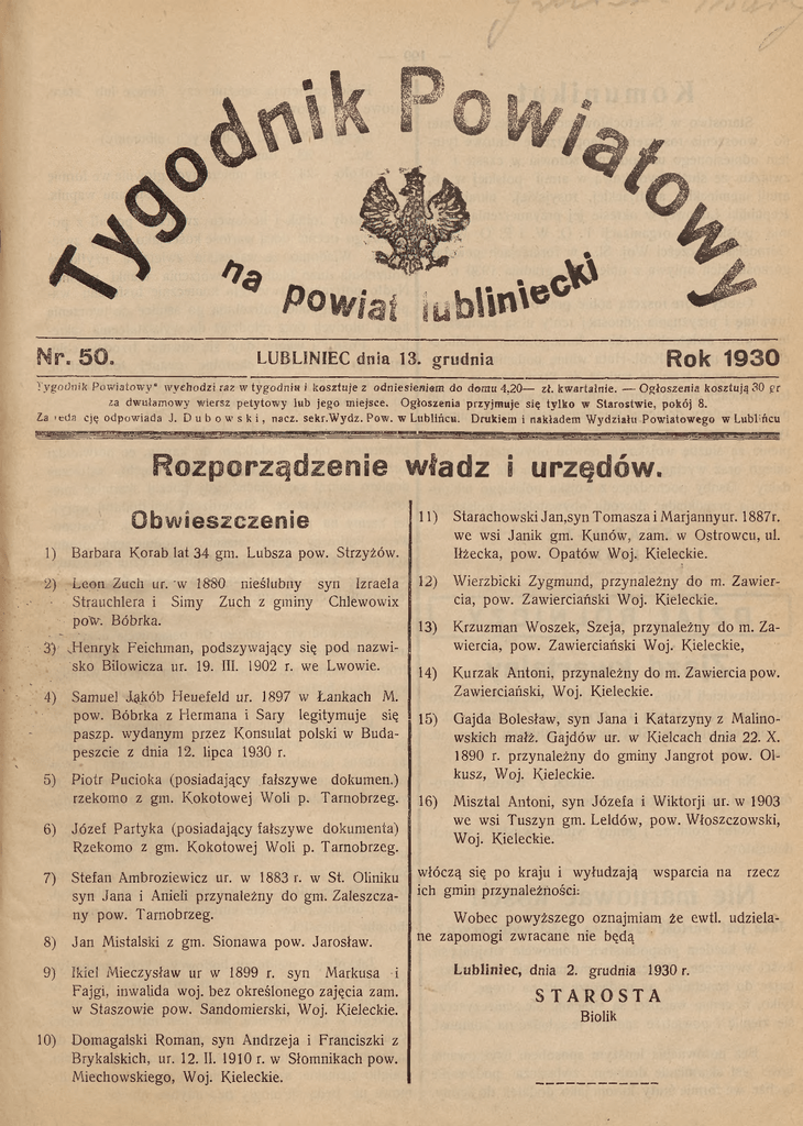 ^tx‘\k Potv/^ : P@wiai i yblin'® Nr. 50. Rok 1930 LUBLINIEC dnia 13. grudnia Tygodnik Powiatowy* wychodzi raz w tygodniu i kosztuje z odniesieniem do domu 4.20— zt. kwartalnie. — Ogłoszenia kosztują 30 gr za dwutomowy wiersz petytowy łub jego miejsce. Ogłoszenia przyjmuje się tylko w Starostwie, pokój 8. La > eda cję odpowiada J. D u b o w s k i, nacz. sekr.Wydz. Pow. w Lublińcu. Drukiem i nakładem Wydziału Powiatowego w Lublińcu Rozporządzenie władz i urzędów. Obwieszczenie 11) Starachowski Jan,syn Tomasza i Marjannyur. 1887r. we wsi Janik gm. Kunów, zam. w Ostrowcu, ul. Iłżecka, pow. Opatów Woj. Kieleckie. 1) Barbara Korab lat 34 gm. Lubsza pow. Strzyżów. 2) Leon Zuch ur. w 1880 nieślubny syn Izraela Strauchlera i Simy Zuch z gminy Chlewowix poty. Bobrka. 12) Wierzbicki Zygmund, przynależny do m. Zawier cia, pow. Zawierciański Woj. Kieleckie. 13) 3) JHenryk Feichman, podszywający się pod nazwi sko Bilowicza ur. 19. III. 1902 r. we Lwowie. Krzuzman Woszek, Szeja, przynależny do m. Za wiercia, pow. Zawierciański Woj. Kieleckie, 14) Kurzak Antoni, przynależny do m. Zawiercia pow. Zawierciański, Woj. Kieleckie. 15) Gajda Bolesław, syn Jana i Katarzyny z Malino wskich małż. Gajdów ur. w Kielcach dnia 22. X. 1890 r. przynależny do gminy Jangrot pow. Ol kusz, Woj. Kieleckie. 16) Misztal Antoni, syn Józefa i Wiktorji ur. w 1903 we wsi Tuszyn gm. Leldów, pow. Włoszczowski, Woj. Kieleckie. 4) 5) Samuel Jąkób Heuefeld ur. 1897 w Lankach M. pow. Bobrka z Hermana i Sary legitymuje się paszp. wydanym przez Konsulat polski w Buda peszcie z dnia 12. lipca 1930 r. Piotr Pucioka (posiadający fałszywe doku men.) rzekomo z gm. Kokotowej Woli p. Tarnobrzeg. 6) Józef Partyka (posiadający fałszywe dokumenta) Rzekomo z gm. Kokotowej Woli p. Tarnobrzeg. 7) Stefan Ambroziewicz ur. w 1883 r. w St. Gliniku syn Jana i Anieli przynależny do gm. Zaleszczany pow. Tarnobrzeg. 8) Jan Mistalski z gm. Sionawa pow. Jarosław. 9) Ikiel Mieczysław ur w 1899 r. syn Markusa i Fajgi, inwalida woj. bez określonego zajęcia z am. w Staszowie pow. Sandomierski, Woj. Kieleckie. 10) Domagalski Roman, syn Andrzeja i Franciszki z Brykalskich, ur. 12. II. 1910 r. w Słomnikach pow. Miechowskiego, Woj. Kieleckie. włóczą się po kraju i wyłudzają wsparcia na ich gmin przynależności: rzecz Wobec powyższego oznajmiam że ewtl. udziela ne zapomogi zwracane nie będą Lubliniec, dnia 2. grudnia 1930 r. STAROSTA Biolik 199 Komunikat Kości zawierają zależnie czy świeże lub surowe czy gotowane. Starostwo w Świętochłowicach podaje, że termin do wnoszenia roszczeń o zaopatrzenie rentowe tytu łem odniesionego uszkodzenia zdrowia w czasie i w związku ze służbą wojskową w armji polskiej w b, armji niemieckiej, austrjackiej, rosyjskiej, ukraińskiej Republiki Ludowej w okresie jej przymierzenia z armją polską w organizacji T. O. W. i P. O. W. na Górnośląskiej części Woj. Śl. i w formacjach powstań górnośląskich upływa z dniem 31. grudnia 1930 r. Osoby które roszczą sobie prawo do uznania za inwalidę i przyznania odnośnej renty a są zamieszka łe w pow. świętochłowickim, tarnogórskim, lublinieckim oraz mieście Król.-Huta winne podania swe w wyznaczonym terminie wnieść do Starostwa w Świę tochłowicach referat spraw inwalidów wojennych. Do podania należy dołączyć wszelkie posiadane dokumen ty stwierdzające przyczynowy związek obecnego cier pienia za służbę wojskową, dowód obywatelstwa pol skiego oraz wyciąg z metryk urodzenia dla całej ro' dżiny. Osoby pochodzące z wojska polskiego nie po trzebują przedkładać dowodu obywatelstwa polskiego. STAROSTA Biolik DZIAŁ ROLNICZY Zjazd kwartalny przedstawicieli Kółek Rolniczych powiatu lublinieckiego odbędzie się w środę 17. grudnia br. o godz 10.30 w sali restauracji p. Stryczka w Lublińcu przy ul. Stalmacha. Na porządku dziennym referat z zakresu ogro dnictwa i sprawy organizacyjne. Kółka Rolnicze i gminy winne delegatów. wysłać swoich Nie marnować kości! Jaka jest wartość użytkowa kości zwięrzęcych? W każdem gospodarstwie domowem znajdują się kości zwierzęce. Najczęściej marnuje się je, wyrzu cając do śmietnika, na podwórze lub na drogę. Nietylko, iż cenne wartości są stracone ale zanieczyszcza się ziemię i powietrze zamiast je składać na kompost. Bez porównania lepszym sposobem użytkowania kości jest skarmianie drobiem, zwłaszcza podawanie tychże we formie śruty kurom jako dodatek do karmy. stare, Okrągło 20% ciał białkowych (albuminy) do 33 „ tłuszczu około 24 „ soli mineralnych głównie we formie fosforanu wapnia. Każdy rolnik i hodowca zwiarząt potrafi z po wyższego ocenić dużą wartość kości jako karmy zwie rzęcej. Wiadomo, że wszystkie zwierzęta użytkowe potrzebują dużo białka do tworzenia tkanki mięsnej. Nadto potrzebują zwierzęta koniecznie fosforanu wa pnia. Szczególnie potrzebują go samice do tworzenia kości młodych oraz młodzież do wykształcenia szkie letu. Fosfor i wapno daje się również trzodzie chle wnej dla zapobieżenia chorobie zwanej łomikostein. Wreszcie dziczyzna potrzebuje obu tych składników do wytworzenia kości i rogu. Dla drobiu są kości mielone idealnym wprost pokarmem, raczej dodatkiem do karmy, co potwierdzi każdy drobiarz, którego chów często wówczas dopiero zaczął się opłacać, gdy począł skarmiać mie lone kości zwierzęce. Stwierdzony jest dodatni wpływ tej karmy na mięsność w porze zimowej. Postępo wemu hodowcy chodzi właśnie o podniesienie produ kcji jaj w zimie, gdyż niewydajność roczna od sztuki, lecz duża ilość jaj zniesionych w zimie decydują o rentowności chowu kur. Niezawodnym środkiem do osiągnięcia dużejnieśności zwłaszcza w porze zimowej jest podawanie drobiowi karmy mineralnej,soli fosforowych i wapnio wych oraz białka. W gospodarstwie wiejskiem i domowem nadarza się sposobność wykorzystania posiadanych kości a n