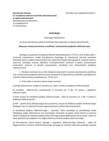 Koordynator Krajowy ds. koordynacji wdrożeń systemów informatycznych w sądach powszechnych Sąd Apelacyjny we Wrocławiu ul. Energetyczna 4 53-330 Wrocław Wrocław, dnia 5 października 2011 r. Instrukcja Krajowego Koordynatora do spraw koordynacji wdrożeń systemów informatycznych w sądach powszechnych, dotycząca zasad przyznawania, weryfikacji i unieważniania podpisów elektronicznych Działając na podstawie zarządzenia Ministra Sprawiedliwości nr 177/11 z dnia 15 lipca 2011 r. w sprawie ustanowienia i zadań Koordynatora Krajowego ds. koordynacji wdrożeń systemów informatycznych w sądach powszechnych oraz utworzenia Zespołu Sterującego ds. realizacji systemu rejestracji przebiegu rozpraw sądowych w postępowaniach cywilnych w sądach powszechnych ustanawiam wytyczne w sprawie przyznawania, weryfikacji oraz unieważniania podpisów elektronicznych: 1. Niniejsza instrukcja ma na celu wskazanie wytycznych w sprawie przyznawania, weryfikacji oraz unieważniania podpisów elektronicznych używanych do opatrywania protokołów sporządzonych w postaci elektronicznej na podstawie art. 157 §1 k.p.c. 2. Przez użyte w instrukcji zwroty należy rozumieć: a) podpis elektroniczny - podpis w znaczeniu art. 3 pkt. 1 ustawy o podpisach elektronicznych; b) certyfikat - elektroniczne zaświadczenie w znaczeniu art. 3 pkt. 10 ustawy o podpisach elektronicznych; c) dane służące do weryfikacji podpisu elektronicznego – dane w znaczeniu art. 3 pkt. 5 ustawy o podpisach elektronicznych; e) PIN - poufne dane zabezpieczające klucz prywatny, służące do składania podpisu elektronicznego składające się z co najmniej 8 losowo wygenerowanych znaków alfanumerycznych; f) weryfikacja podpisu elektronicznego – czynności, które pozwalają na identyfikację osoby składającej podpis elektroniczny oraz pozwalające stwierdzić, że podpis został złożony za pomocą danych służących do składania podpisu elektronicznego przyporządkowanych do tej osoby, a także że dane opatrzone tym podpisem nie uległy zmianie po złożeniu podpisu elektronicznego; g) informatyczny nośnik danych sędziego z nagraniem elektronicznego protokołu – płyta CD wygenerowana z systemu teleinformatycznego służącego do cyfrowej rejestracji przebiegu rozpraw sądowych lub inny informatyczny nośnik danych z adnotacjami protokolanta i prywatnymi adnotacjami sędziego, służący do indywidualnej pracy sędziego. 3. W każdym sądzie, w którym warunki techniczne umożliwiają sporządzanie protokołu rozpraw w postaci elektronicznej powołuje się Administratora Systemu Cyfrowej Rejestracji Przebiegu Rozpraw Sądowych zwanego dalej Administratorem Systemu. Administrator Systemu odpowiada za prawidłową politykę zarządzania podpisami elektronicznymi oraz certyfikatami służącymi do składania podpisów elektronicznych, w tym ich wydawaniem, unieważnianiem oraz przeprowadzaniem procedur weryfikacji oraz polityką bezpieczeństwa danych Systemu Cyfrowej Rejestracji Przebiegu Rozpraw Sądowych. Administratora Systemu powołuje i odwołuje zarządzeniem Prezes Sądu. 4. Podpisy elektroniczne oraz certyfikaty służące do składania podpisów elektronicznych generowane są przez Krajowego Koordynatora do spraw koordynacji wdrożeń systemów informatycznych w sądach powszechnych za pośrednictwem Administratora Systemu zgodnie z wnioskiem opisanym w pkt. 5. Nazwy generowanych certyfikatów określone są podczas tworzenia certyfikatu na podstawie danych dostarczonych przez Administratora Systemu. PIN określany jest przez użytkownika systemu w procesie generowania certyfikatu. 5. Certyfikaty dla pracowników sekretariatu generowane są na wniosek kierownika sekretariatu, natomiast certyfikaty dla sędziów na wniosek przewodniczącego wydziału i przyporządkowane odpowiednio pracownikowi sekretariatu lub sędziemu. 6. Wniosek o wydanie podpisów elektronicznych oraz certyfikatów, a także ich unieważnienie, Administrator Systemu składa w postaci elektronicznej poprzez stronę internetową do Krajowego Koordynatora do spraw wdrożeń systemów informatycznych w sądach. 7. Na wniosek przewodniczącego wydziału lub Prezesa Sądu poprzez Administratora Systemu, Krajowy Koordynator niezwłocznie unieważnia certyfikat. Wniosek przewodniczącego wydziału lub Prezesa Sądu może zostać złożony drogą elektroniczną i opatrzony podpisem elektronicznym weryfikowanym certyfikatem wnioskującego, o którym mowa w niniejszej instrukcji. 8. Centralne Jednostki Sterujące skonfigurowane są w sposób umożliwiający podpisanie protokołu wyłącznie przez danego użytkownika uwierzytelnionego przy pomocy certyfikatu oraz hasła PIN. 9. Weryfikacja użytkowników podpisu elektronicznego odbywa się poprzez stronę internetową sądu lub stronę Koordynatora Krajowego. 10. Administrator Systemu odpowiedzialny jest za niezwłoczne powiadomienie Koordynatora Krajowego o wniosku o unieważnienie certyfikatu. 11. Nieważne oraz unieważnione certyfikaty są przechowywane w Koordynatora Krajowego i udostępniane poprzez stronę internetową celem weryfikacji. systemie 12. Weryfikacja użytkowników podpisu elektronicznego odbywa się poprzez stronę internetową Krajowego Koordynatora Administrator Systemu ponosi odpowiedzialność za politykę bezpieczeństwa danych wygenerowanych w systemie do elektronicznego protokołowania posiedzeń, w tym danych zawartych na informatycznym nośniku danych sędziego z nagraniem elektronicznego protokołu. W terminie 3 dni od przekazania nośnika niszczy nośnik lub dane na nim zapisane w sposób bezpowrotnie uniemożliwiający ich odzyskanie. 13. Sędzia po zakończeniu pracy z informatycznym nośnikiem danych sędziego z nagraniem elektronicznego protokołu przekazuje nośnik Administratorowi Systemu w celu zniszczenia danych na nim zawartych lub przechowuje go w sposób uniemożliwiający dostęp osobom trzecim. Krajowy Koordynator do spraw koordynacji wdrożeń