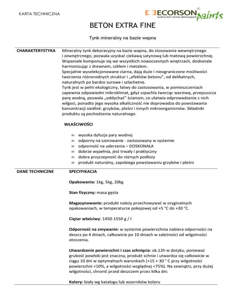 KARTA TECHNICZNA BETON EXTRA FINE Tynk mineralny na bazie wapna CHARAKTERYSTYKA Mineralny tynk dekoracyjny na bazie wapna, do stosowania wewnętrznego i zewnętrznego, pozwala uzyskać ciekawą satynową lub matową powierzchnię. Wspaniale komponuje się we wszystkich nowoczesnych wnętrzach, doskonale harmonizując z drewnem, szkłem i metalem. Specjalnie wyselekcjonowane ziarna, dają duże i nieograniczone możliwości tworzenia różnorodnych struktur i „efektów betonu”, od delikatnych, naturalnych po bardzo surowe i szlachetne. Tynk jest w pełni ekologiczny, łatwy do zastosowania, w pomieszczeniach zapewnia odpowiedni mikroklimat, gdyż szpachla tworząc warstwę, przepuszcza parę wodną, pozwala „oddychać” ścianom, co ułatwia odprowadzenie z nich wilgoci, ponadto jego wysoka alkaliczność nie doprowadza do powstawania koncentracji siedlisk: grzybów, pleśni i innych mikroorganizmów. Składniki produktu są pochodzenia naturalnego. WŁAŚCIWOŚCI • • • • • • DANE TECHNICZNE wysoka dyfuzja pary wodnej odporny na szorowanie - zastosowany w systemie odporność na uderzenia – DOSKONAŁA dobrze wypełnia, jest trwały i praktyczny dobra przyczepność do różnych podłoży produkt naturalny, zapobiega powstawaniu grzybów i pleśni SPECYFIKACJA Opakowania: 1kg, 5kg, 20kg Stan fizyczny: masa gęsta Magazynowanie: produkt należy przechowywać w oryginalnych opakowaniach, w temperaturze pokojowej od +5 °C do +30 °C. Ciężar właściwy: 1450-1550 g / l Odporność na zmywanie: w systemie powierzchnia nabiera odporności na deszcz po 4 dniach, całkowicie po 10 dniach w zależności od wilgotności otoczenia. Utwardzenie powierzchni i czas schnięcia: ok.12h w dotyku, ponieważ grubość powłoki jest znaczna, produkt schnie i utwardza się całkowicie w ciągu 10 dni w optymalnych warunkach (+15 + 30 ° C przy wilgotności powierzchni <10%, a wilgotności względnej <75%). Na zewnątrz, przy dużej wilgotności, chronić przed deszczem przez kilka dni. Kolory: biały wg katalogu lub wzorników koloru KARTA TECHNICZNA BETON EXTRA FINE Tynk mineralny na bazie wapna Daną pracę należy wykonywać i zakończyć z jednej partii produktu, o tym samym nr seryjnym, ponieważ mogą występować niewielkie różnice w bazie, mające minimalny wpływ na kolor końcowy. Receptura i cały proces tworzenia produktu jest formułowany tak, aby nie miał on wpływu na środowisko, stosujemy duże ograniczenie emisji zanieczyszczeń, motywacją do takiego działania jest zachowanie dobrego samopoczucia i zapewnienie bezpieczeństwa poszczególnym użytkownikom, także tym, którzy żyją w środowisku naturalnym PRODUKT POSIADA ATEST PZH ZASTOSOWANIE - odnowa starych budynków, tam gdzie stosowany jest system osuszania, - prace konserwatorskie, restauratorskie, prace polegające na wygładzaniu tynku i starej farby, - nowo budowane domy, spełniające kryteria - „Ekologicznego, Zielonego Budownictwa”, - ze względu na swoją odporność na uderzenia, otarcia i łatwą zmywalność, polecany wszędzie tam gdzie występują miejsca narażone tj. hole, przedpokoje, jadalnie, kuchnie, salony, kominki, garaże oraz w domach gdzie mamy małe dzieci, a także zwierzęta, - ze względu na dużą zdolność dyfuzji: kuchnie, łazienki, pralnie, kotłownie, suszarnie, restauracje, bary…etc. - polecany do stosowania na tynkach opartych na różnych podłożach, takich jak tynki o zmiennym składzie (cement, wapno, mieszanka), beton i cement, płyt gipsowo-kartonowych, - polecamy do stosowania zarówno w miejscach użyteczności publicznej (hotele, sklepy, restauracje, itp.), we wszystkich miejscach prestiżowych, - wnętrzach prywatnych, ściany, zabudowy z karton-gipsu, bonie, sufity ukośne i proste, tam gdzie chcemy stworzyć odpowiedni klimat UWAGA! W przypadku stosowania na zewnątrz: - bezpośrednio na tynk cementowo-wapienny należy położyć warstwę izolującą siatka + klej!, - nałożyć warstwę ochronną/zabezpieczającą produktem – SILOMUR w ilości 3-4 m2/l. NARZĘDZIA: paca inox, paca ROZCIEŃCZANIE: tynk gotowy do użycia w razie potrzeby rozcieńczyć wodą. WYDAJNOŚĆ: ok. 0,6kg/ m2 – na warstwę KARTA TECHNICZNA BETON EXTRA FINE Tynk mineralny na bazie wapna TEMPERATURA NAKŁADANIA: +5°C do +30°C . Należy zadbać o to, by podczas nakładania tynku/również na świeżo nałożony tynk nie padały bezpośrednio promienie słoneczne. Wilgotność nie powinna przekraczać 75%. ILOŚĆ WARSTW: jedna lub dwie warstwy OGÓLNE ZASADY APLIKACJI Podłoża powinny być : stabilne, suche, dobrze oczyszczone i odtłuszczone. Uzyskany efekt końcowy zależy od umiejętności Aplikatora, zastosowanego narzędzia pracy i od ilości nakładanego produktu. Z tego powodu próbki są jedynie orientacyjne i poglądowe. Przed wykonaniem rzeczywistej pracy, należy wykonać próby na panelu demonstracyjnym. W celu uzyskania równej i jednolitej powierzchni na danej płaszczyźnie, praca powinna być wykonywana przez jednego Wykonawcę i przy użyciu tych samych narzędzi oraz krótkiego czasu nakładania /bez przerwy, przy jednej warstwie tak, aby zapewnić ciągle mokre pokrycie całej ściany. Należy przestrzegać parametrów z kart: technicznej, nakładania i bezpieczeństwa. Narzędzia należy natychmiast umyć wodą po użyciu. Produkt możemy nanosić na różne tynki, zarówno na powierzchnie gładkie jak i strukturalne, nowe lub wcześniej malowane. Każdą powierzchnię należy najpierw odpowiednio przygotować: oczyścić , odgrzybić, osuszyć, odtłuścić i usunąć wszelkie łuszczące się resztki farb i innych zbędnych produktów oraz substancji organicznych, ubytki należy uzupełnić. UWAGI Instrukcja do wykonywania pracy w profesjonalny sposób, opiera się na przestrzeganiu podstawowych zasad aplikacji , zasad higieny i bezpieczeństwa pracy oraz wytycznych ujętych w: kartach technicznych, kartach systemu nakładania, kartach bezpieczeństwa, d