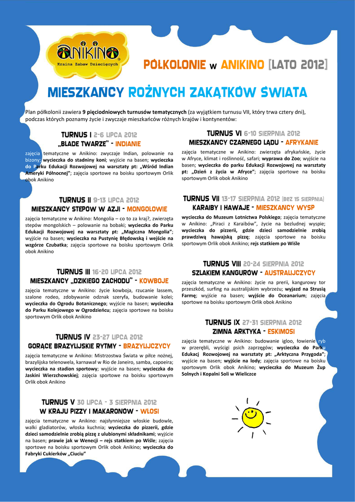 PÓŁKOLONIE W ANIKINO [LATO 2012] MIESZKAŃCY RÓŻNYCH ZAKĄTKÓW ŚWIATA Plan półkolonii zawiera 9 pięciodniowych turnusów tematycznych (za wyjątkiem turnusu VII, który trwa cztery dni), podczas których poznamy życie i zwyczaje mieszkańców różnych krajów i kontynentów: „BLADE TWARZE” - INDIANIE TURNUS VI 6-10 SIERPNIA 2012 MIESZKAŃCY CZARNEGO LĄDU - AFRYKANIE zajęcia tematyczne w Anikino: zwyczaje Indian, polowanie na bizony; wycieczka do stadniny koni; wyjście na basen; wycieczka do Parku Edukacji Rozwojowej na warsztaty pt: „Wśród Indian Ameryki Północnej”; zajęcia sportowe na boisku sportowym Orlik obok Anikino zajęcia tematyczne w Anikino: zwierzęta afrykańskie, życie w Afryce, klimat i roślinność, safari; wyprawa do Zoo; wyjście na basen; wycieczka do parku Edukacji Rozwojowej na warsztaty pt: „Dzień z życia w Afryce”; zajęcia sportowe na boisku sportowym Orlik obok Anikino TURNUS I 2-6 LIPCA 2012 TURNUS II 9-13 LIPCA 2012 TURNUS VII 13-17 SIERPNIA 2012 (bez 15 SIERPNIA) MIESZKAŃCY STEPÓW W AZJI - MONGOŁOWIE KARAIBY I HAWAJE - MIESZKAŃCY WYSP zajęcia tematyczne w Anikino: Mongolia – co to za kraj?, zwierzęta stepów mongolskich – polowanie na bobaki; wycieczka do Parku Edukacji Rozwojowej na warsztaty pt: „Magiczna Mongolia”; wyjście na basen; wycieczka na Pustynię Błędowską i wejście na wzgórze Czubatka; zajęcia sportowe na boisku sportowym Orlik obok Anikino wycieczka do Muzeum Lotnictwa Polskiego; zajęcia tematyczne w Anikino: „Piraci z Karaibów”, życie na bezludnej wyspie; wycieczka do pizzerii, gdzie dzieci samodzielnie zrobią prawdziwą hawajską pizzę; zajęcia sportowe na boisku sportowym Orlik obok Anikino; rejs statkiem po Wiśle TURNUS VIII 20-24 SIERPNIA 2012 TURNUS III 16-20 LIPCA 2012 MIESZKAŃCY „DZIKIEGO ZACHODU” - KOWBOJE zajęcia tematyczne w Anikino: życie kowboja, rzucanie lassem, szalone rodeo, zdobywanie odznak szeryfa, budowanie kolei; wycieczka do Ogrodu Botanicznego; wyjście na basen; wycieczka do Parku Kolejowego w Ogrodzieńcu; zajęcia sportowe na boisku sportowym Orlik obok Anikino TURNUS IV 23-27 LIPCA 2012 GORĄCE BRAZYLIJSKIE RYTMY - BRAZYLIJCZYCY zajęcia tematyczne w Anikino: Mistrzostwa Świata w piłce nożnej, brazylijska telenowela, karnawał w Rio de Janeiro, samba, capoeira; wycieczka na stadion sportowy; wyjście na basen; wycieczka do Jaskini Wierzchowskiej; zajęcia sportowe na boisku sportowym Orlik obok Anikino TURNUS V 30 LIPCA - 3 SIERPNIA 2012 W KRAJU PIZZY I MAKARONÓW - WŁOSI zajęcia tematyczne w Anikino: najsłynniejsze włoskie budowle, walki gladiatorów, włoska kuchnia; wycieczka do pizzerii, gdzie dzieci samodzielnie zrobią pizzę z ulubionymi składnikami; wyjście na basen; prawie jak w Wenecji – rejs statkiem po Wiśle; zajęcia sportowe na boisku sportowym Orlik obok Anikino; wycieczka do Fabryki Cukierków „Ciuciu” SZLAKIEM KANGURÓW - AUSTRALIJCZYCY zajęcia tematyczne w Anikino: życie na prerii, kangurowy tor przeszkód, surfing na australijskim wybrzeżu; wyjazd na Strusią Farmę; wyjście na basen; wyjście do Oceanarium; zajęcia sportowe na boisku sportowym Orlik obok Anikino TURNUS IX 27-31 SIERPNIA 2012 ZIMNA ARKTYKA - ESKIMOSI zajęcia tematyczne w Anikino: budowanie igloo, łowienie ryb w przerębli, wyścigi psich zaprzęgów; wycieczka do Parku Edukacji Rozwojowej na warsztaty pt: „Arktyczna Przygoda”; wyjście na basen; wyjście na lody; zajęcia sportowe na boisku sportowym Orlik obok Anikino; wycieczka do Muzeum Żup Solnych i Kopalni Soli w Wieliczce