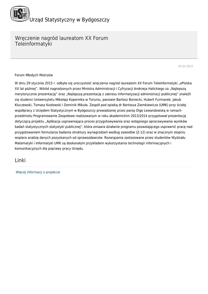Urząd Statystyczny w Bydgoszczy Wręczenie nagród laureatom XX Forum Teleinformatyki 05.02.2015 Forum Młodych Mistrzów W dniu 29 stycznia 2015 r. odbyła się uroczystość wręczenia nagród laureatom XX Forum Teleinformatyki „ePolska XX lat później”. Wśród nagrodzonych przez Ministra Administracji i Cyfryzacji Andrzeja Halickiego za „Najlepszą merytorycznie prezentację” oraz „Najlepszą prezentację z zakresu informatyzacji administracji publicznej” znaleźli się studenci Uniwersytetu Mikołaja Kopernika w Toruniu, panowie Bartosz Boniecki, Hubert Furmanek, Jakub Kluczewski, Tomasz Kozłowski i Dominik Mikuła. Zespół pod opieką dr Bartosza Ziemkiewicza (UMK) przy ścisłej współpracy z Urzędem Statystycznym w Bydgoszczy prowadzonej przez panią Olgę Lewandowską w ramach przedmiotu Programowanie Zespołowe realizowanym w roku akademickim 2013/2014 przygotował prezentację dotyczącą projektu „Aplikacja usprawniająca proces przygotowywania oraz wstępnego opracowywania wyników badań statystycznych statystyki publicznej”, która omawia działanie programu pozwalającego usprawnić pracę nad przygotowaniem formularza badania struktury wynagrodzeń według zawodów (Z-12) oraz w znacznym stopniu wspiera analizę danych pozyskanych od sprawozdawców. Rozwiązania zastosowane przez studentów Wydziału Matematyki i Informatyki UMK są doskonałym przykładem wykorzystania technologii informacyjnych i komunikacyjnych dla poprawy pracy Urzędu. Linki Więcej informacji o projekcie