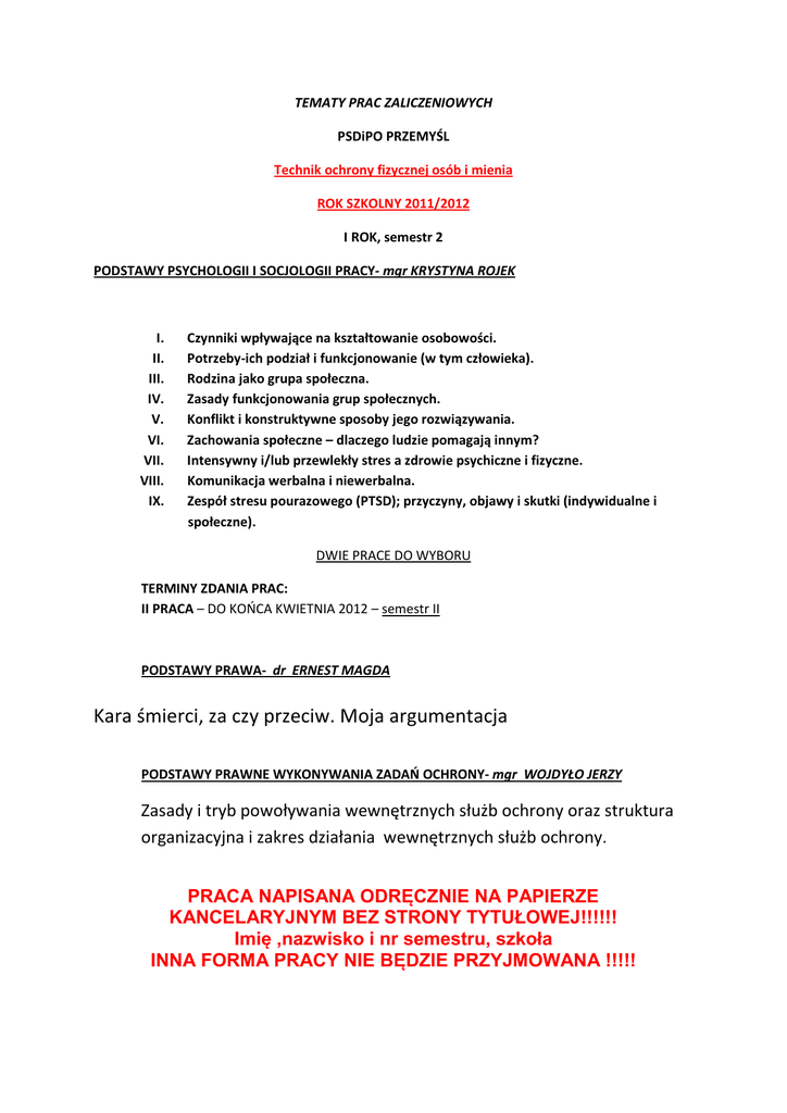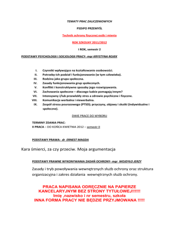 TEMATY PRAC ZALICZENIOWYCH PSDiPO PRZEMYŚL Technik ochrony fizycznej osób i mienia ROK SZKOLNY 2011/2012 I ROK, semestr 2 PODSTAWY PSYCHOLOGII I SOCJOLOGII PRACY- mgr KRYSTYNA ROJEK I. II. III. IV. V. VI. VII. VIII. IX. Czynniki wpływające na kształtowanie osobowości. Potrzeby-ich podział i funkcjonowanie (w tym człowieka). Rodzina jako grupa społeczna. Zasady funkcjonowania grup społecznych. Konflikt i konstruktywne sposoby jego rozwiązywania. Zachowania społeczne – dlaczego ludzie pomagają innym? Intensywny i/lub przewlekły stres a zdrowie psychiczne i fizyczne. Komunikacja werbalna i niewerbalna. Zespół stresu pourazowego (PTSD); przyczyny, objawy i skutki (indywidualne i społeczne). DWIE PRACE DO WYBORU TERMINY ZDANIA PRAC: II PRACA – DO KOŃCA KWIETNIA 2012 – semestr II PODSTAWY PRAWA- dr ERNEST MAGDA Kara śmierci, za czy przeciw. Moja argumentacja PODSTAWY PRAWNE WYKONYWANIA ZADAŃ OCHRONY- mgr WOJDYŁO JERZY Zasady i tryb powoływania wewnętrznych służb ochrony oraz struktura organizacyjna i zakres działania wewnętrznych służb ochrony. PRACA NAPISANA ODRĘCZNIE NA PAPIERZE KANCELARYJNYM BEZ STRONY TYTUŁOWEJ!!!!!! Imię ,nazwisko i nr semestru, szkoła INNA FORMA PRACY NIE BĘDZIE PRZYJMOWANA !!!!! OCHRNA OBIEKTÓW I TECHNICZNE ŚRODKI ZABEZPIECENIA OSÓB I MIENIA – mgr WOJDYŁO JERZY 1. Zadania pracowników ochrony w związku z kontrolą ruchu osobowomateriałowego oraz dokumenty uprawniające do wstępu do chronionego obiektu i wwozu lub wywozu materiałów OCHRONA IMPREZ MASOWYCH- mgr MARIUSZ KUNAT Uprawnienia i obowiązki członków służby porządkowej w związku z: - stwierdzeniem prawa osoby do przebywania na imprezie masowej - przeglądaniem odzieży i bagażu -usunięciem z miejsca przeprowadzania imprezy masowej osoby, która zakłóca przebieg tej imprezy, - dokumentowaniem przebiegu czynności usunięcia, WYBRANE ZAGADNIENIA Z KRYMINOLOGII I KRYMINALISTYKImgr MARIUSZ KUNAT Pojęcie, istota, zadania i zakres kryminalistyki. Postępowanie po uzyskaniu informacji o przestępstwie do czasu przybycia Policji. Zabezpieczenie miejsca zdarzenia będącego wynikiem przestępczego działania. ORGANIZACJA OCHRONY OSÓB I MIENIA- mgr MARIUSZ KUNAT Nadzór i kontrola nad zadaniami wykonywanymi przez pracowników ochrony, zasady współpracy SUFO z Policją i innymi formacjami instytucjonalnego systemu ochrony osób i mienia w zakresie ochrony osób i mienia oraz przeciwdziałania przestępczości. PRACA NAPISANA ODRĘCZNIE NA PAPIERZE KANCELARYJNYM BEZ STRONY TYTUŁOWEJ!!!!!! Imię ,nazwisko i nr semestru, szkoła INNA FORMA PRACY NIE BĘDZIE PRZYJMOWANA !!!!! RATOWNICTWO - mgr MARIUSZ CYRAN I. II. Zasady postępowania w przypadku powstania pożaru. Zasady prowadzenia ewakuacji. Rodzaje podręcznego sprzętu gaśniczego. Zasady i sposoby jego użycia. III. Grupy pożarów oraz środki do ich gaszenia. IV. Środki gaśnicze oraz przykłady substancji (ciał), które możemy nimi gasić. V. VI. Organizacja ochrony przeciwpożarowej w zakładzie pracy. Zadania właściciela/zarządcy obiektu w zakresie ochrony przeciwpożarowej. JEDNA PRACA DO WYBORU ETYKA ZAWODOWA- mgr ZBIGNIEW MATEUSZÓW 1. Wyjaśnij różnicę między informacją jawną, a niejawną. Co to jest tajemnica. Omów jej potrzebę zachowywania oraz granicę lojalności. 2. Na czym ma polegać rzetelnie wykonana praca pracownika ochrony, detektywa – podaj przykłady pozytywne i negatywne z wyjaśnienie, dlaczego tak uważasz. 3. Wygląd zewnętrzny – na czym polega dbałość o swój strój? Czy jest potrzebna pracownikowi ochrony, detektywowi? 4. Ubiór pracownika ochrony, detektywa – wyjaśnij przydatność lub zbędność poszczególnych elementów ubioru. 5. Z czym jest związana kultura języka w codziennym życiu i czy jest niezbędna dla pracownika ochrony i detektywa? 6. Mój związek z zakładem pracy. Kształtowanie opinii o swojej pracy, o swoim zakładzie. 7. Prawidłowe wykonywanie poszczególnych obowiązków pracownika ochrony i detektywa – omówić kolejność i wagę poszczególnych zadań. 8. Co jest dobre, a co złe w pracy pracownika ochrony i detektywa. 9. Omówić umiejętności praktyczne niezbędne w pracy pracownika ochrony i detektywa. 10. Sprzęt techniczny niezbędny i przydatny (podział, znaczenie) dla pracownika ochrony i detektywa. 11. Nakaz, zakaz, rozkaz, niesubordynacja, wola przełożonego – a może lepiej prośba. Omówić znaczenie oraz wady i zalety poszczególnych określeń. 12. Wzór osoby – idol, autorytet. Czy bohater filmów akcji może zostać autorytetem dla pracownika ochrony i detektywa. 13. Pozytywne i negatywne ocenianie innej osoby. Samoocena. 14. Wyrażanie swoich emocji – czy zawsze możemy, czy powinniśmy panować nad swoimi emocjami i dlaczego? 15. Sankcje karne, sankcje moralne, sumienie – co jest ważniejsze dla pracownika ochrony i detektywa 16. Współpraca, braterstwo, bezinteresowność, solidarność – jakie cechy są potrzebne pracownikowi ochrony i detektywowi; dlaczego, wyjaśnij. 17. Na czym polega tchórzostwo – odwaga, wrażliwość na krzywdę – a stosowanie środków przymusu bezpośredniego; omówić zagadnienia. 18. Czy pracownik ochrony i detektyw zawsze powinien zachować się godnie, zgodnie z zasadami ogólnie przyjętymi za pozytywne. Czy powinien przejmować się opinią publiczną i dlaczego. 19. Wolność, wolna wola – swawola, anarchia. Wyjaśnij różnice i podobieństwa. 20. Stopnie zagrożenia pracy pracownika ochrony i detektywa – możliwe zachowania, reakcje na zaistniałą sytuację konfliktową. 21. Co to jest profesjonalizm i czym się objawia w pracy pracownika ochrony i detektywa. 22. Pokusa ( bo mi brakuje, a właściciel ma i tak dużo), przyjęcie korzyści majątkowej, uczciwość (bo nikt nie widzi), bezinteresowność – przykład najwyższego dobra i jak je okazać? 23. Refleks, szybka decyzja i jej konsekwencja, opanowanie, brak skrupułów – czy są potrzebne 