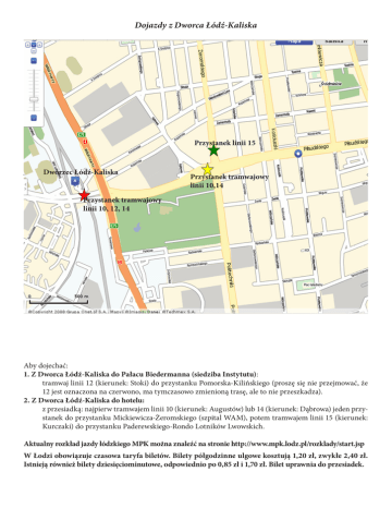 Dojazdy z Dworca Łódź-Kaliska Przystanek linii 15 Dworzec Łódź-Kaliska Przystanek tramwajowy linii 10,14 Przystanek tramwajowy linii 10, 12, 14 Aby dojechać: 1. Z Dworca Łódź-Kaliska do Pałacu Biedermanna (siedziba Instytutu): tramwaj linii 12 (kierunek: Stoki) do przystanku Pomorska-Kilińskiego (proszę się nie przejmować, że 12 jest oznaczona na czerwono, ma tymczasowo zmienioną trasę, ale to nie przeszkadza). 2. Z Dworca Łódź-Kaliska do hotelu: z przesiadką: najpierw tramwajem linii 10 (kierunek: Augustów) lub 14 (kierunek: Dąbrowa) jeden przystanek do przystanku Mickiewicza-Żeromskiego (szpital WAM), potem tramwajem linii 15 (kierunek: Kurczaki) do przystanku Paderewskiego-Rondo Lotników Lwowskich. Aktualny rozkład jazdy łódzkiego MPK można znaleźć na stronie http://www.mpk.lodz.pl/rozklady/start.jsp W Łodzi obowiązuje czasowa taryfa biletów. Bilety półgodzinne ulgowe kosztują 1,20 zł, zwykłe 2,40 zł. Istnieją również bilety dziesięciominutowe, odpowiednio po 0,85 zł i 1,70 zł. Bilet uprawnia do przesiadek. Dojście od przystanku tramwajowego do Pałacu Biedermanna Pałac Biedermanna Przystanek linii 15 Przystanek linii 15 Z powodu remontu odcinka ulicy Kilińskiego jest konieczne dojście od ulicy Pomorskiej do Północnej. Adres Instytutu Teorii Literatury, Teatru i Sztuk Audiowizualnych to Franciszkańska 1/5, ale wejście znajduje się od strony ulicy Północnej. Dojście z/do przystanku tramwajowego do Pokoi Gościnnych „Alicja” Przystanki tramwajowe linii 15 Pokoje gościnne „Alicja” Pokoje Gościnne „Alicja” znajdują się przy ulicy Paderewskiego 13.