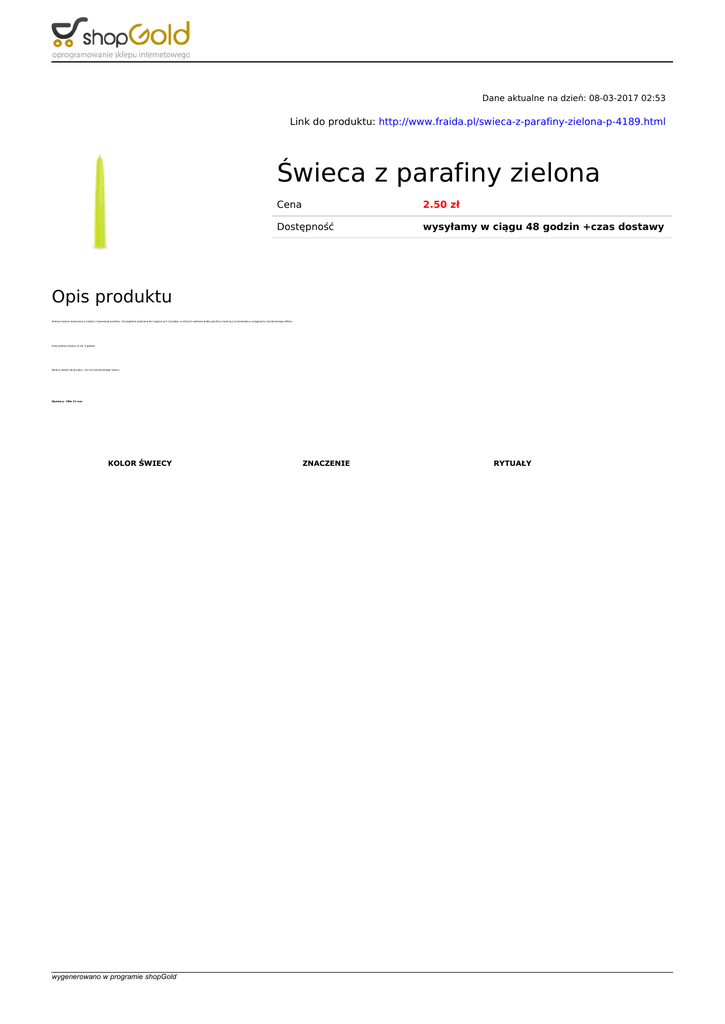 Dane aktualne na dzień: 08-03-2017 02:53 Link do produktu: http://www.fraida.pl/swieca-z-parafiny-zielona-p-4189.html Świeca z parafiny zielona Cena 2.50 zł Dostępność wysyłamy w ciągu 48 godzin +czas dostawy Opis produktu Zielona świeca wykonana w całości z barwionej parafiny. Szczególnie polecana do magicznych rytuałów, w których nadmiar białej parafiny może być przeszkodą w osiągnieciu zamierzonego efektu. Czas palenia świecy to ok. 5 godzin. Świeca zwęża się do góry, nie ma zaznaczonego szpicu. Wymiary: 180x 21 mm KOLOR ŚWIECY ZNACZENIE RYTUAŁY Zielony Ukojenie, spokój, zamożność, płodność, odmłodzenie, ochrona relacji, ludzi i miejsc, powodzenie, dobrobyt sprawność fizyczna, zdrowie. Rytuały płodności, bogactwa, relacji, ochrony, uzdrowienia: przeziębienia, czyraki, nowotwory, bóle głowy, nadciśnienie, wrzody, dolegliwości nerek, nerwice. wygenerowano w programie shopGold Powered by TCPDF (www.tcpdf.org)