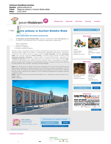 Centrum Handlowe Auchan Gazeta: jestemrodzicem.pl Tytu³: Magiczne pokazy w Auchan BielskoBia³a Data: 23.01.2014 Wydarzenia Wywiady Magiczne pokazy w Auchan Bielsko-Biała Tweet Recenzje Artykuły Kontakt __wyszukaj w serwisie__ Dodano: 23 stycznia 2014r. Tagi: Auchan, Bielsko-Biała, ferie ziomwe, karnawał, lego Recenzje Centrum Handlowe Auchan Bielsko-Biała zaprasza najmłodszych 25 i 26 stycznia na stylu. W programie organizatorzy zaplanowali: 0 wspólne atrakcje w karnawałowym • pokazy iluzjonistów, • zabawy plastyczne, • konkursy z nagrodami • bezpłatny spektakl teatralny Podczas sześciu niezwykłych pokazów maluchy poznają fascynujący świat magii. W przerwach natomiast będą mogły w z ią ć udział w r óżnorodnych zabawach plastycznych. Pod okiem animatorów mali plastycy stworzą bogato zdobione maski weneckie, ozdobią ceramiczne kubki oraz stworzą oryginalne wzory tatuaży. Uczestnicy zaję ć poznają również sztukę tworzenia zwierząt z balonów i w e z mą udział w licznych konkursach z nagrodami. W niedzielę 26 stycznia maluchy będą mogły bawić się uwielbianymi przez dzieci klockami Lego, a podczas zaję ć plastycznych wspólnie stworzą ogromną matę z karnawałowymi motywami. Główną atrakcją będzie wyjątkowe przedstawienie teatralne, podczas którego mali widzowie poznają zabawne losy znanego i lubianego Koziołka Matołka. Wybór "Nie pogardzaj odpowiedniej zabawki dla dziecka, to w dzis... drugim człowiekiem, dopóki nie ... CZYTAJ WIĘCEJ > Wywiady Kiedy: 25 i 26 stycznia. W sobotę 25 stycznia co godzinę od 11:30 do 16:30 rozpoczynać się będą pokazy iluzjonistów. Zajęcia plastyczne oraz konkursy potrwają od godziny 11.00 do godziny 18.00. W niedzielę 26 stycznia kącik Lego czynny będzie od 11.00 do 18.00. Wspólne tworzenie maty rozpocznie się o godzinie 13.00, natomiast przedstawienie odegrane zostanie o godzinie 16.00. Gdzie: Centrum Handlowe Auchan Bielsko-Biała przy Al. Bohaterów Monte Cassino 421, Bielsko -Biała Cena: Bezpłatnie Słuchając utworów muzycznych wokalisty zespołu... Specjalnie dla czytelników serwisu JestemRodzicem... CZYTAJ WIĘCEJ > ___Podaj e-mail___ ZAPISZ! Patronaty POKAŻ W IĘCEJ > Autor: Redakcja Poinformujemy Cię o kolejnych treściach. JestemRodzicem.pl Serwis dla rodziców, ___Podaj e-mail___ ZAPISZ! wydarzenia, wywiady, recenzje Poinformuj nas o ciekawym artykule! | + < Zaszyfrowana zabawa karnawałowa Partnerzy serwisu: Centrum Handlowe Auchan Gazeta: jestemrodzicem.pl Tytu³: Magiczne pokazy w Auchan BielskoBia³a Data: 23.01.2014