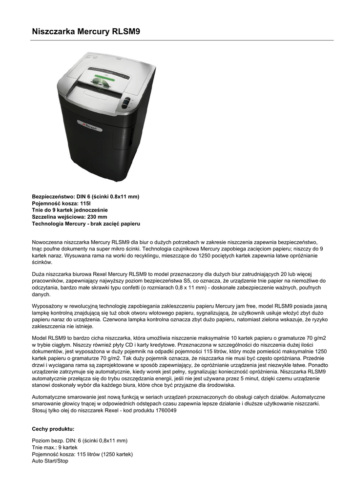 Niszczarka Mercury RLSM9 Bezpieczeństwo: DIN 6 (ścinki 0.8x11 mm) Pojemność kosza: 115l Tnie do 9 kartek jednocześnie Szczelina wejściowa: 230 mm Technologia Mercury - brak zacięć papieru Nowoczesna niszczarka Mercury RLSM9 dla biur o dużych potrzebach w zakresie niszczenia zapewnia bezpieczeństwo, tnąc poufne dokumenty na super mikro ścinki. Technologia czujnikowa Mercury zapobiega zacięciom papieru; niszczy do 9 kartek naraz. Wysuwana rama na worki do recyklingu, mieszczące do 1250 pociętych kartek zapewnia łatwe opróżnianie ścinków. Duża niszczarka biurowa Rexel Mercury RLSM9 to model przeznaczony dla dużych biur zatrudniających 20 lub więcej pracowników, zapewniający najwyższy poziom bezpieczeństwa S5, co oznacza, że urządzenie tnie papier na niemożliwe do odczytania, bardzo małe skrawki typu confetti (o rozmiarach 0,8 x 11 mm) - doskonałe zabezpieczenie ważnych, poufnych danych. Wyposażony w rewolucyjną technologię zapobiegania zakleszczeniu papieru Mercury jam free, model RLSM9 posiada jasną lampkę kontrolną znajdującą się tuż obok otworu wlotowego papieru, sygnalizującą, że użytkownik usiłuje włożyć zbyt dużo papieru naraz do urządzenia. Czerwona lampka kontrolna oznacza zbyt dużo papieru, natomiast zielona wskazuje, że ryzyko zakleszczenia nie istnieje. Model RLSM9 to bardzo cicha niszczarka, która umożliwia niszczenie maksymalnie 10 kartek papieru o gramaturze 70 g/m2 w trybie ciągłym. Niszczy również płyty CD i karty kredytowe. Przeznaczona w szczególności do niszczenia dużej ilości dokumentów, jest wyposażona w duży pojemnik na odpadki pojemności 115 litrów, który może pomieścić maksymalnie 1250 kartek papieru o gramaturze 70 g/m2. Tak duży pojemnik oznacza, że niszczarka nie musi być często opróżniana. Przednie drzwi i wyciągana rama są zaprojektowane w sposób zapewniający, że opróżnianie urządzenia jest niezwykle łatwe. Ponadto urządzenie zatrzymuje się automatycznie, kiedy worek jest pełny, sygnalizując konieczność opróżnienia. Niszczarka RLSM9 automatycznie przełącza się do trybu oszczędzania energii, jeśli nie jest używana przez 5 minut, dzięki czemu urządzenie stanowi doskonały wybór dla każdego biura, które chce być przyjazne dla środowiska. Automatyczne smarowanie jest nową funkcją w seriach urządzeń przeznaczonych do obsługi całych działów. Automatyczne smarowanie głowicy tnącej w odpowiednich odstępach czasu zapewnia lepsze działanie i dłuższe użytkowanie niszczarki. Stosuj tylko olej do niszczarek Rexel - kod produktu 1760049 Cechy produktu: Poziom bezp. DIN: 6 (ścinki 0,8x11 mm) Tnie max.: 9 kartek Pojemność kosza: 115 litrów (1250 kartek) Auto Start/Stop Technologia Mercury - brak zacięć papieru Zabezpieczenie przed przegrzaniem Automatyczne wyłączenie przy zdjętej głowicy Szczelina wejściowa 260 mm Cięcie: CD, papier, karty kredytowe, zszywki, spinacze, laminowane dokumenty, folie do rzutników Cofanie papieru Cicha, tylko 55 dB Gwarancja 2 lata / 20 na noże