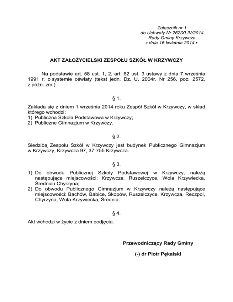 Załącznik nr 1 do Uchwały Nr 262/XLIV/2014 Rady Gminy Krzywcza z dnia 16 kwietnia 2014 r. AKT ZAŁOŻYCIELSKI ZESPOŁU SZKÓŁ W KRZYWCZY Na podstawie art. 58 ust. 1, 2, art. 62 ust. 3 ustawy z dnia 7 września 1991 r. o systemie oświaty (tekst jedn. Dz. U. 2004r. Nr 256, poz. 2572, z późn. zm.) § 1. Zakłada się z dniem 1 września 2014 roku Zespół Szkół w Krzywczy, w skład którego wchodzi: 1) Publiczna Szkoła Podstawowa w Krzywczy; 2) Publiczne Gimnazjum w Krzywczy. § 2. Siedzibą Zespołu Szkół w Krzywczy jest budynek Publicznego Gimnazjum w Krzywczy, Krzywcza 97, 37-755 Krzywcza. § 3. 1) Do obwodu Publicznej Szkoły Podstawowej w Krzywczy, należą następujące miejscowości: Krzywcza, Ruszelczyce, Wola Krzywiecka, Średnia i Chyrzyna; 2) Do obwodu Publicznego Gimnazjum w Krzywczy należą następujące miejscowości: Bachów, Babice, Skopów, Ruszelczyce, Krzywcza, Reczpol, Chyrzyna, Wola Krzywiecka, Średnia. § 4. Akt wchodzi w życie z dniem podjęcia. Przewodniczący Rady Gminy (-) dr Piotr Pękalski