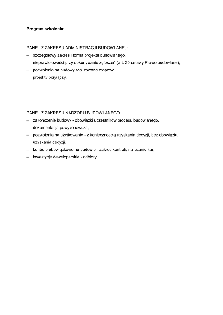 Program szkolenia: PANEL Z ZAKRESU ADMINISTRACJI BUDOWLANEJ: szczegółowy zakres i forma projektu budowlanego, nieprawidłowości przy dokonywaniu zgłoszeń (art. 30 ustawy Prawo budowlane), pozwolenia na budowy realizowane etapowo, projekty przyłączy. PANEL Z ZAKRESU NADZORU BUDOWLANEGO zakończenie budowy - obowiązki uczestników procesu budowlanego, dokumentacja powykonawcza, pozwolenia na użytkowanie - z koniecznością uzyskania decyzji, bez obowiązku uzyskania decyzji, kontrole obowiązkowe na budowie - zakres kontroli, naliczanie kar, inwestycje deweloperskie - odbiory.