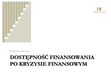 Podstawowe tezy DOSTĘPNOŚĆ FINANSOWANIA PO KRYZYSIE FINANSOWYM Polityka kredytowa banków – kredyty mieszkaniowe dla gospodarstw domowych W I kwartale 2011 roku banki znacznie ograniczyły skalę zaostrzeń kryteriów kredytowania gospodarstw domowych ¼ ogółu banków zliberalizowała politykę kredytowania zarówno w segmencie kredytów mieszkaniowych jak i konsumpcyjnych (w I kwartale 2011 roku liczna czynnych umów o kredyt mieszkaniowy wzrosła do wysokości 1 506 686 sztuk tj. o niemal 4% w stosunku do końca roku 2010 Według ankiety przeprowadzonej przez NBP po I kwartale 2011, aż 80% banków zdecydowało się po raz kolejny obniżyć marżę pobieraną na kredytach mieszkaniowych W mniejszym stopniu obniżki dotyczyły także poziomu marż pobieranych na kredytach obciążonych wyższym ryzykiem oraz pozaodsetkowych kosztów kredytów Zaledwie 20% banków złagodziło nieznacznie warunki pod względem minimalnego wkładu własnego Stan zadłużenia gospodarstw domowych w segmencie kredytów mieszkaniowych w okresie grudzień 2009 do maja 2011 zwiększył się o 29% do poziomu 281 mld PLN. Największy udział we wzroście odnotowano dla kredytów złotowych +42%, natomiast kredyty walutowe +22% Polityka kredytowa banków – kredyty konsumpcyjne dla gospodarstw domowych Według danych NBP w I kwartale 2011 po raz pierwszy od II kwartału 2008 nie doszło do wyraźnego zaostrzenia kryteriów udzielania kredytów konsumpcyjnych dla gospodarstwa domowych. Ponad połowa banków nie zmieniła polityki kredytowej, a około 20 – 25% ogółu banków dokonało jej zliberalizowania bądź zaostrzenia. Bilansowo doszło do nieznacznego, 4 – procentowego zaostrzenia polityki netto Do nieznacznego poluzowania doszło w obrębie maksymalnego okresu kredytowania i marży kredytowej. Banki zwiększyły natomiast nieznacznie marże na kredytach o wyższym ryzyku Za główną przyczynę zaostrzenia polityki w segmencie kredytów konsumpcyjnych uznaje się Rekomendację T Czynnikami skłaniającymi niektóre banki do liberalizacji przepisów była zwiększająca się ilość zagrożonych kredytów konsumpcyjnych i zmiana popytu na kredyty – blisko 27% banków w ujęciu netto odnotowało spadek popytu na kredyty konsumpcyjne ze strony gospodarstw domowych W ujęciu ilościowym stan zadłużenia gospodarstw domowych spadł o 1% z 132.2 mld PLN do 130.5 mld PLN w maju 2011 Polityka kredytowa banków 1/2 – kredyty dla przedsiębiorstw W I kwartale 2011 jedna trzecia banków zliberalizowała politykę kredytową w segmencie kredytów długoterminowych dla sektora MSP Banki kontynuowały w I kwartale 2011 roku obniżkę marż na kredytach udzielanych spółkom. Liczba takich banków zmalała jednakże w porównaniu do poprzednich kwartałów Znaczna ilość banków deklaruje zwiększanie maksymalnej kwoty kredytu lub linii kredytowej Najważniejszą przyczyną łagodzenia polityki kredytowej był wzrost presji konkurencyjnej Po raz pierwszy od I kwartału 2008 roku banki uznały zmiany jakości portfela kredytów dla przedsiębiorstw za czynnik skłaniający do łagodzenia polityki kredytowej Zmniejszył się natomiast odsetek banków tłumaczących złagodzenie polityki kredytowej wobec przedsiębiorstw niższym ryzykiem związanym z przewidywaną sytuacją gospodarczą Według danych NBP w I kwartale 2011 roku banki odnotowały wzrost popytu na wszystkie rodzaje kredytów dla przedsiębiorstw Największy odsetek banków wskazał na wzrost zainteresowania sektora MSP Polityka kredytowa banków 2/2 – kredyty dla przedsiębiorstw W I kwartale 2009 roku stan zadłużenia przedsiębiorstw z tytułu kredytów operacyjnych i na nieruchomości wynosił odpowiednio 109.5 mld PLN i 50.7 mld PLN. W maju 2011 wartości te spadły do poziomu odpowiednio 99.3 mld PLN (-9.3%) oraz do 44.2 mld PLN (-12.8%) Nominalna wartość zadłużenia kredytowego polskich firm obniżyła się w 2010 r. w porównaniu do 2009 o 1.9 mld PLN. W roku 2009 spadek w porównaniu do 2008 roku wyniósł 7.8 mld PLN W 2010 roku względnie poprawiająca się sytuacja przedsiębiorstw oraz stopniowy wzrost wykorzystywania mocy produkcyjnych nie wpłynęła znacząco na zmianę popytu na kredyty dla przedsiębiorców Na spadek zadłużenia polskich firm istotny wpływ miał spadek kredytów o charakterze bieżącym oraz kredytów długoterminowych na zakup nieruchomości. Zadłużenie z tytułu kredytów bieżących uległo obniżeniu w 2010 roku o 2.3 mld PLN (w 2009 roku spadek wyniósł 10.9 mld PLN) W 2010 roku utrzymał się także niski popyt na kredyty długoterminowe na zakup nieruchomości. Zadłużenie polskich spółek z tego tytułu obniżyło się o 2 mld PLN (w 2009 roku wzrosło o 1.8 mld PLN) Wzrost odnotowało z kolei w przypadku długoterminowych kredytów inwestycyjnych wykorzystywanych do finansowania nowych zdolności wytwórczych lub usługowych. Mimo to zasadniczym źródłem finansowania inwestycji pozostały nadal środki własne polskich przedsiębiorstw Polityka inwestycyjna funduszy PE/VC 1/2 – kredyty dla przedsiębiorstw Dane w tysiącach € 2007 Fundusz Venture Capital Private Equity FAZA INWESTYCJI Seed Start - up Later stage venture Growth Rescue/Turnaround Replacement capital Buyout 2008 2009 20010 Wartość inwestycji Ilość spółek Wartość inwestycji Ilość spółek Wartość inwestycji Ilość spółek Wartość inwestycji Ilość spółek 2 483 1 815 35 911 95 375 1 257 1 118 545 560 4 9 17 8 1 1 27 4 003 10 660 35 687 73 515 68 0 509 277 10 20 17 6 1 0 18 1 100 0 484 61 554 6 100 99 411 102 1 1 4 9 1 1 13 0 1 293 13 137 127 742 4 573 16 145 341 590 0 6 5 20 2 3 18 OCENA wzrostu aktywności 2010/2007 -100% - 29% - 63% + 34% + 264% + 1344 - 37% Kryzys finansowy odbił się również negatywnym echem wśród inwestorów private equity Inwestycje w spółki niepubliczne również przestały być oazą spokoju w czasach, gdy większość wycen spółek giełdowych znacznie spadła Rok 2